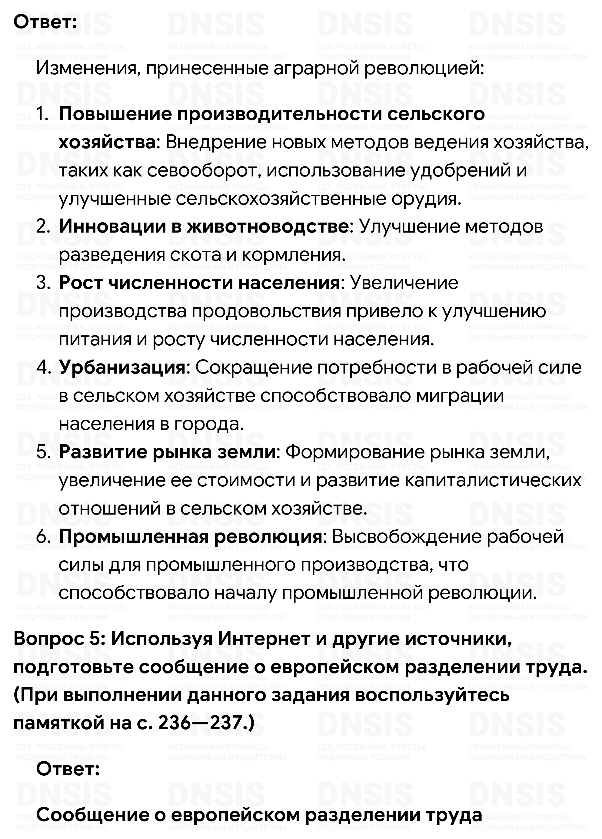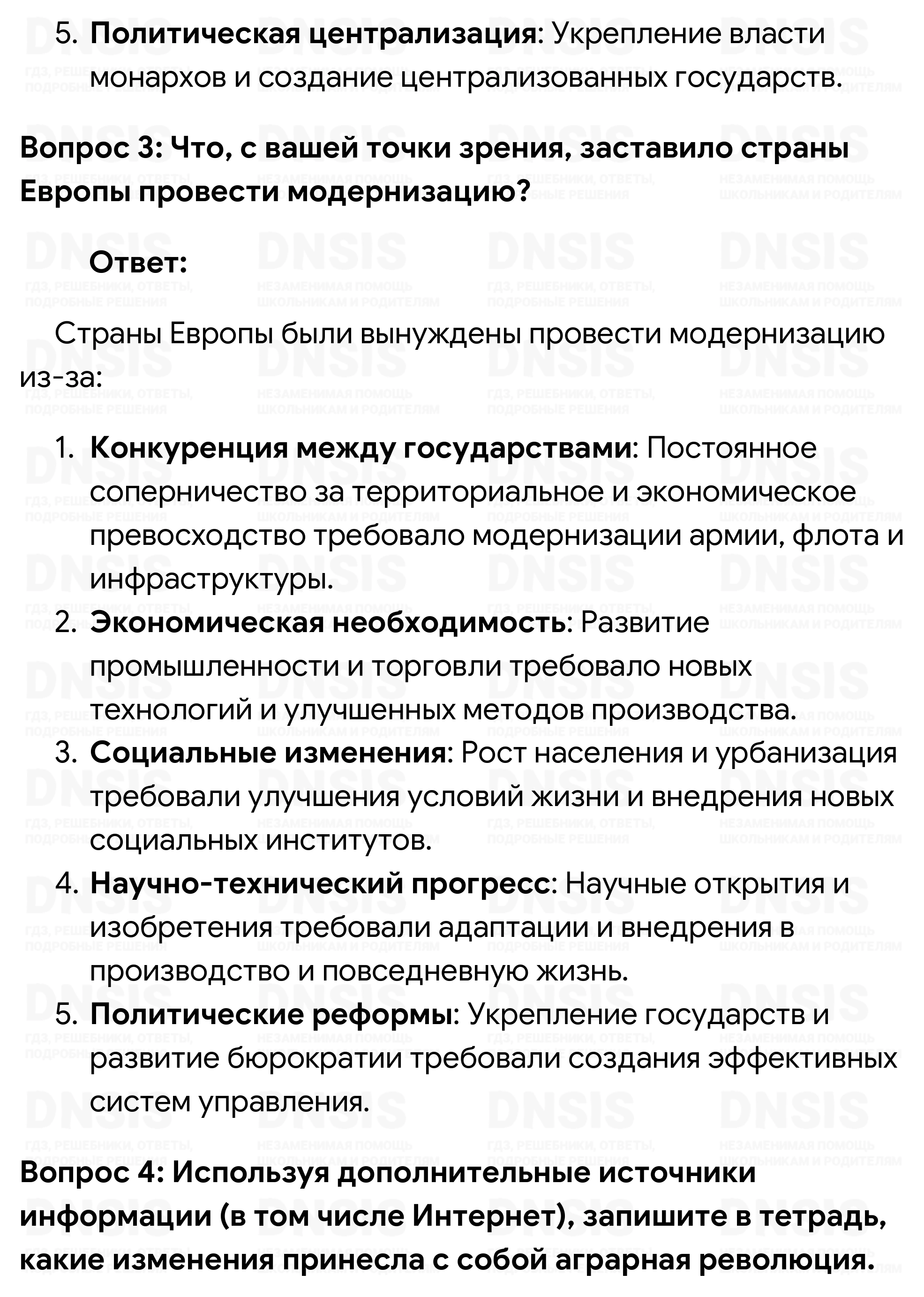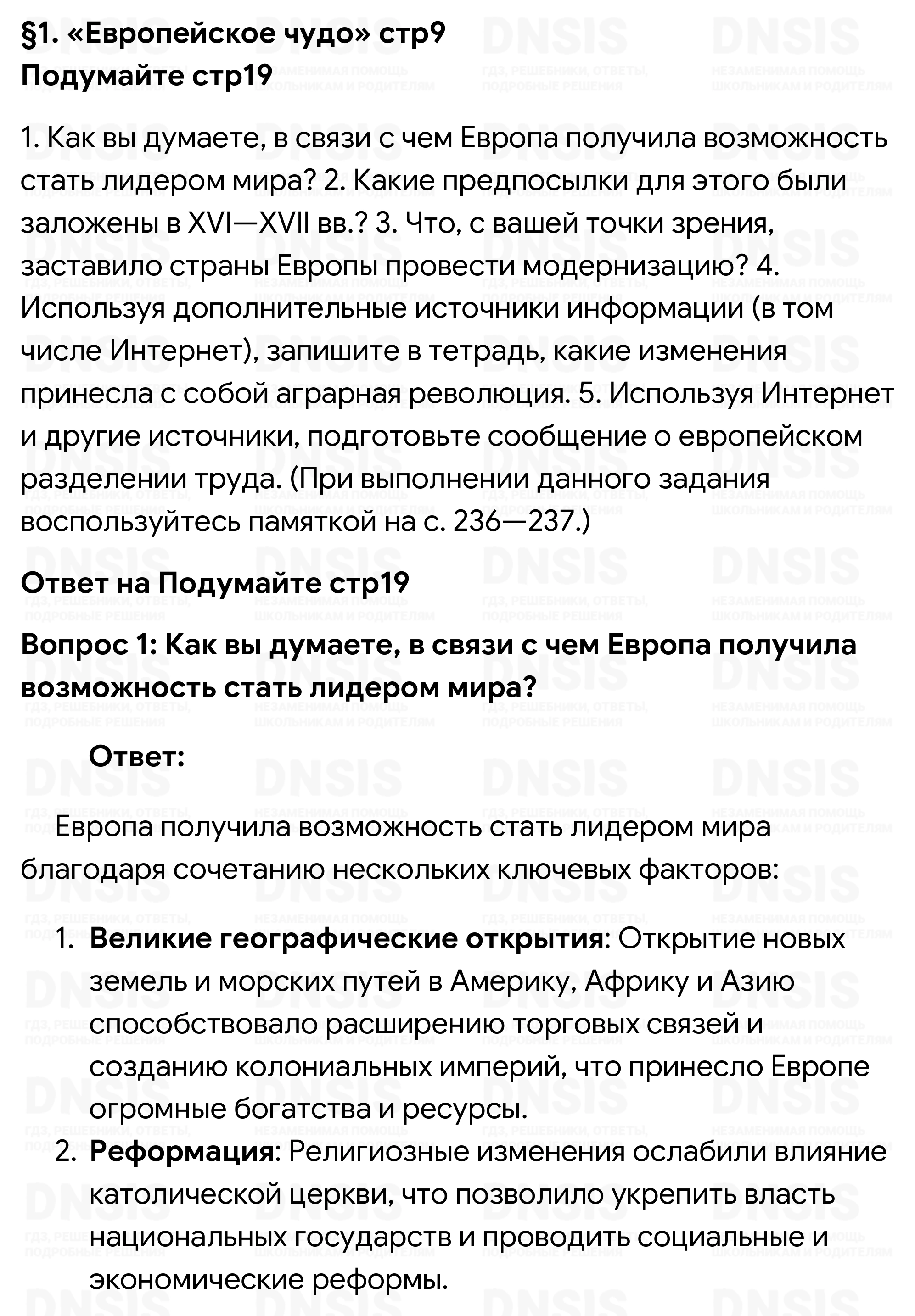 1. Как вы думаете, в связи с чем Европа получила возможность стать лидером мира? 2. Какие предпосылки для этого были заложены в XVI—XVII вв.? 3. Что, с вашей точки зрения, заставило страны Европы провести модернизацию? 4. Используя дополнительные источники информации (в том числе Интернет), запишите в тетрадь, какие изменения принесла с собой аграрная революция. 5. Используя Интернет и другие источники, подготовьте сообщение о европейском разделении труда. (При выполнении данного задания воспользуйтесь памяткой на с. 236—237.)