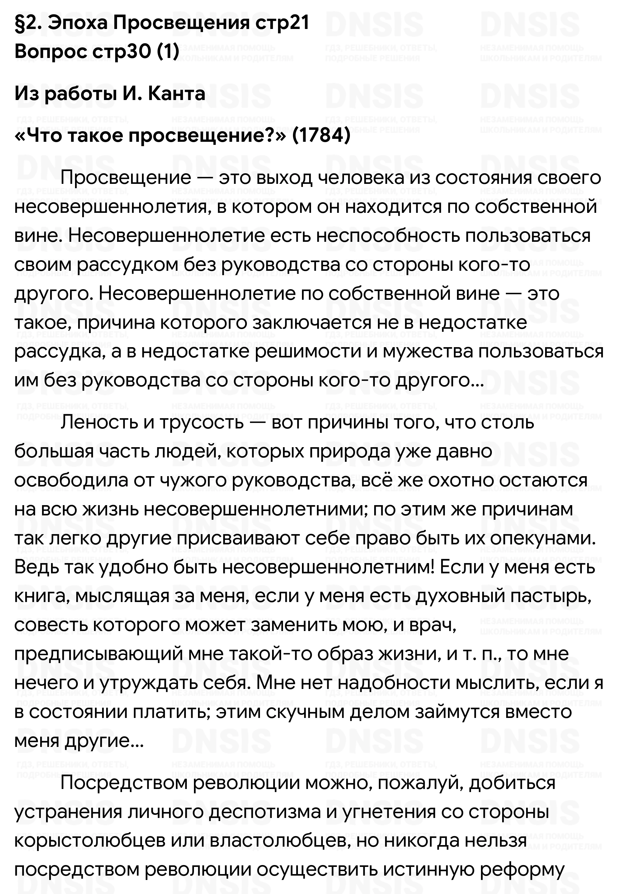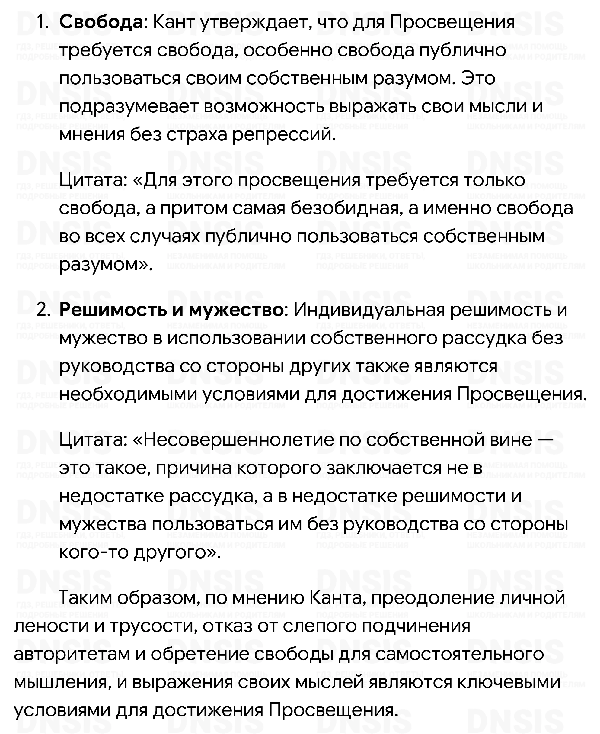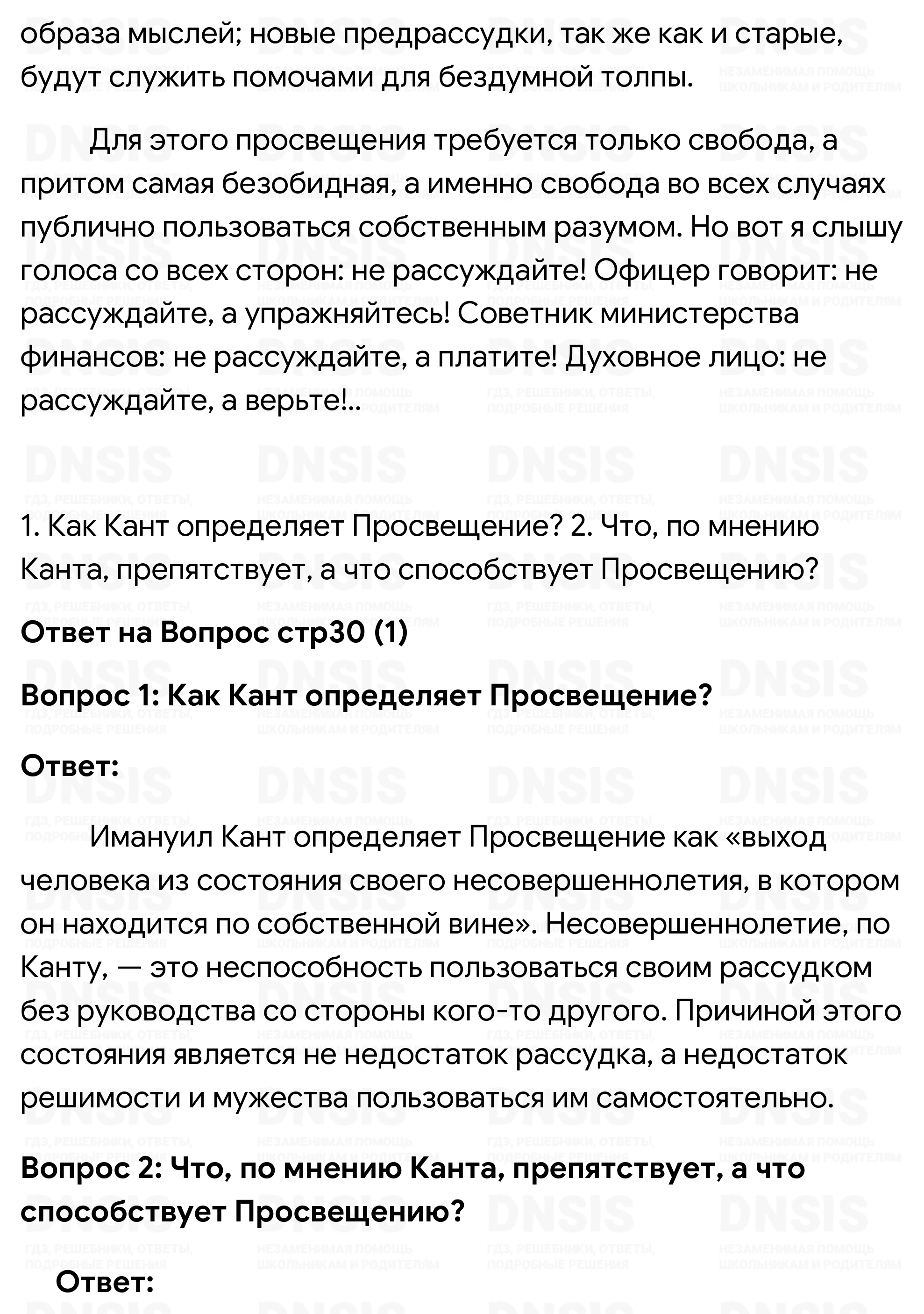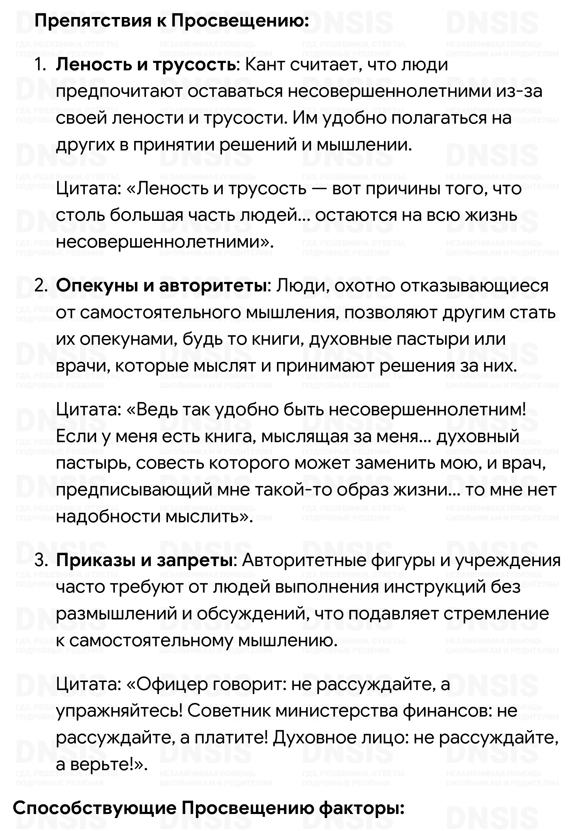 1. Как Кант определяет Просвещение? 2. Что, по мнению Канта, препятствует, а что способствует Просвещению?