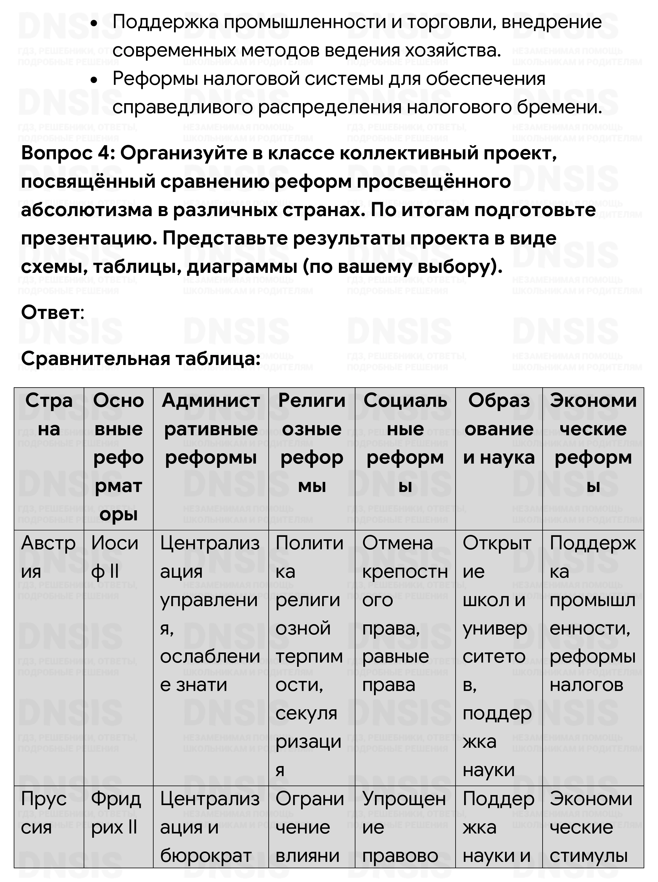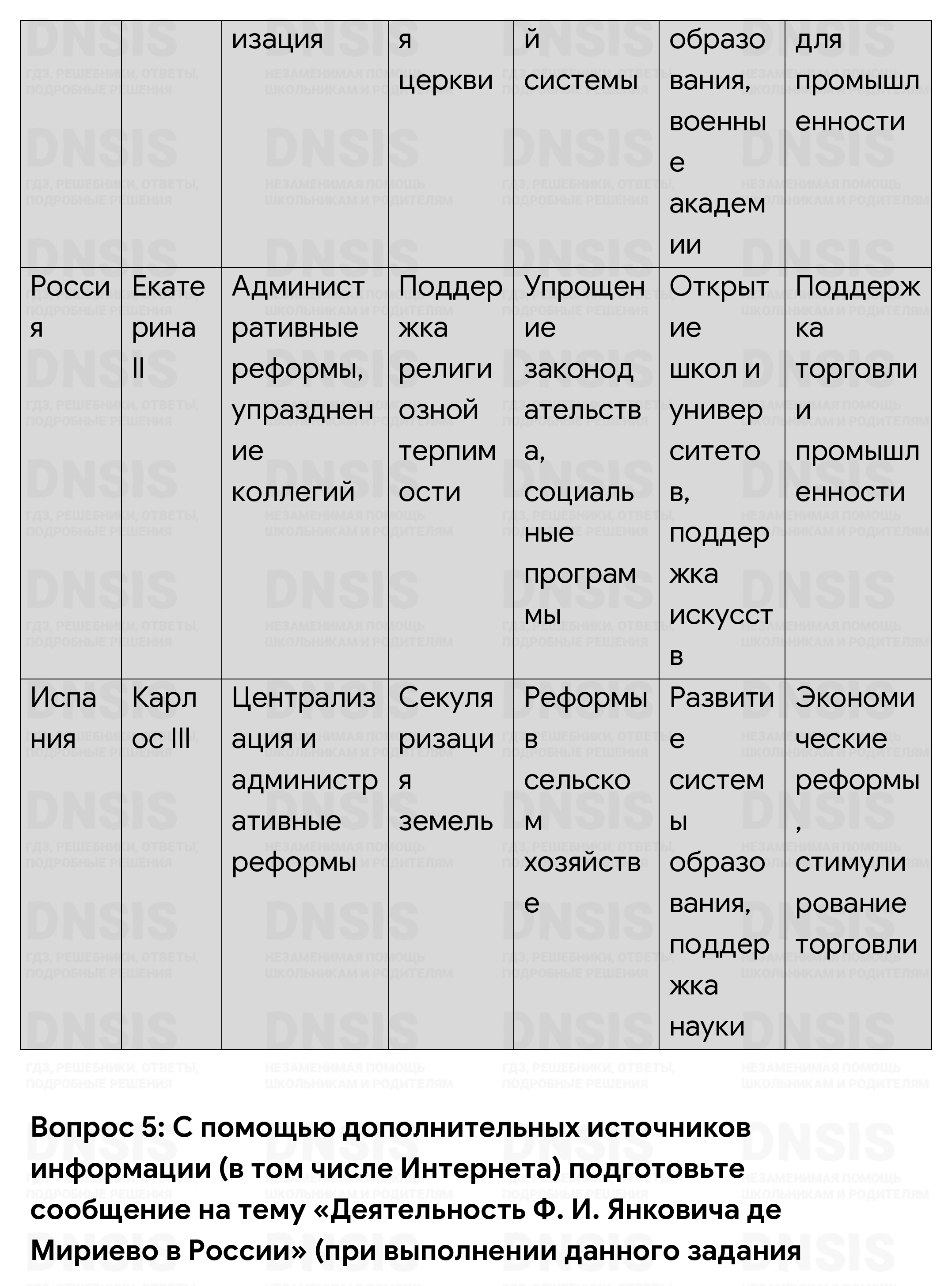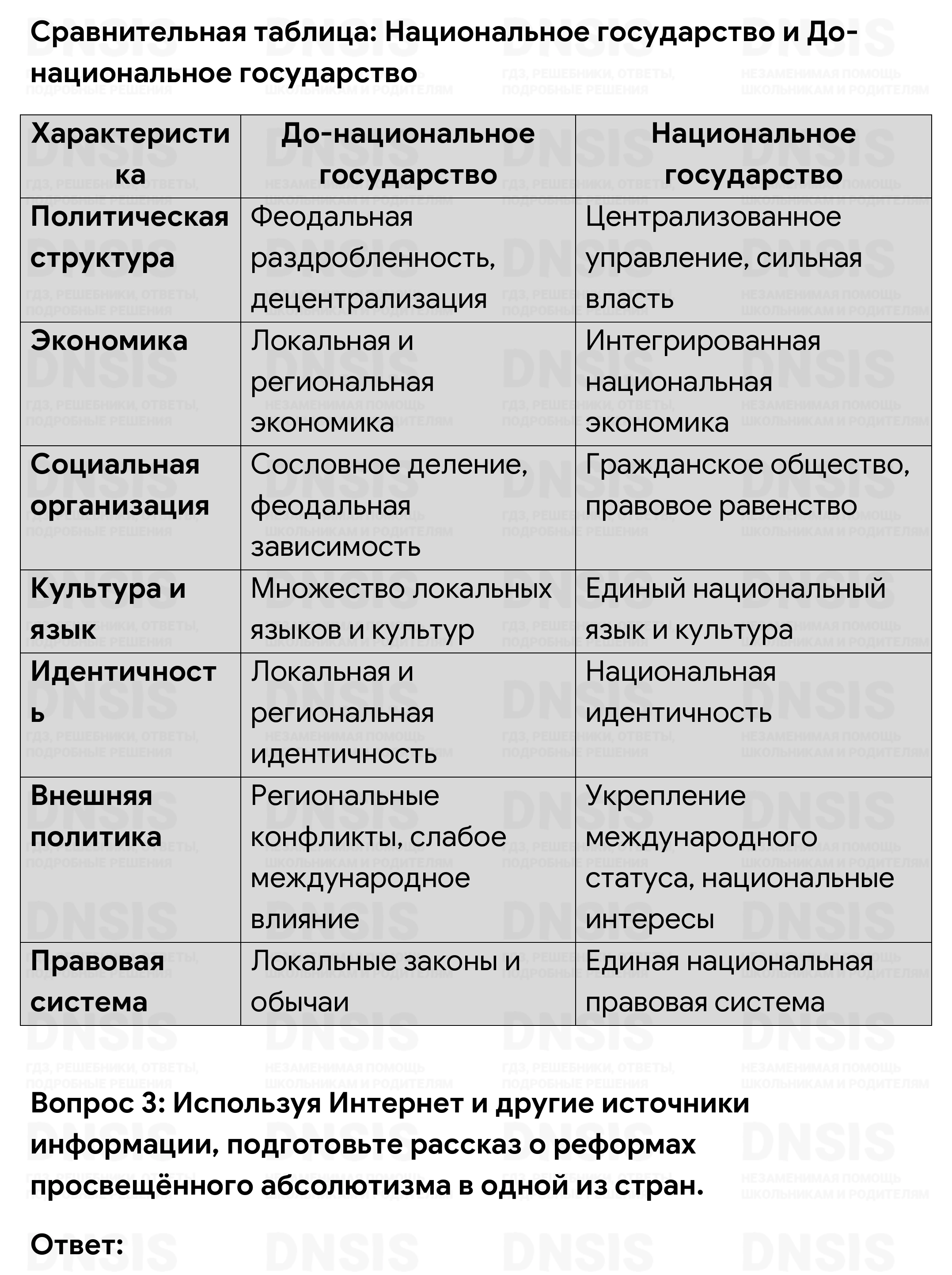 1. Обсудите в классе, что послужило причиной складывания наций. Каковы были последствия этого явления? 2. Чем национальное государство отличается от существовавшего до него? Запишите ответ в тетради в виде сравнительной таблицы. 3. Используя Интернет и другие источники информации, подготовьте рассказ о реформах просвещённого абсолютизма в одной из стран. 4. Организуйте в классе коллективный проект, посвящённый сравнению реформ просвещённого абсолютизма в различных странах. По итогам подготовьте презентацию. Представьте результаты проекта в виде схемы, таблицы, диаграммы (по вашему выбору). 5. С помощью дополнительных источников информации (в том числе Интернета) подготовьте сообщение на тему «Деятельность Ф. И. Янковича де Мириево в России» (при выполнении данного задания воспользуйтесь памяткой на с. 236—237). Выступите с сообщением перед классом. Обсудите сообщение с одноклассниками.