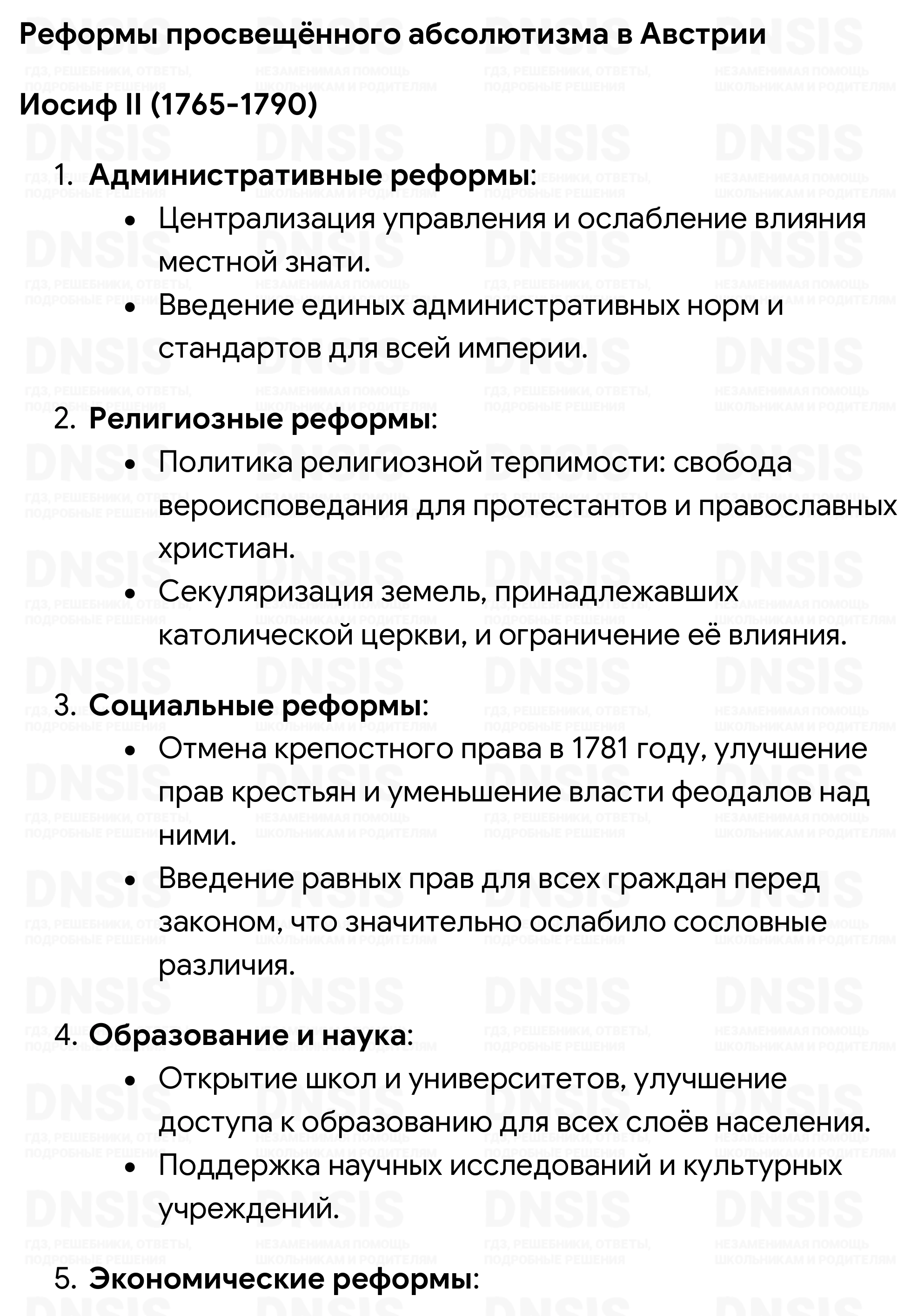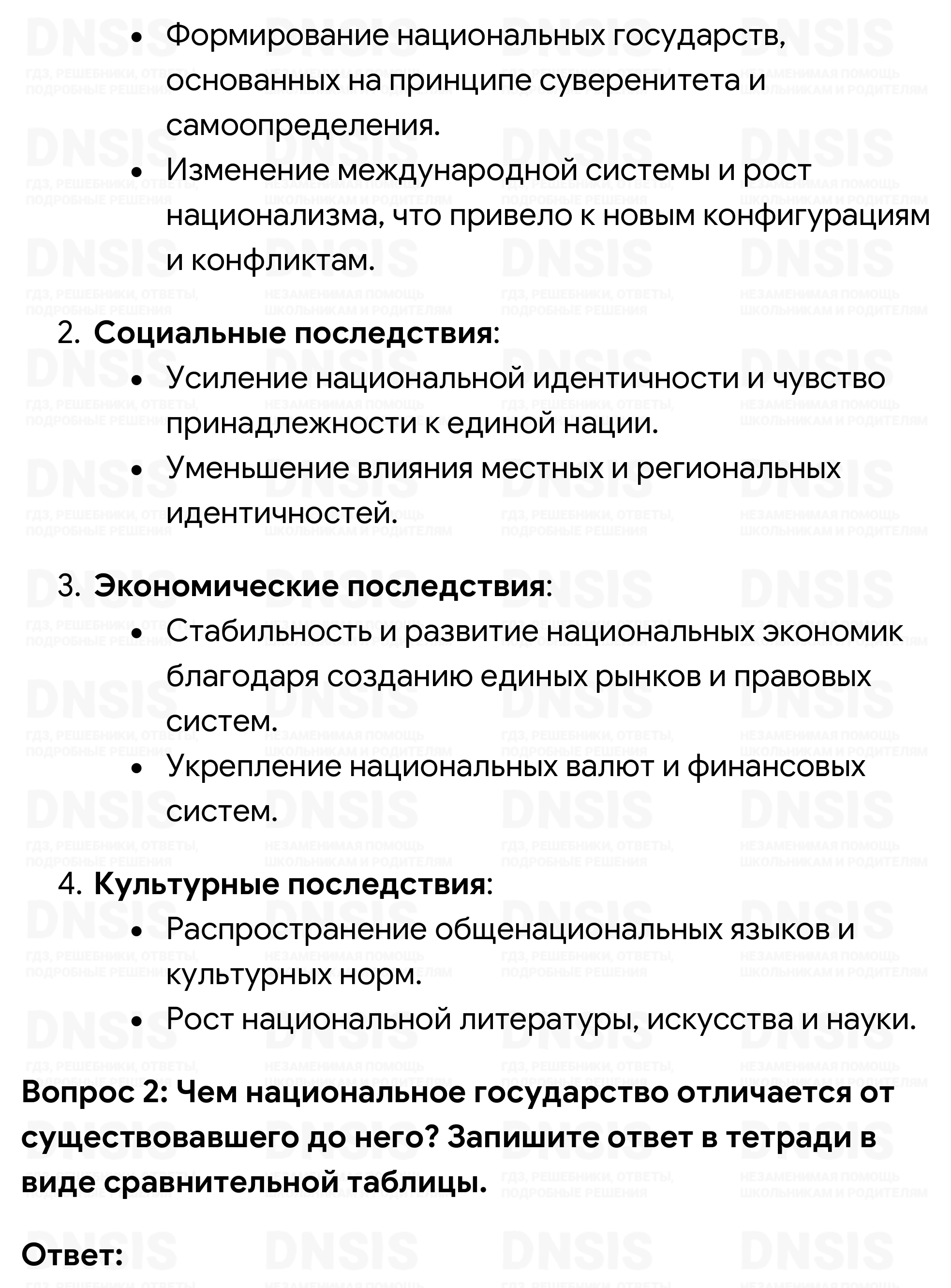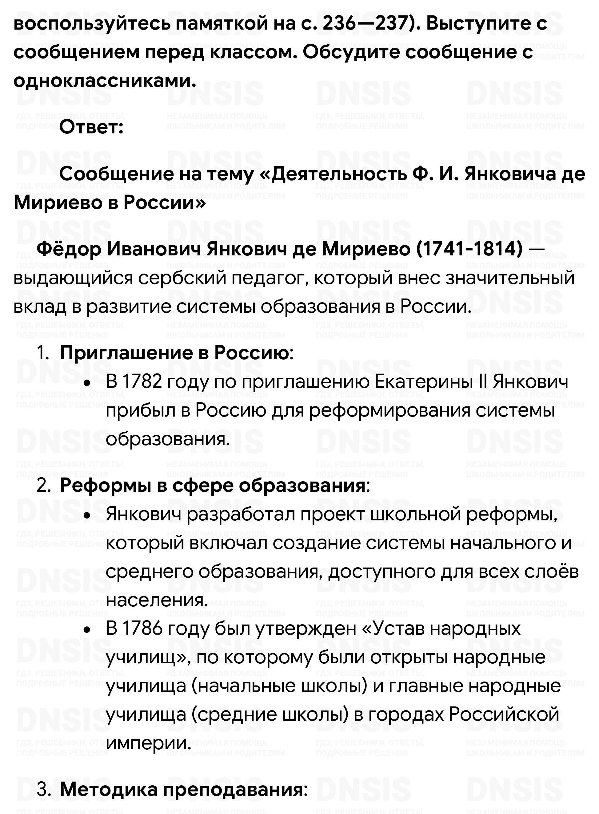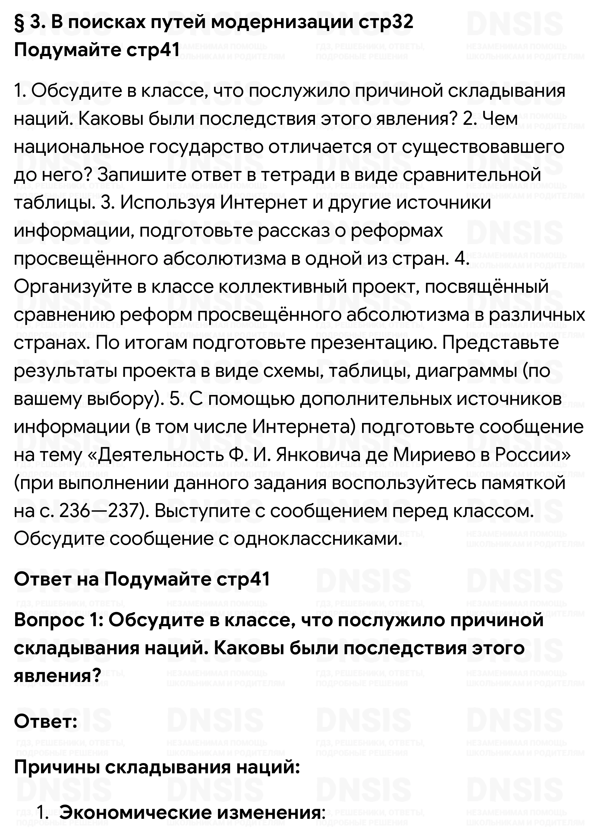 1. Обсудите в классе, что послужило причиной складывания наций. Каковы были последствия этого явления? 2. Чем национальное государство отличается от существовавшего до него? Запишите ответ в тетради в виде сравнительной таблицы. 3. Используя Интернет и другие источники информации, подготовьте рассказ о реформах просвещённого абсолютизма в одной из стран. 4. Организуйте в классе коллективный проект, посвящённый сравнению реформ просвещённого абсолютизма в различных странах. По итогам подготовьте презентацию. Представьте результаты проекта в виде схемы, таблицы, диаграммы (по вашему выбору). 5. С помощью дополнительных источников информации (в том числе Интернета) подготовьте сообщение на тему «Деятельность Ф. И. Янковича де Мириево в России» (при выполнении данного задания воспользуйтесь памяткой на с. 236—237). Выступите с сообщением перед классом. Обсудите сообщение с одноклассниками.