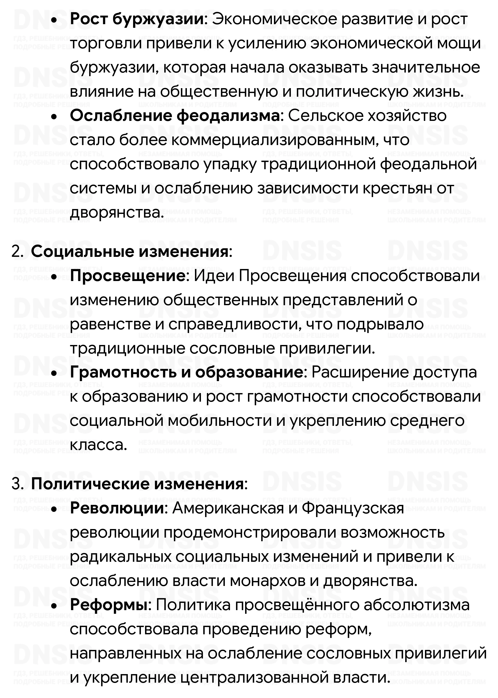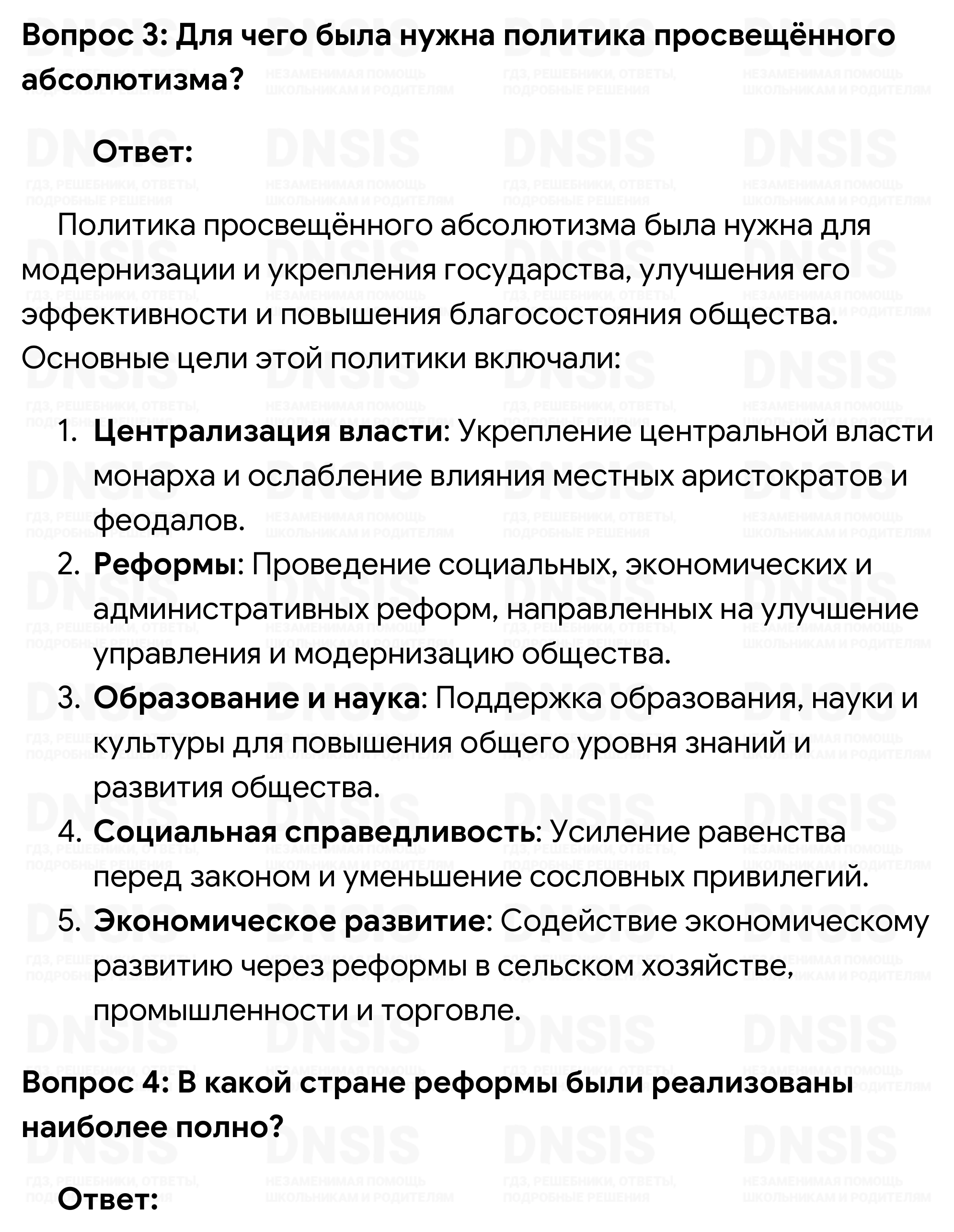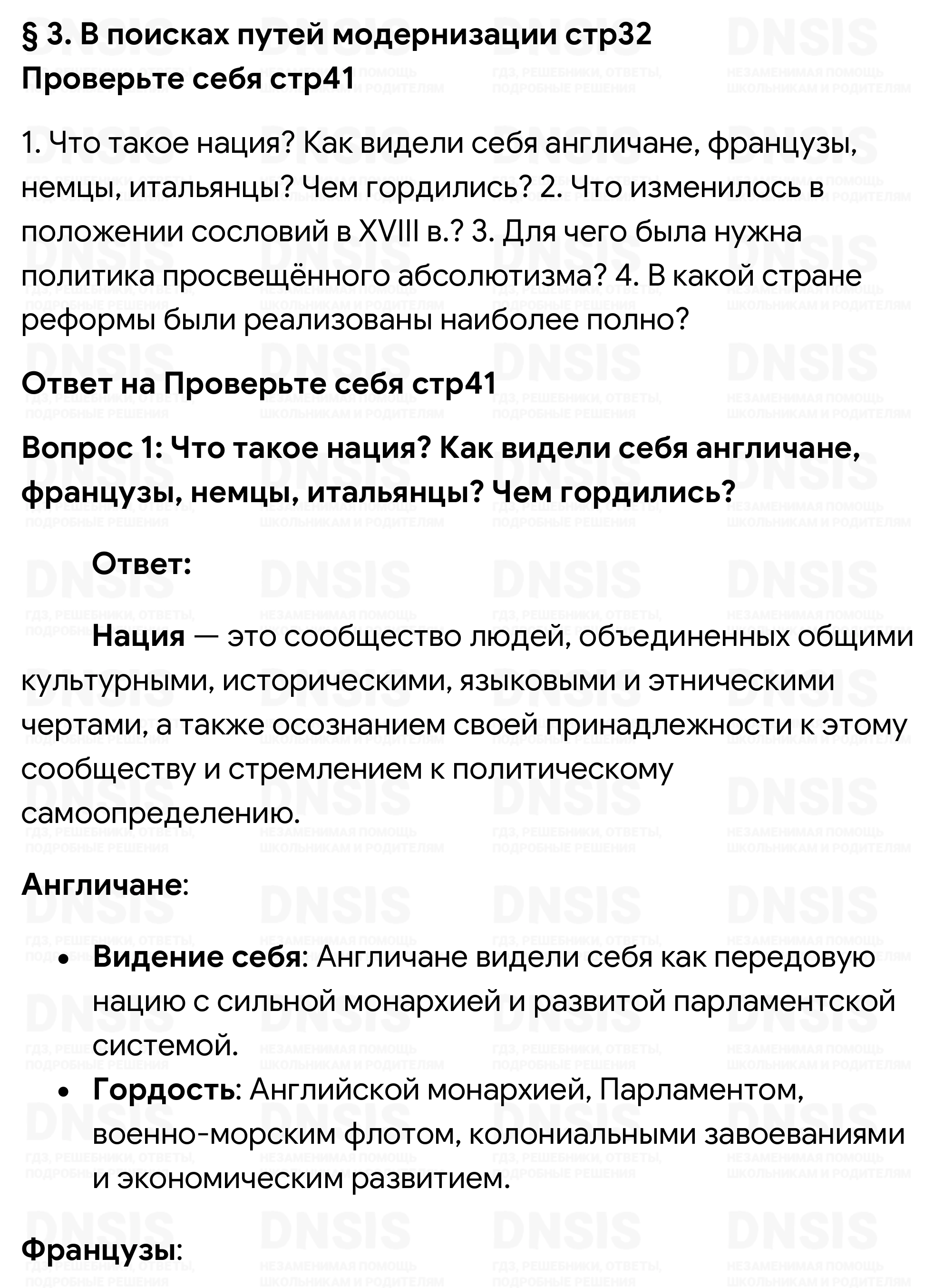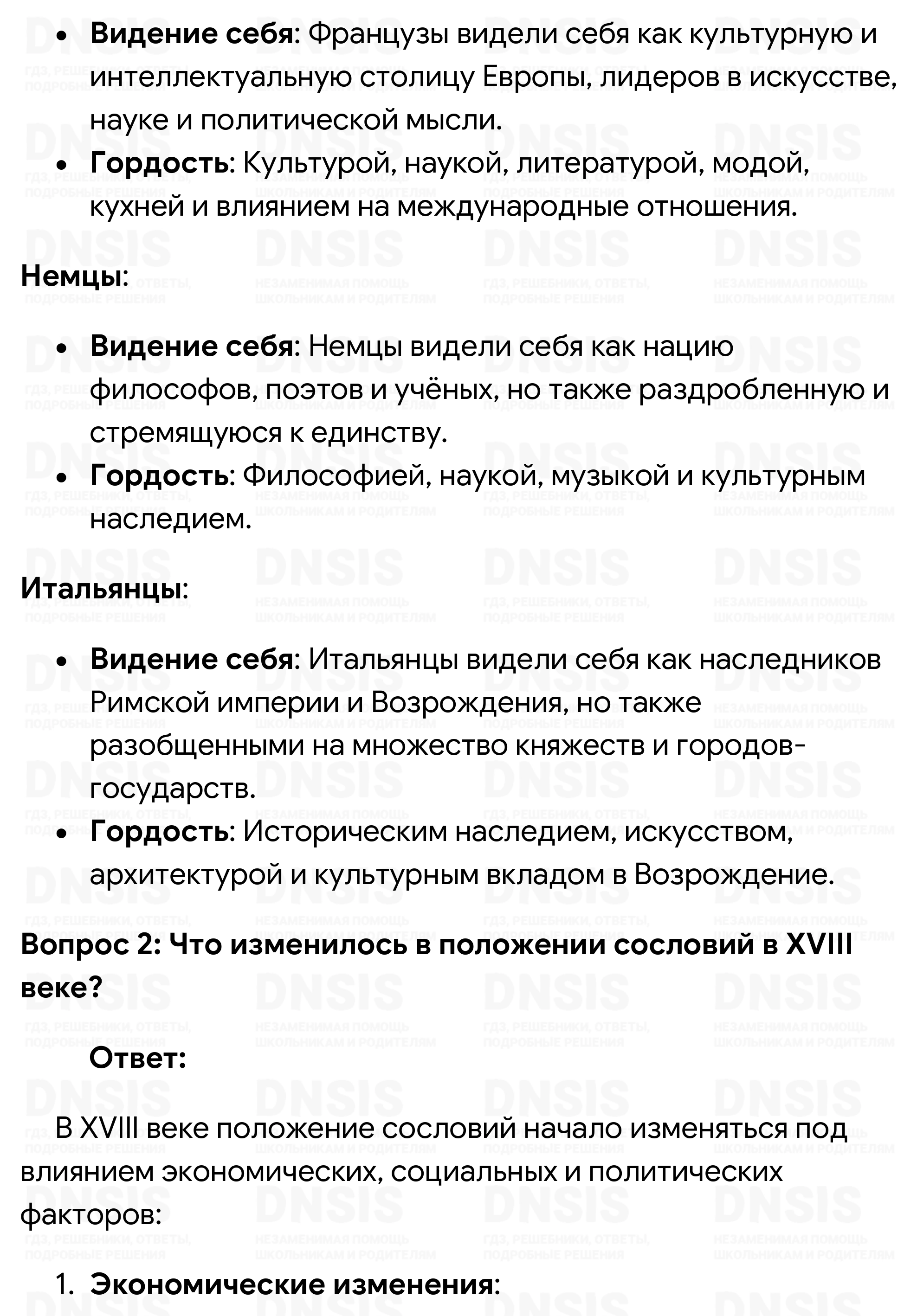 1. Что такое нация? Как видели себя англичане, французы, немцы, итальянцы? Чем гордились? 2. Что изменилось в положении сословий в XVIII в.? 3. Для чего была нужна политика просвещённого абсолютизма? 4. В какой стране реформы были реализованы наиболее полно?