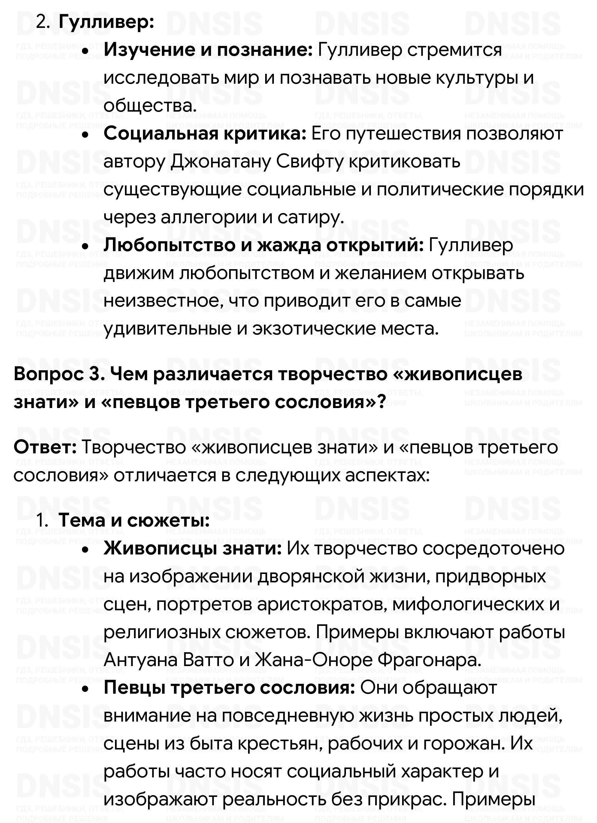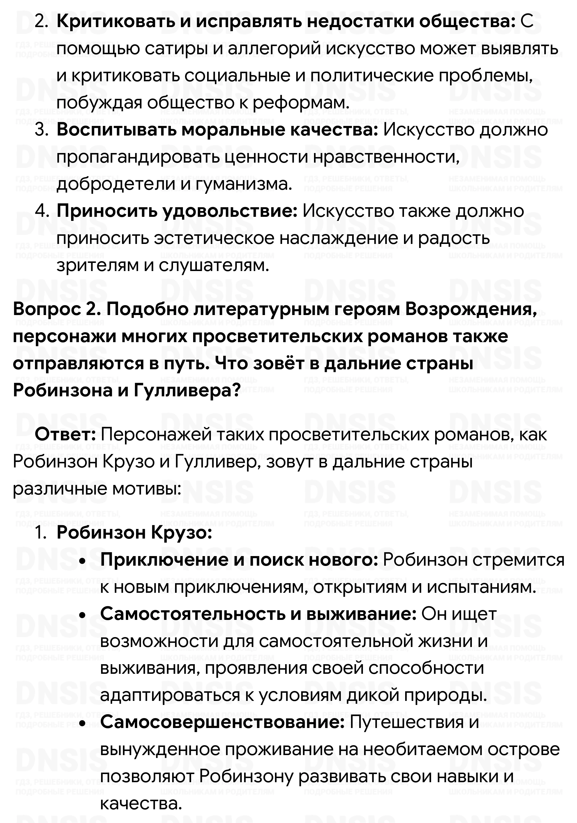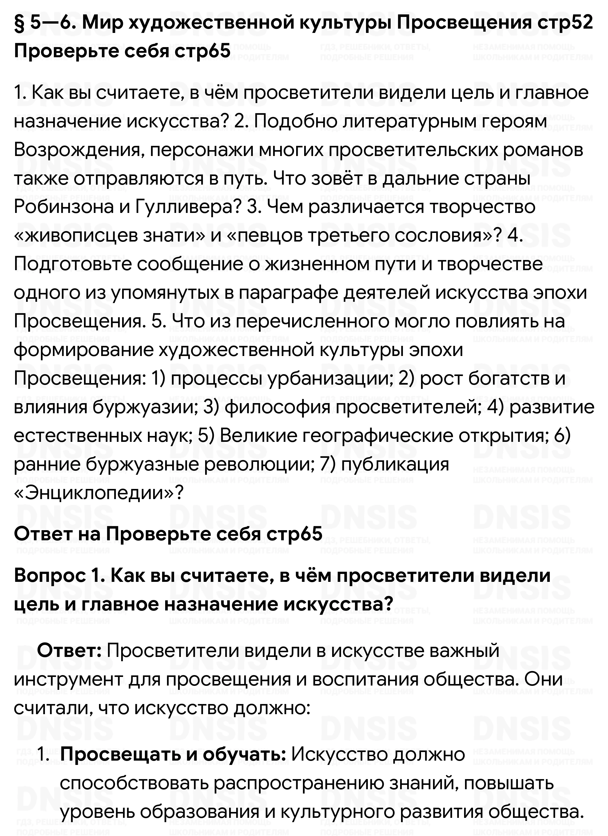 1. Как вы считаете, в чём просветители видели цель и главное назначение искусства? 2. Подобно литературным героям Возрождения, персонажи многих просветительских романов также отправляются в путь. Что зовёт в дальние страны Робинзона и Гулливера? 3. Чем различается творчество «живописцев знати» и «певцов третьего сословия»? 4. Подготовьте сообщение о жизненном пути и творчестве одного из упомянутых в параграфе деятелей искусства эпохи Просвещения. 5. Что из перечисленного могло повлиять на формирование художественной культуры эпохи Просвещения: 1) процессы урбанизации; 2) рост богатств и влияния буржуазии; 3) философия просветителей; 4) развитие естественных наук; 5) Великие географические открытия; 6) ранние буржуазные революции; 7) публикация «Энциклопедии»?