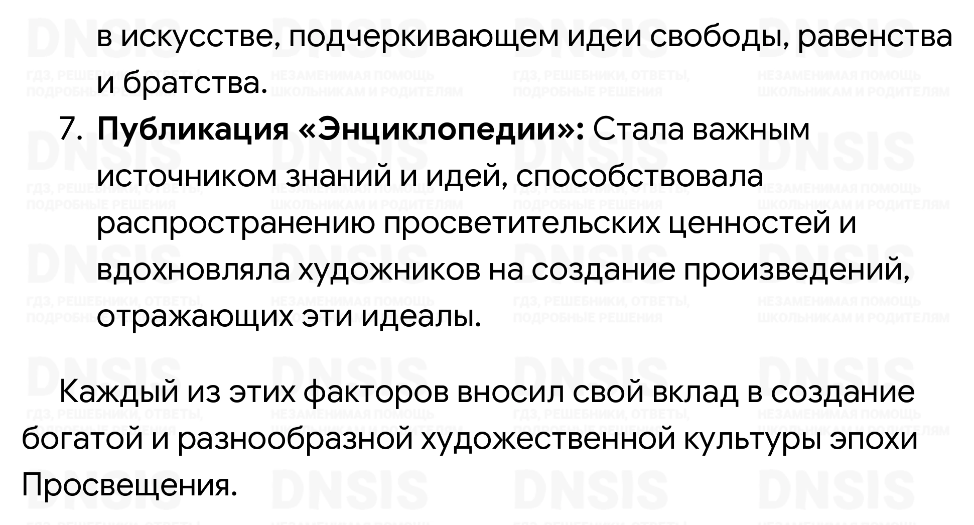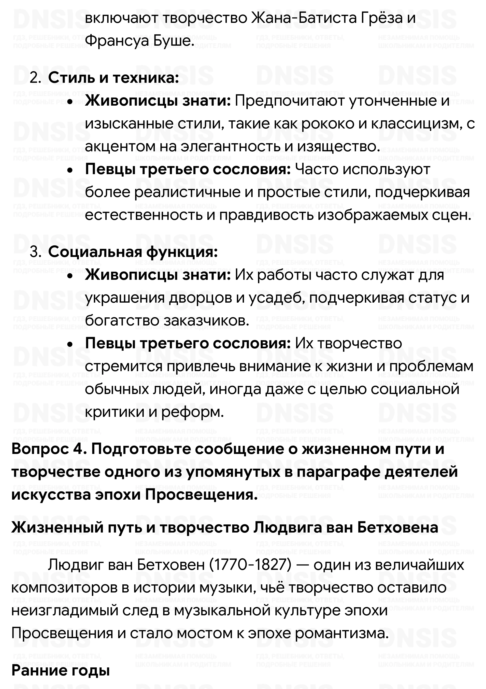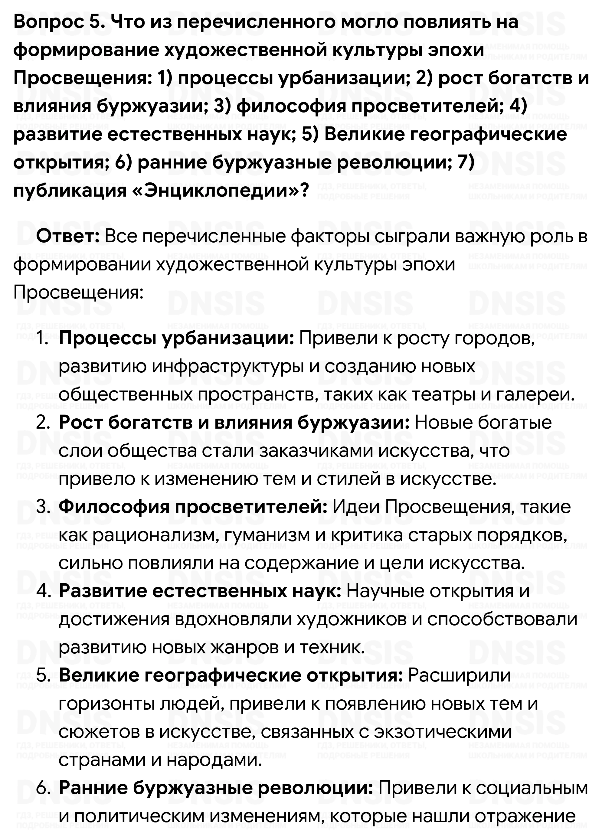 1. Как вы считаете, в чём просветители видели цель и главное назначение искусства? 2. Подобно литературным героям Возрождения, персонажи многих просветительских романов также отправляются в путь. Что зовёт в дальние страны Робинзона и Гулливера? 3. Чем различается творчество «живописцев знати» и «певцов третьего сословия»? 4. Подготовьте сообщение о жизненном пути и творчестве одного из упомянутых в параграфе деятелей искусства эпохи Просвещения. 5. Что из перечисленного могло повлиять на формирование художественной культуры эпохи Просвещения: 1) процессы урбанизации; 2) рост богатств и влияния буржуазии; 3) философия просветителей; 4) развитие естественных наук; 5) Великие географические открытия; 6) ранние буржуазные революции; 7) публикация «Энциклопедии»?