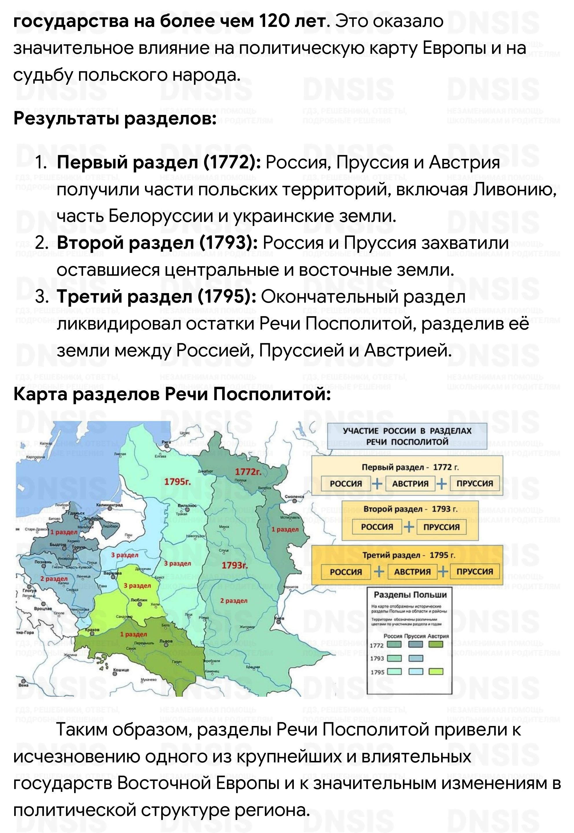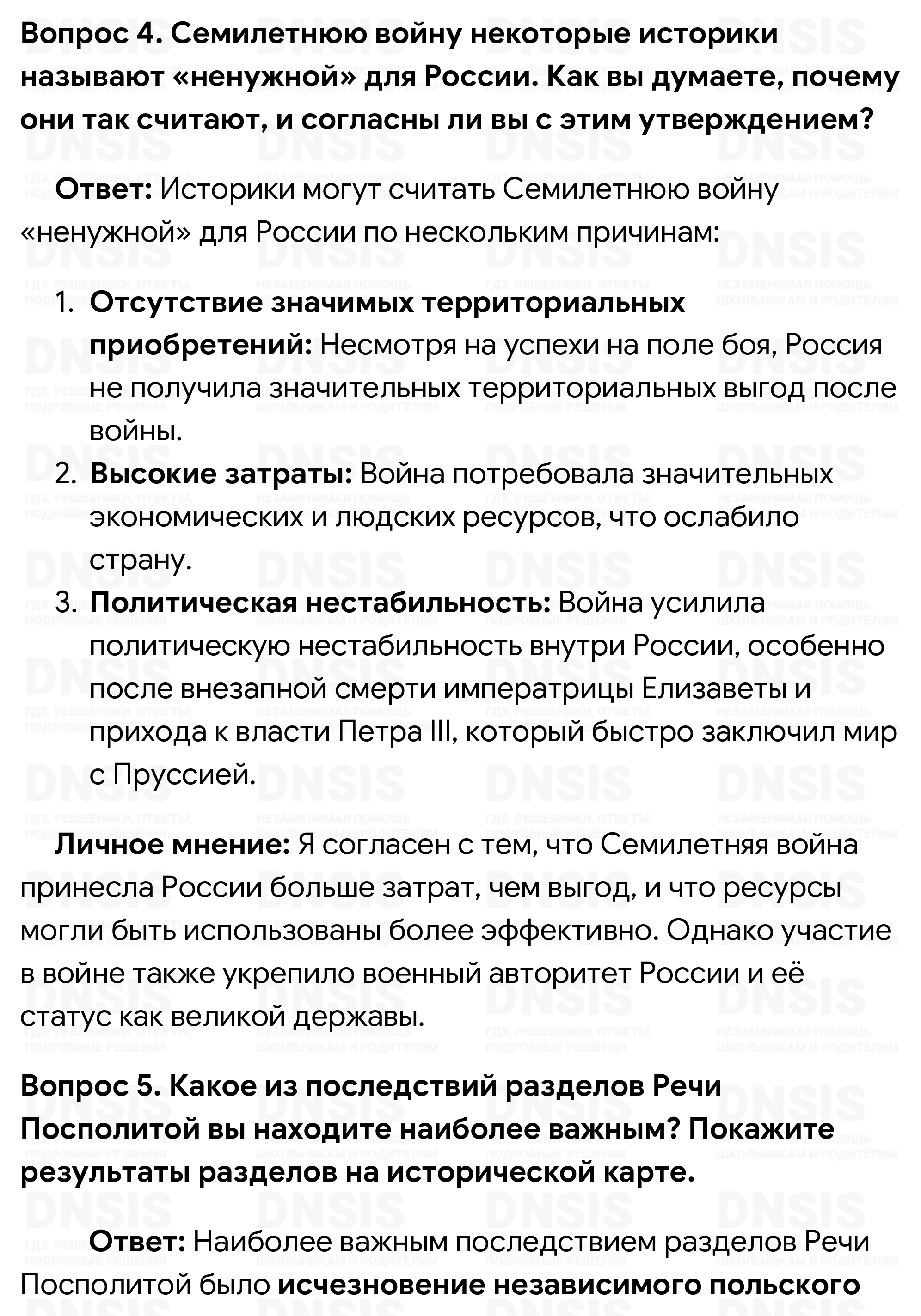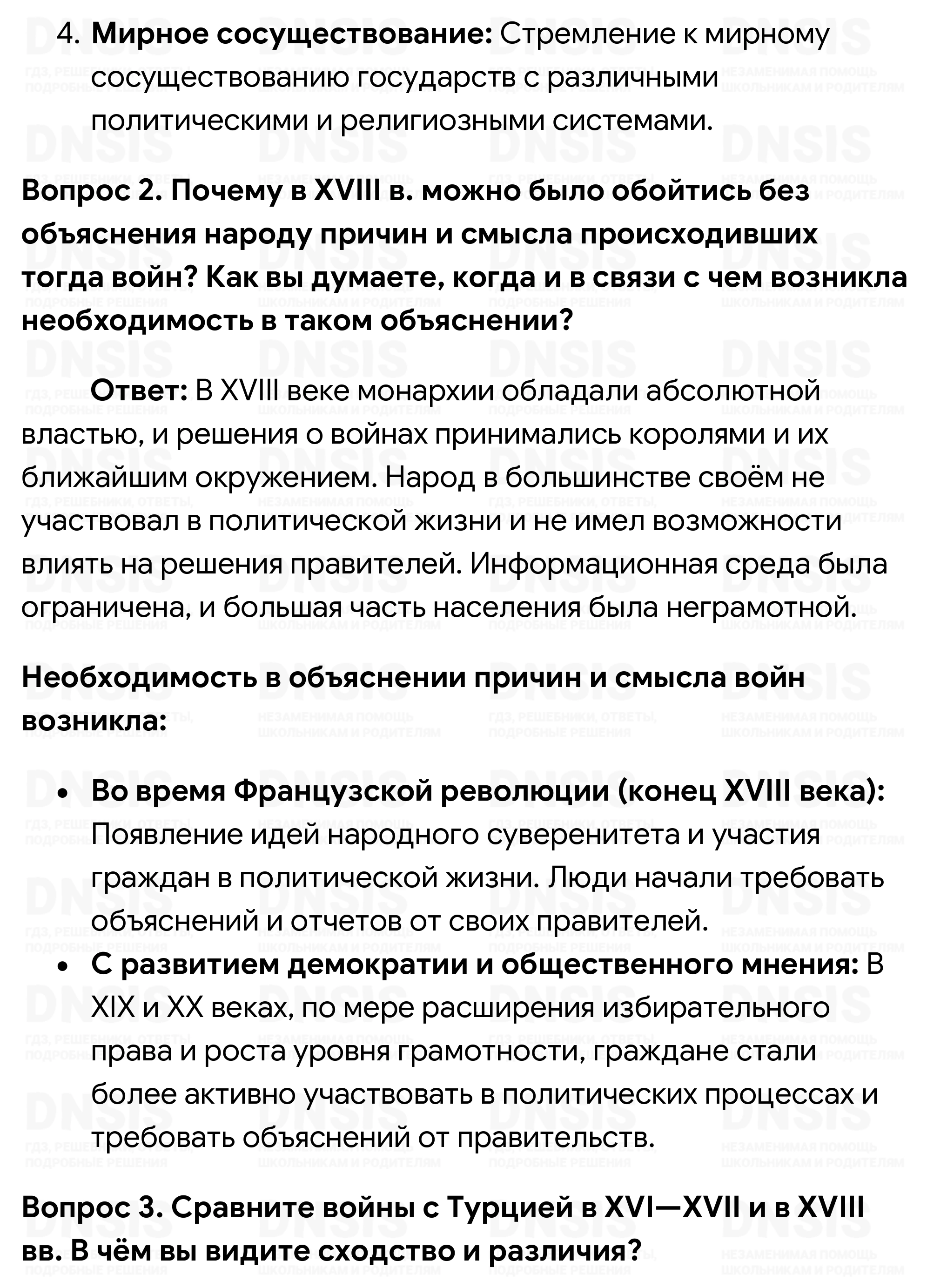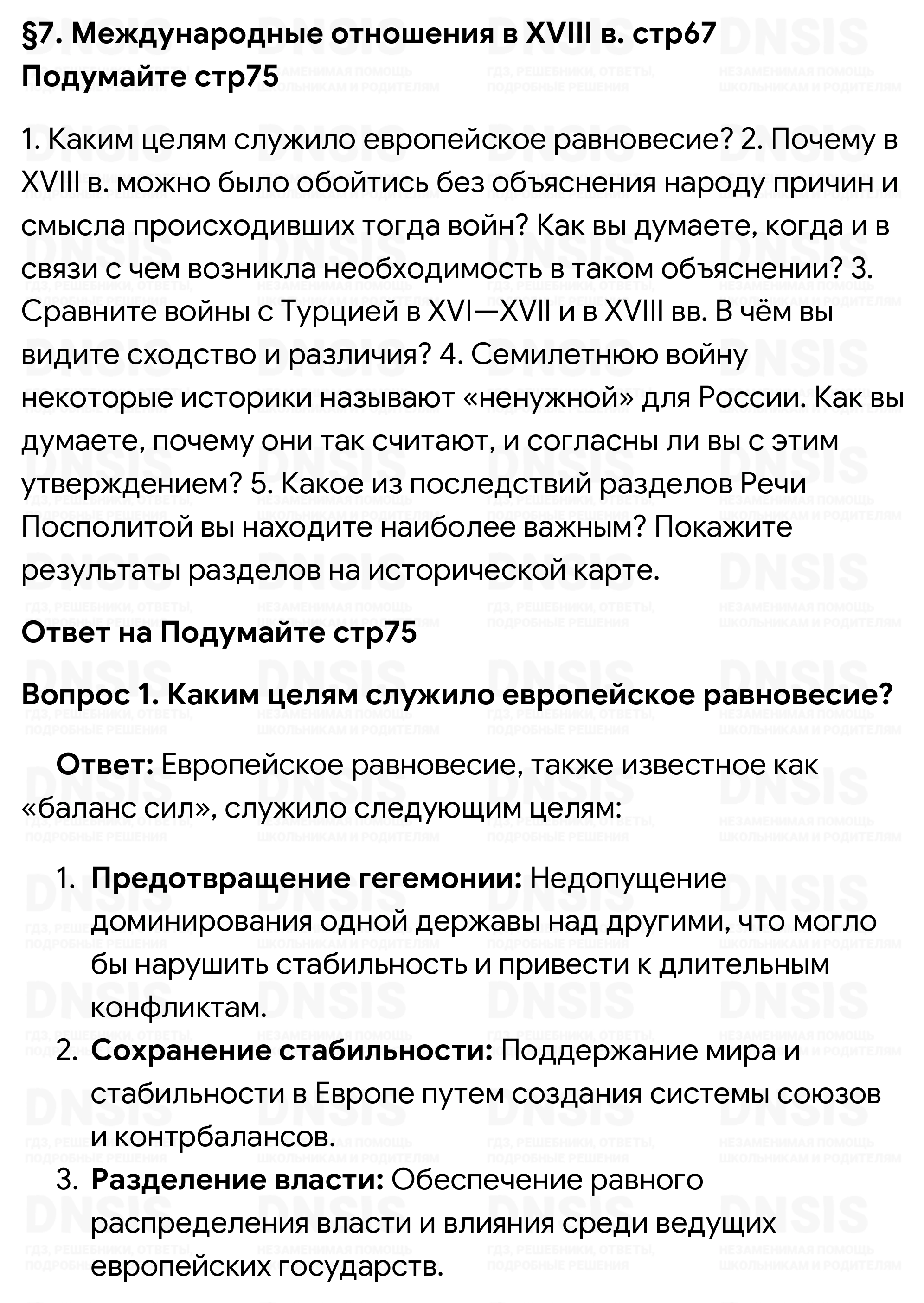 1. Каким целям служило европейское равновесие? 2. Почему в XVIII в. можно было обойтись без объяснения народу причин и смысла происходивших тогда войн? Как вы думаете, когда и в связи с чем возникла необходимость в таком объяснении? 3. Сравните войны с Турцией в XVI—XVII и в XVIII вв. В чём вы видите сходство и различия? 4. Семилетнюю войну некоторые историки называют «ненужной» для России. Как вы думаете, почему они так считают, и согласны ли вы с этим утверждением? 5. Какое из последствий разделов Речи Посполитой вы находите наиболее важным? Покажите результаты разделов на исторической карте.