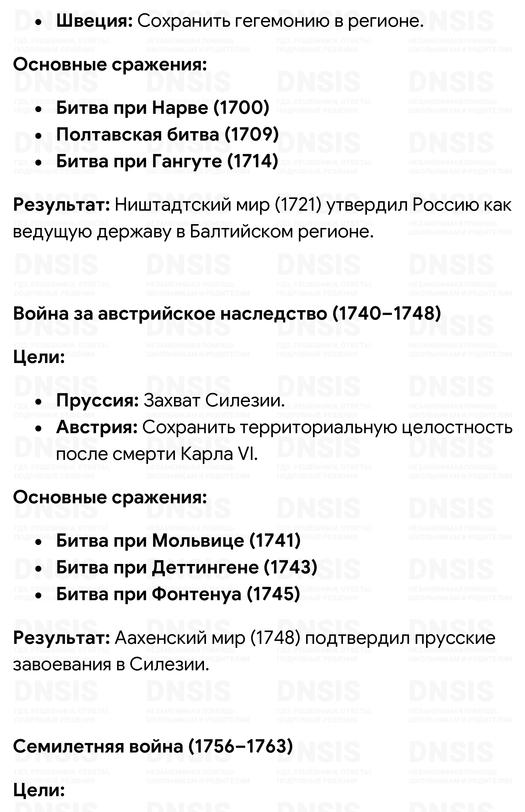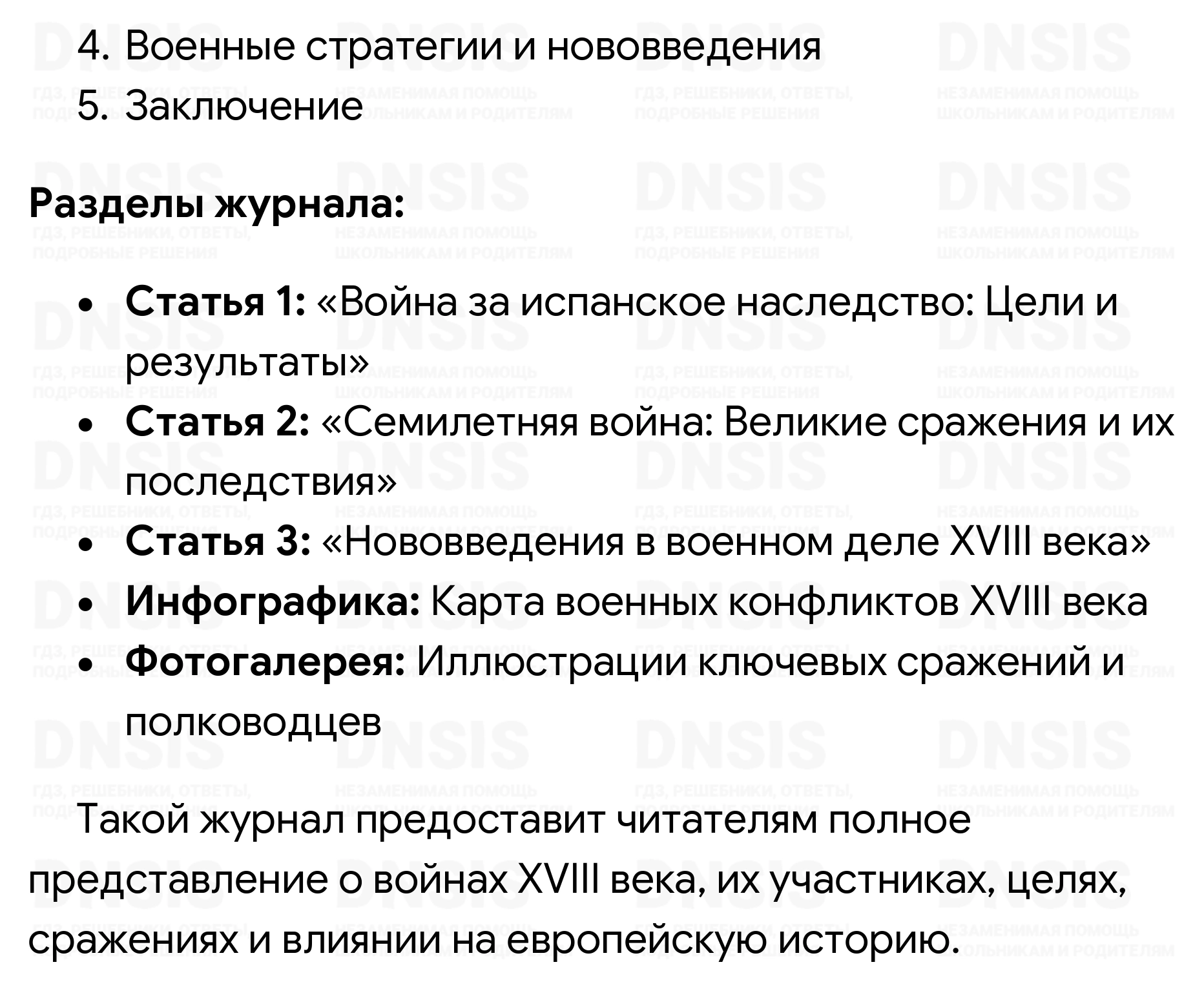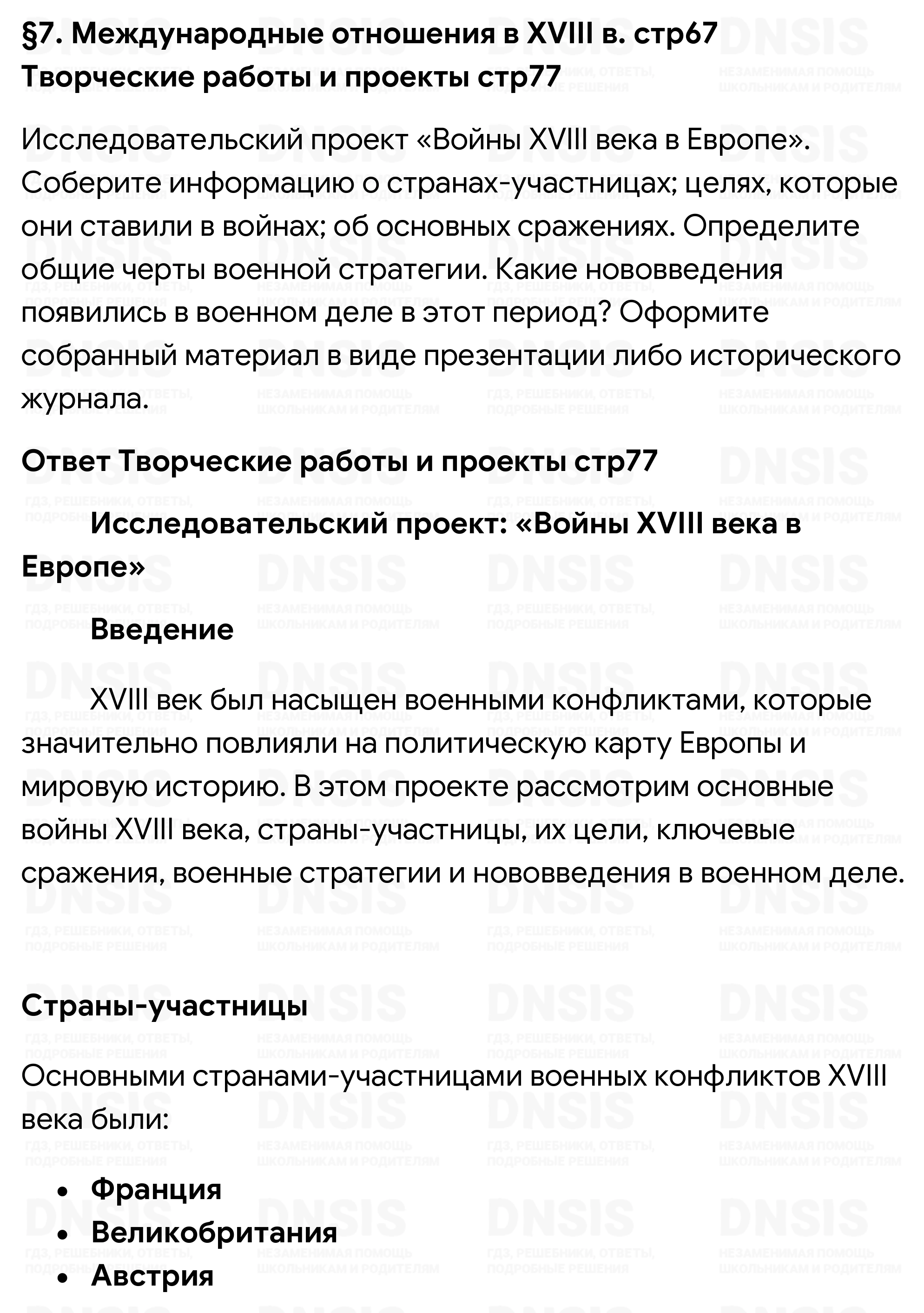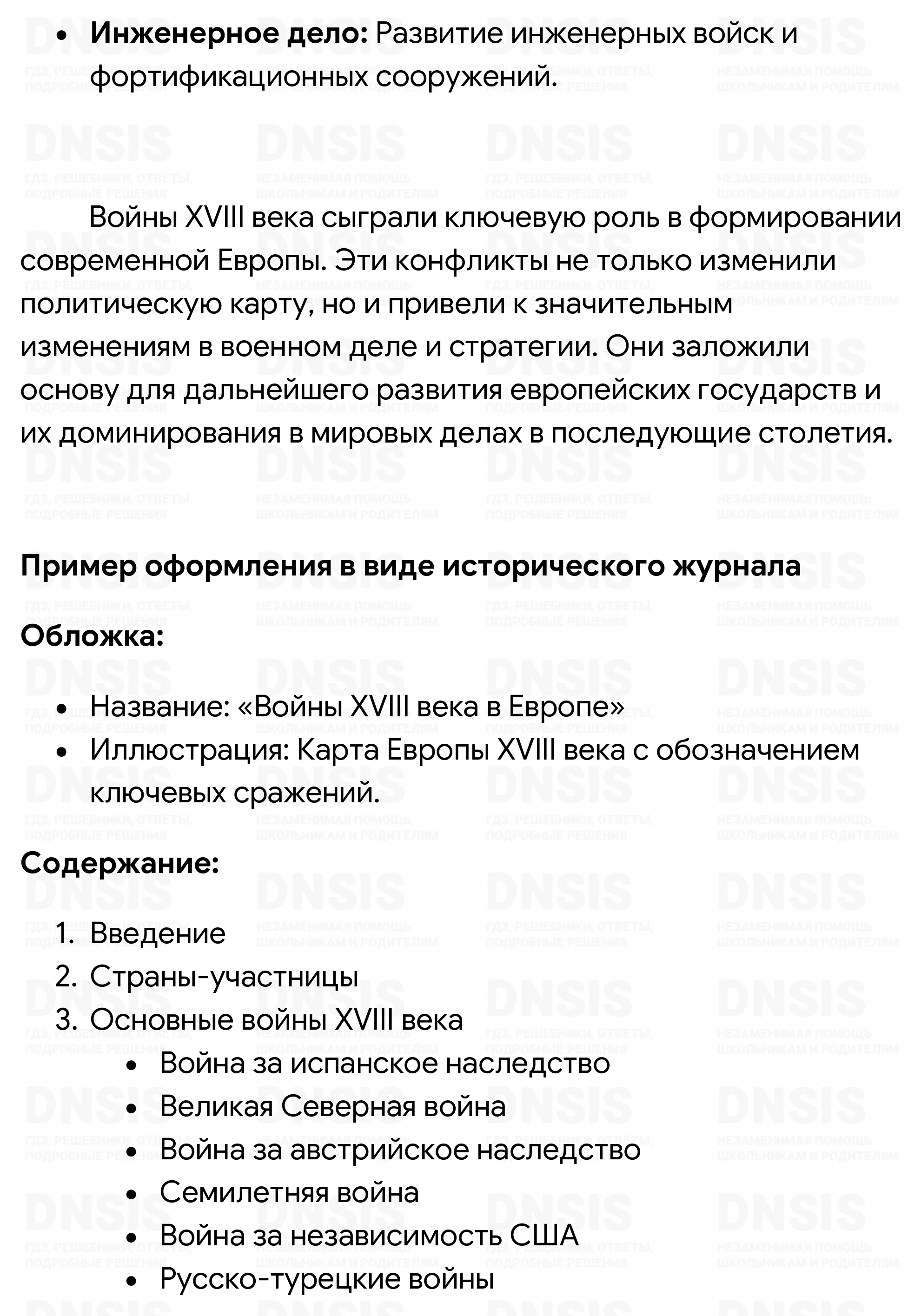 Исследовательский проект «Войны XVIII века в Европе». Соберите информацию о странах-участницах; целях, которые они ставили в войнах; об основных сражениях. Определите общие черты военной стратегии. Какие нововведения появились в военном деле в этот период? Оформите собранный материал в виде презентации либо исторического журнала.