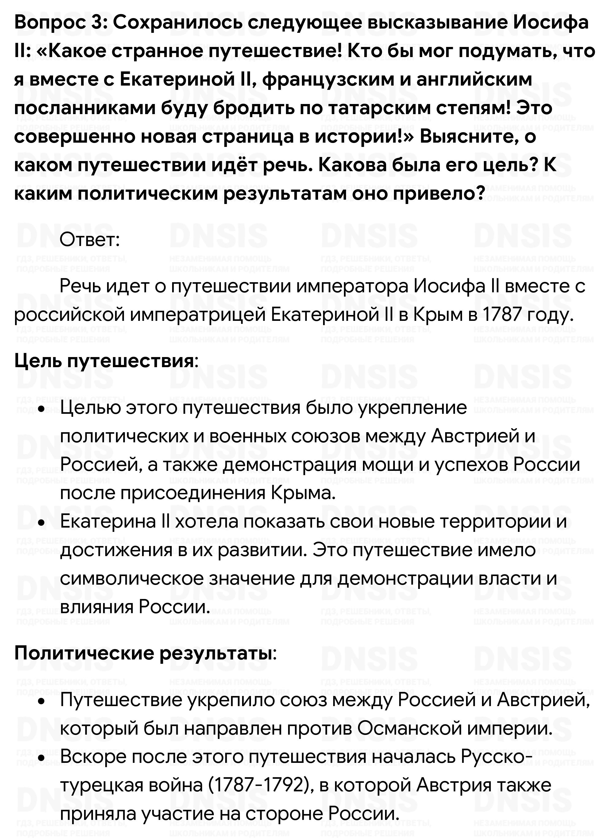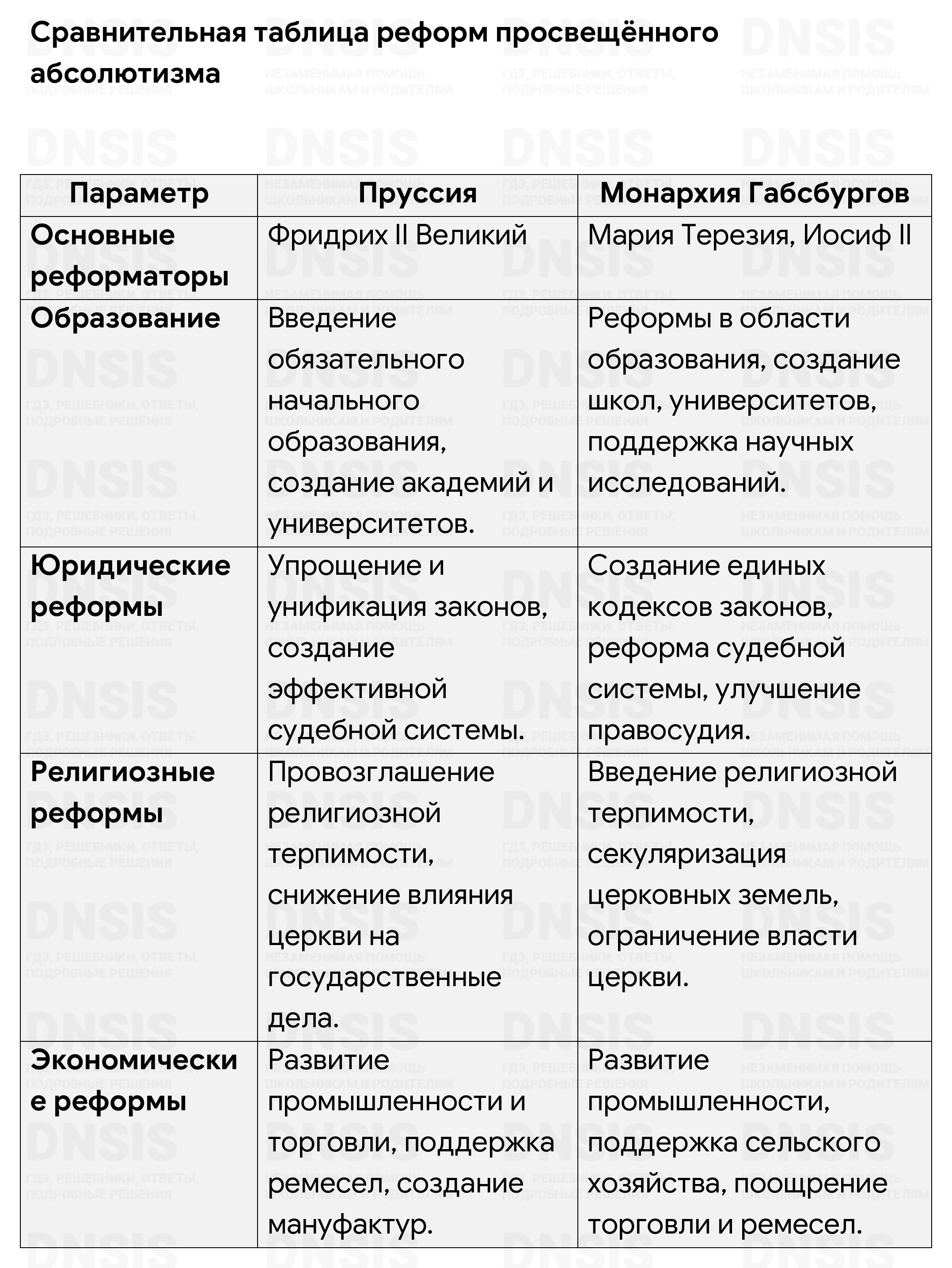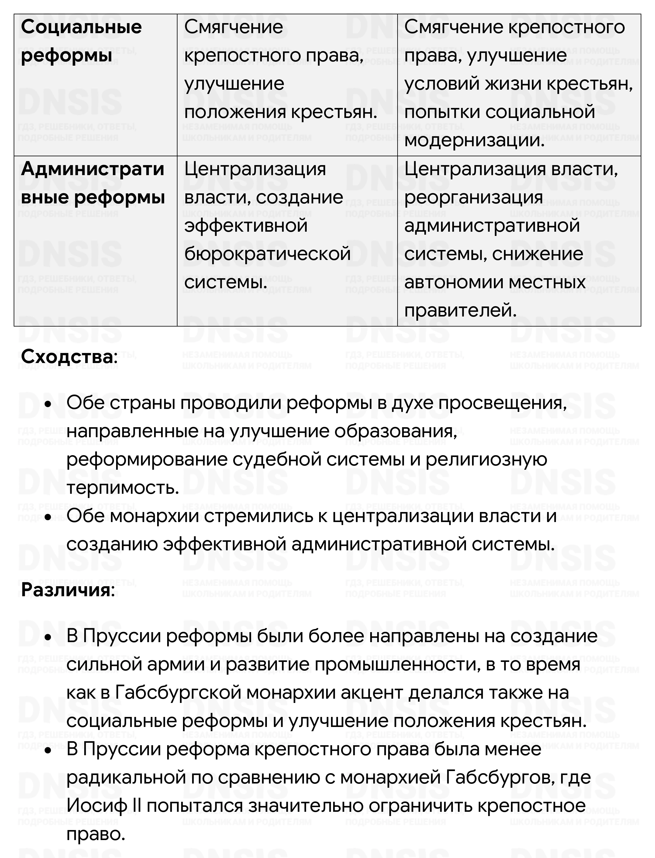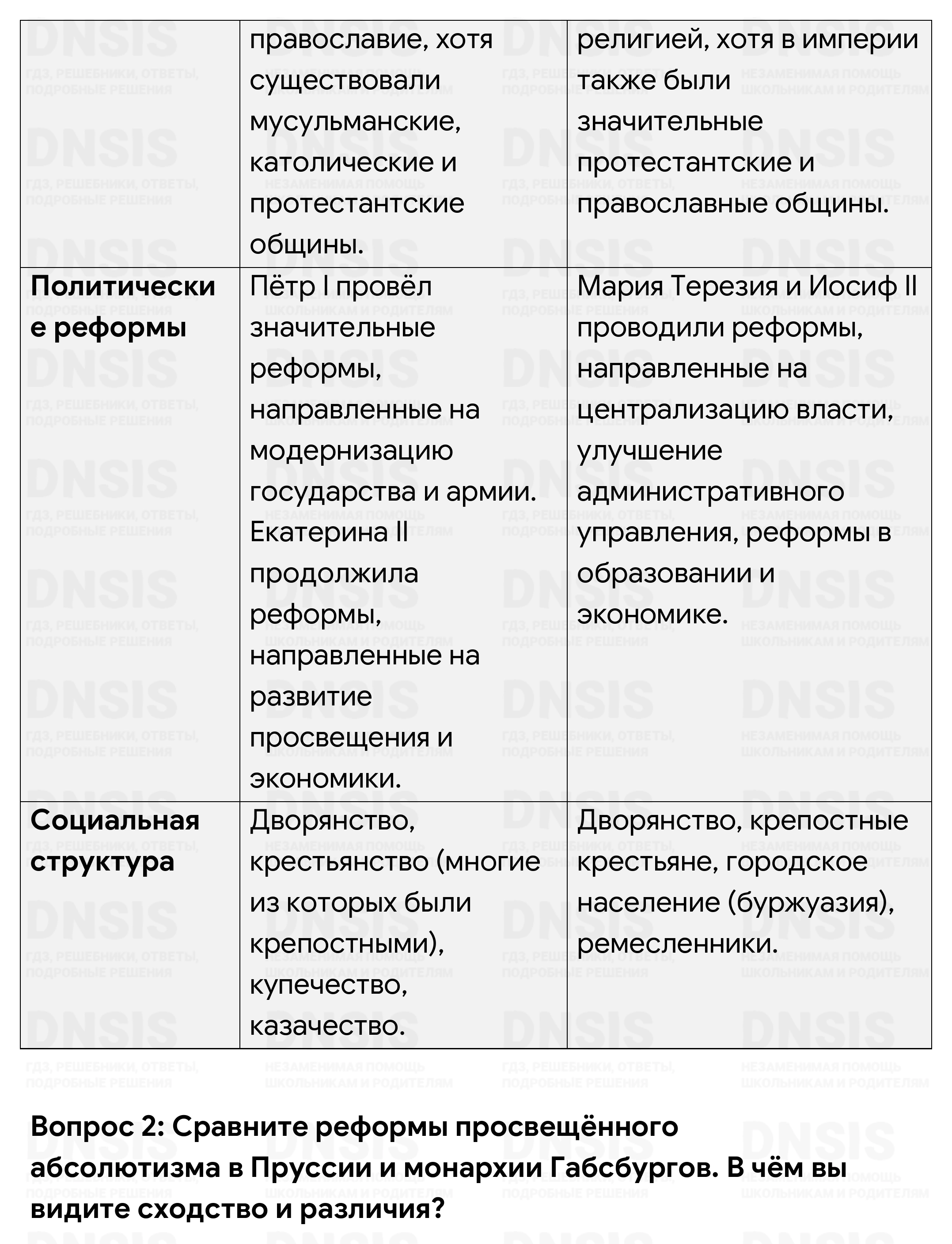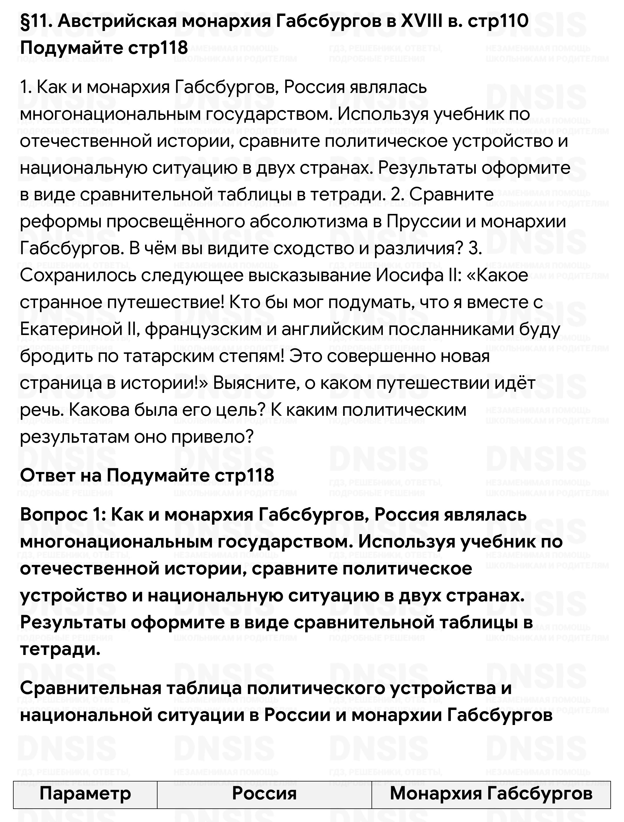 1. Как и монархия Габсбургов, Россия являлась многонациональным государством. Используя учебник по отечественной истории, сравните политическое устройство и национальную ситуацию в двух странах. Результаты оформите в виде сравнительной таблицы в тетради. 2. Сравните реформы просвещённого абсолютизма в Пруссии и монархии Габсбургов. В чём вы видите сходство и различия? 3. Сохранилось следующее высказывание Иосифа II: «Какое странное путешествие! Кто бы мог подумать, что я вместе с Екатериной II, французским и английским посланниками буду бродить по татарским степям! Это совершенно новая страница в истории!» Выясните, о каком путешествии идёт речь. Какова была его цель? К каким политическим результатам оно привело?