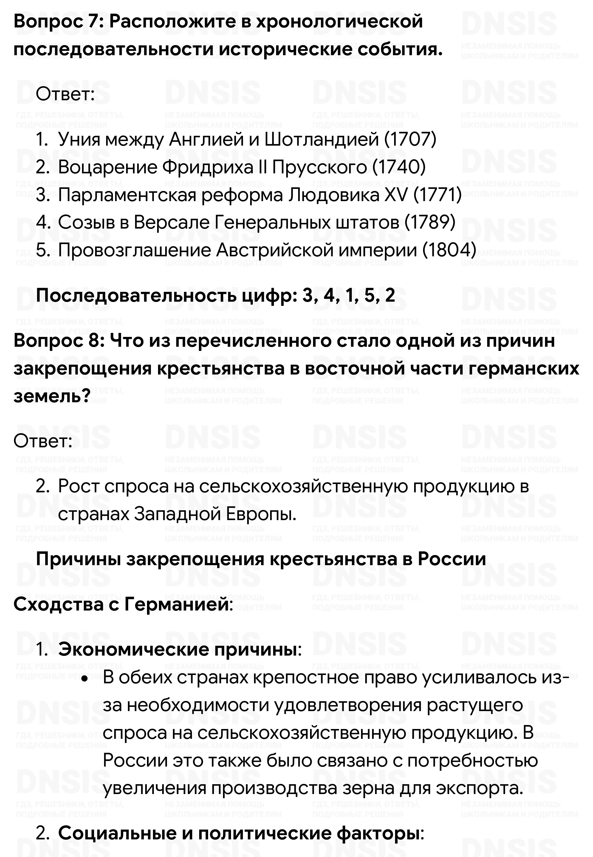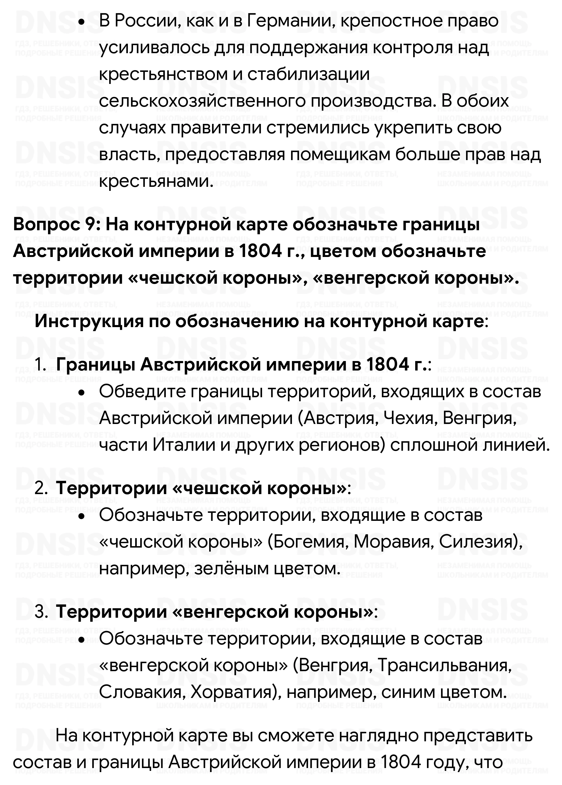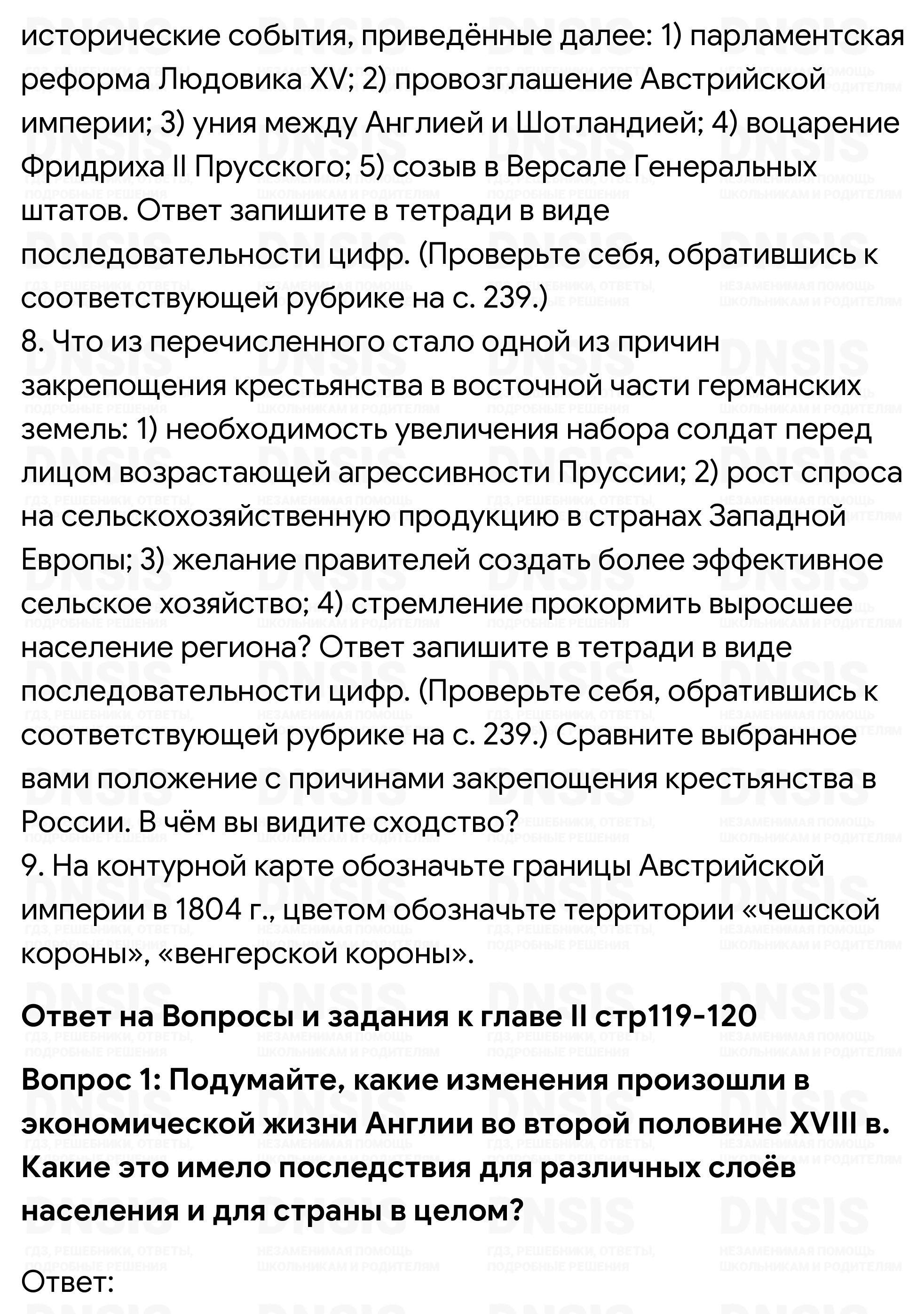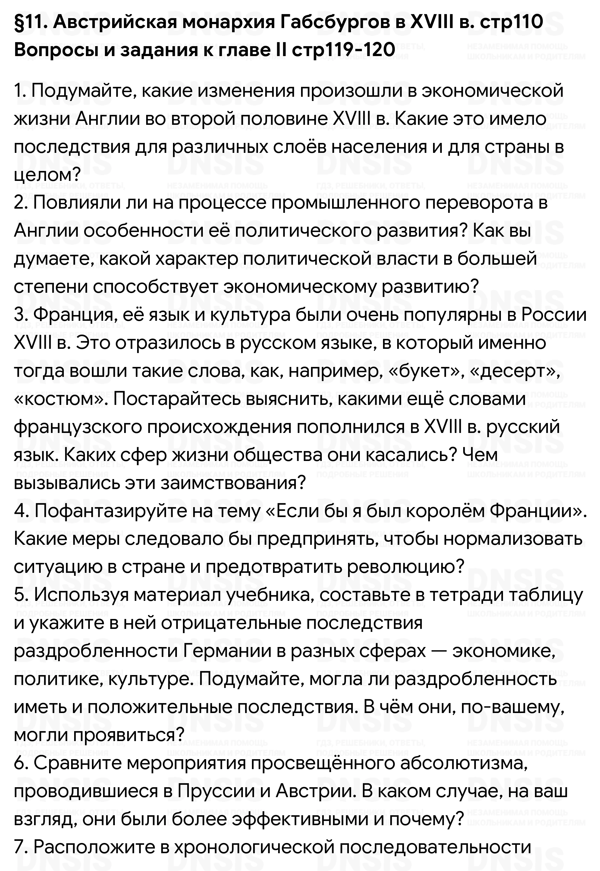 1. Подумайте, какие изменения произошли в экономической жизни Англии во второй половине XVIII в. Какие это имело последствия для различных слоёв населения и для страны в целом? 2. Повлияли ли на процессе промышленного переворота в Англии особенности её политического развития? Как вы думаете, какой характер политической власти в большей степени способствует экономическому развитию? 3. Франция, её язык и культура были очень популярны в России XVIII в. Это отразилось в русском языке, в который именно тогда вошли такие слова, как, например, «букет», «десерт», «костюм». Постарайтесь выяснить, какими ещё словами французского происхождения пополнился в XVIII в. русский язык. Каких сфер жизни общества они касались? Чем вызывались эти заимствования? 4. Пофантазируйте на тему «Если бы я был королём Франции». Какие меры следовало бы предпринять, чтобы нормализовать ситуацию в стране и предотвратить революцию? 5. Используя материал учебника, составьте в тетради таблицу и укажите в ней отрицательные последствия раздробленности Германии в разных сферах — экономике, политике, культуре. Подумайте, могла ли раздробленность иметь и положительные последствия. В чём они, по-вашему, могли проявиться? 6. Сравните мероприятия просвещённого абсолютизма, проводившиеся в Пруссии и Австрии. В каком случае, на ваш взгляд, они были более эффективными и почему? 7. Расположите в хронологической последовательности исторические события, приведённые далее: 1) парламентская реформа Людовика XV; 2) провозглашение Австрийской империи; 3) уния между Англией и Шотландией; 4) воцарение Фридриха II Прусского; 5) созыв в Версале Генеральных штатов. Ответ запишите в тетради в виде последовательности цифр. (Проверьте себя, обратившись к соответствующей рубрике на с. 239.) 8. Что из перечисленного стало одной из причин закрепощения крестьянства в восточной части германских земель: 1) необходимость увеличения набора солдат перед лицом возрастающей агрессивности Пруссии; 2) рост спроса на сельскохозяйственную продукцию в странах Западной Европы; 3) желание правителей создать более эффективное сельское хозяйство; 4) стремление прокормить выросшее население региона? Ответ запишите в тетради в виде последовательности цифр. (Проверьте себя, обратившись к соответствующей рубрике на с. 239.) Сравните выбранное вами положение с причинами закрепощения крестьянства в России. В чём вы видите сходство? 9. На контурной карте обозначьте границы Австрийской империи в 1804 г., цветом обозначьте территории «чешской короны», «венгерской короны».