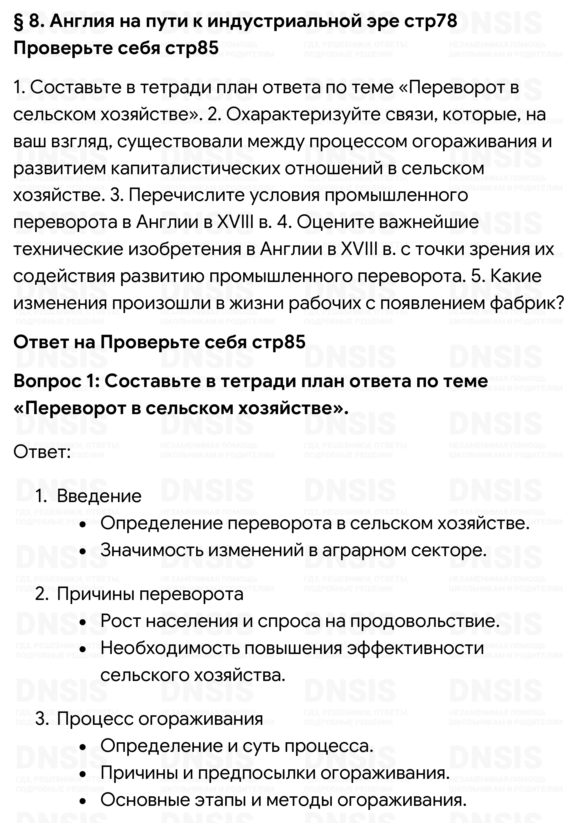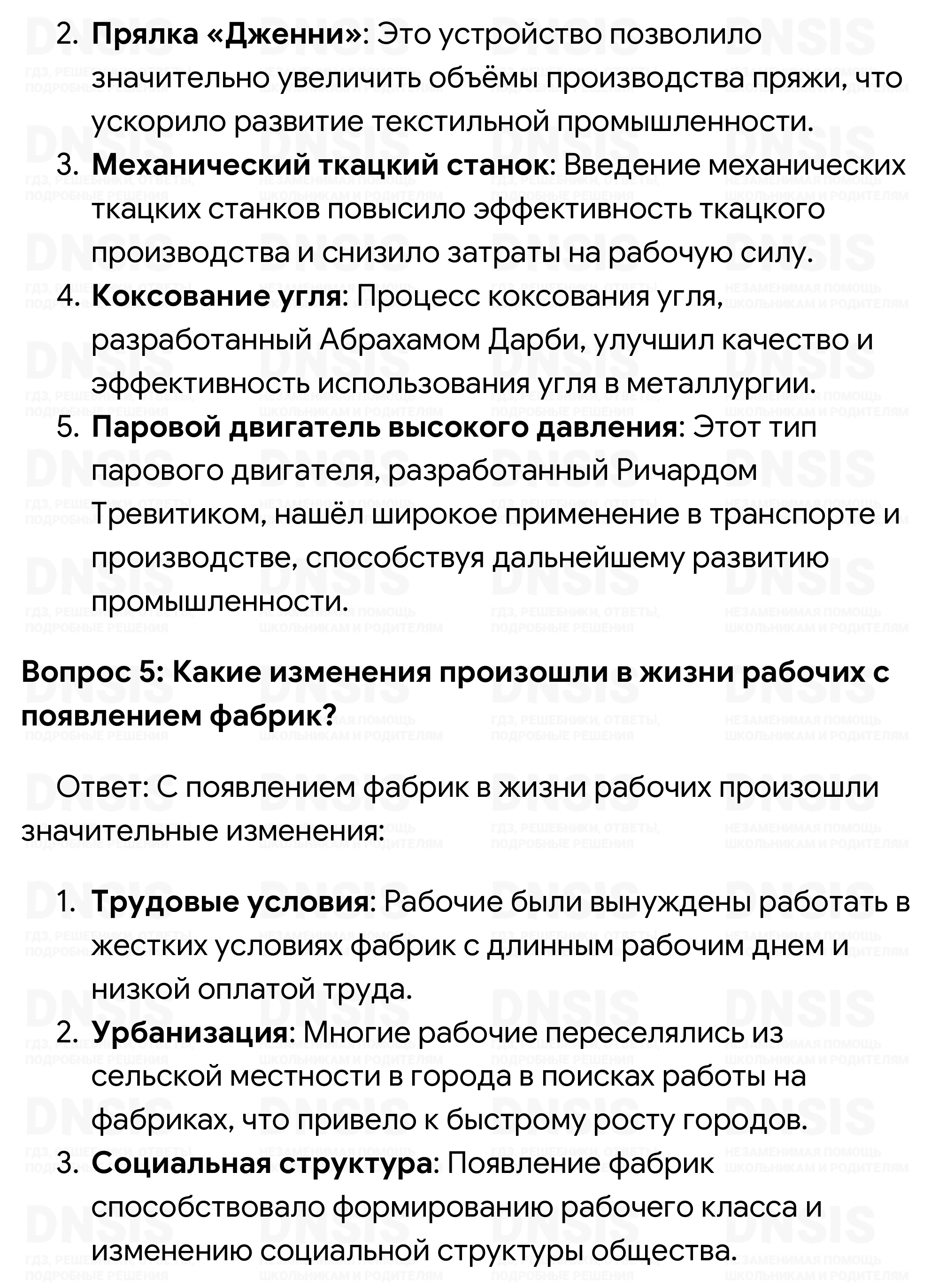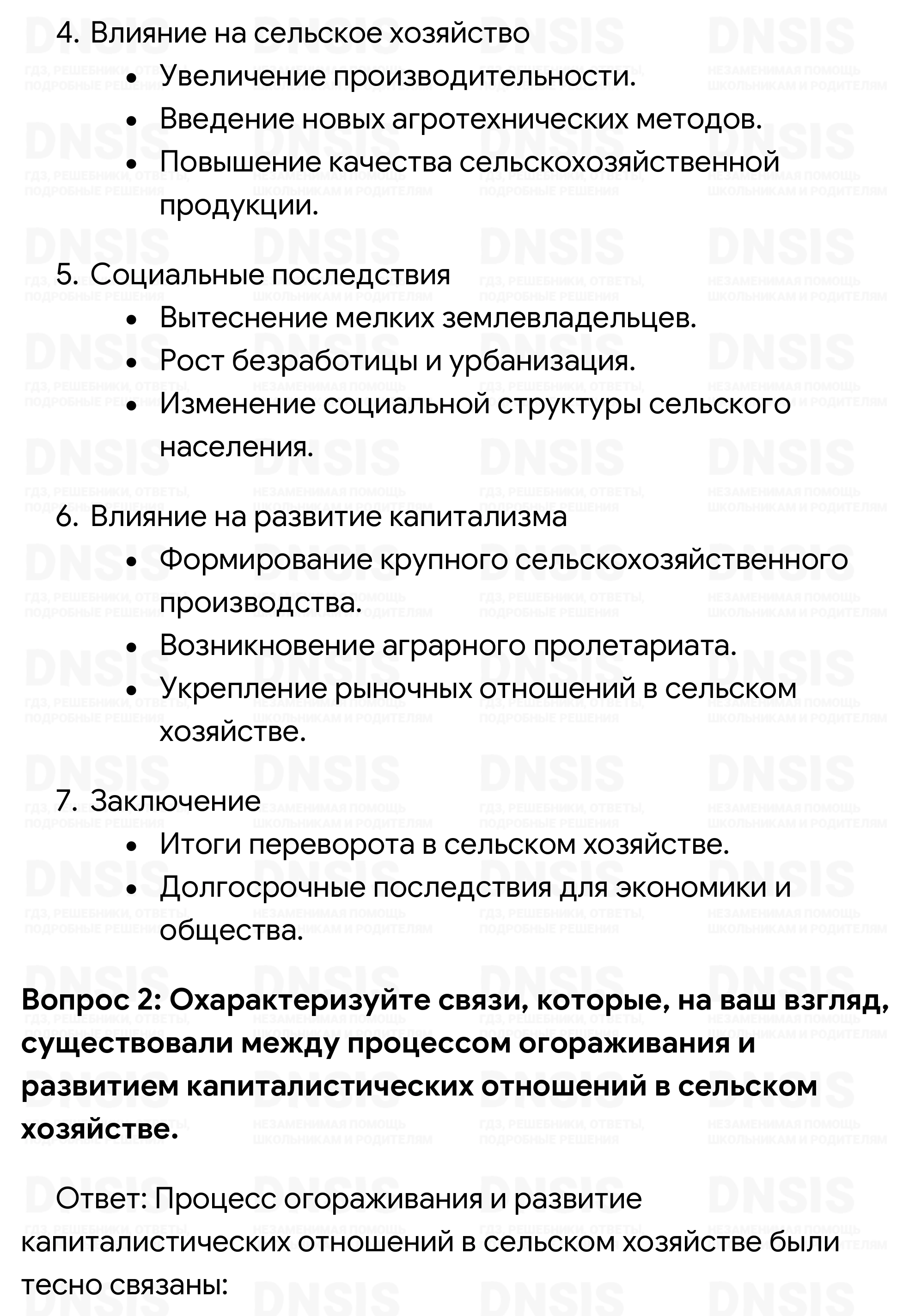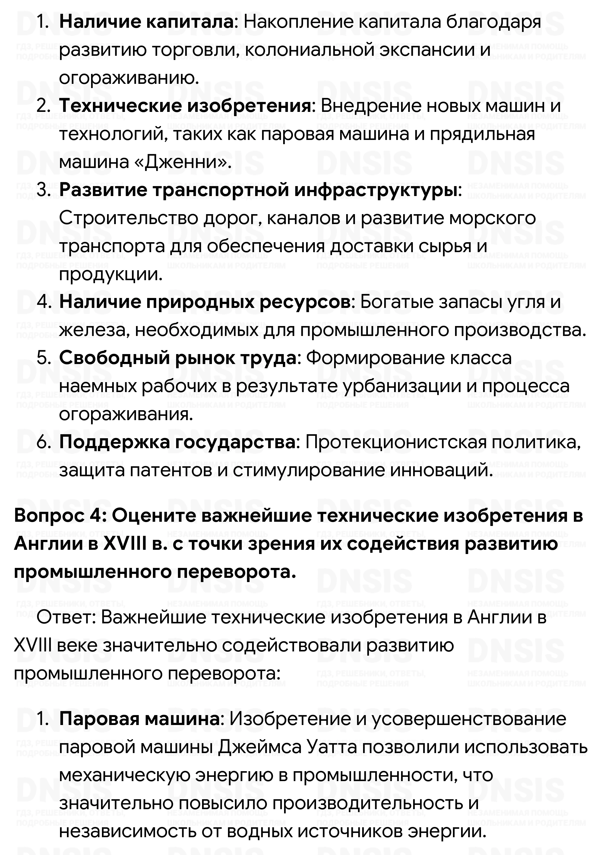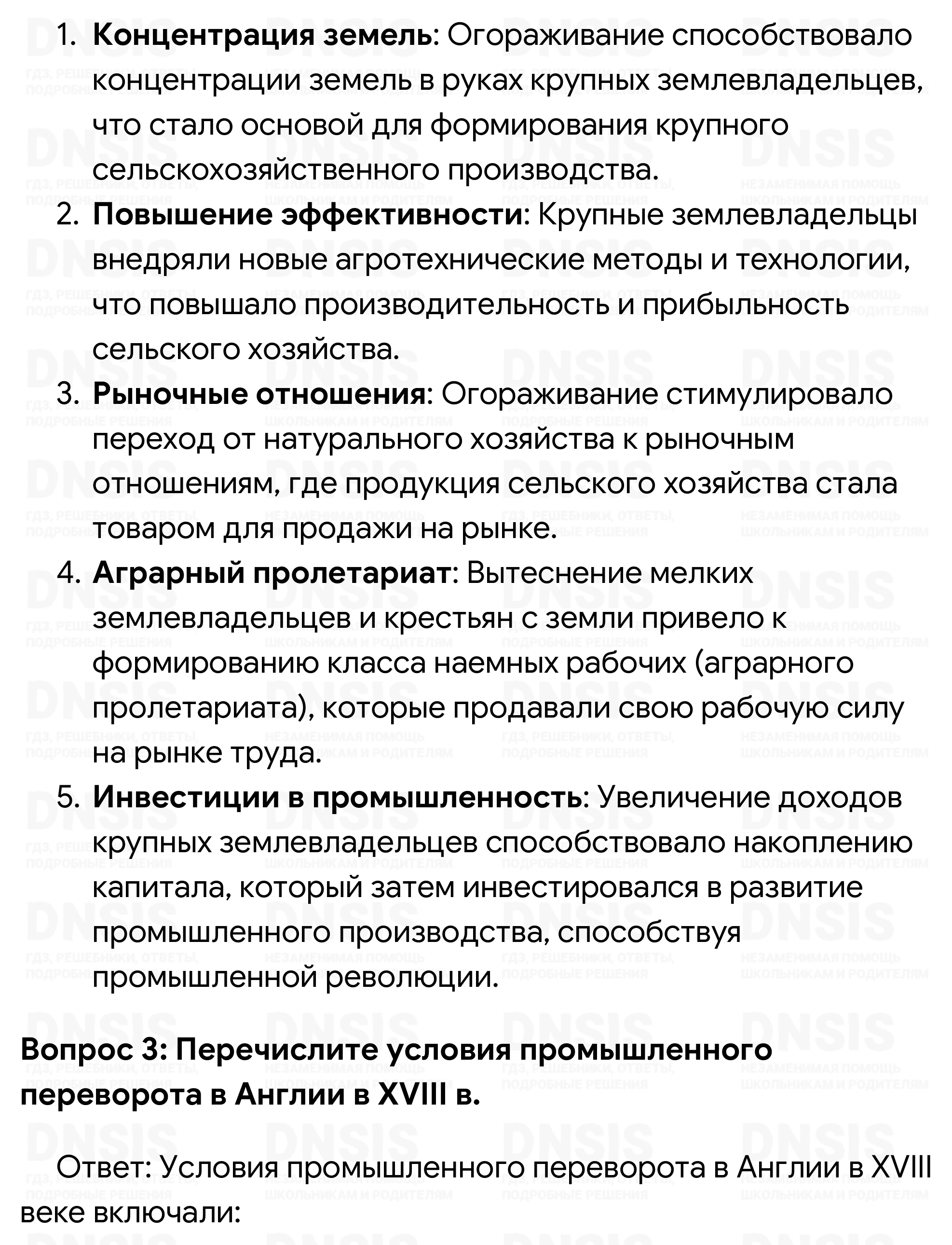 1. Составьте в тетради план ответа по теме «Переворот в сельском хозяйстве». 2. Охарактеризуйте связи, которые, на ваш взгляд, существовали между процессом огораживания и развитием капиталистических отношений в сельском хозяйстве. 3. Перечислите условия промышленного переворота в Англии в XVIII в. 4. Оцените важнейшие технические изобретения в Англии в XVIII в. с точки зрения их содействия развитию промышленного переворота. 5. Какие изменения произошли в жизни рабочих с появлением фабрик?