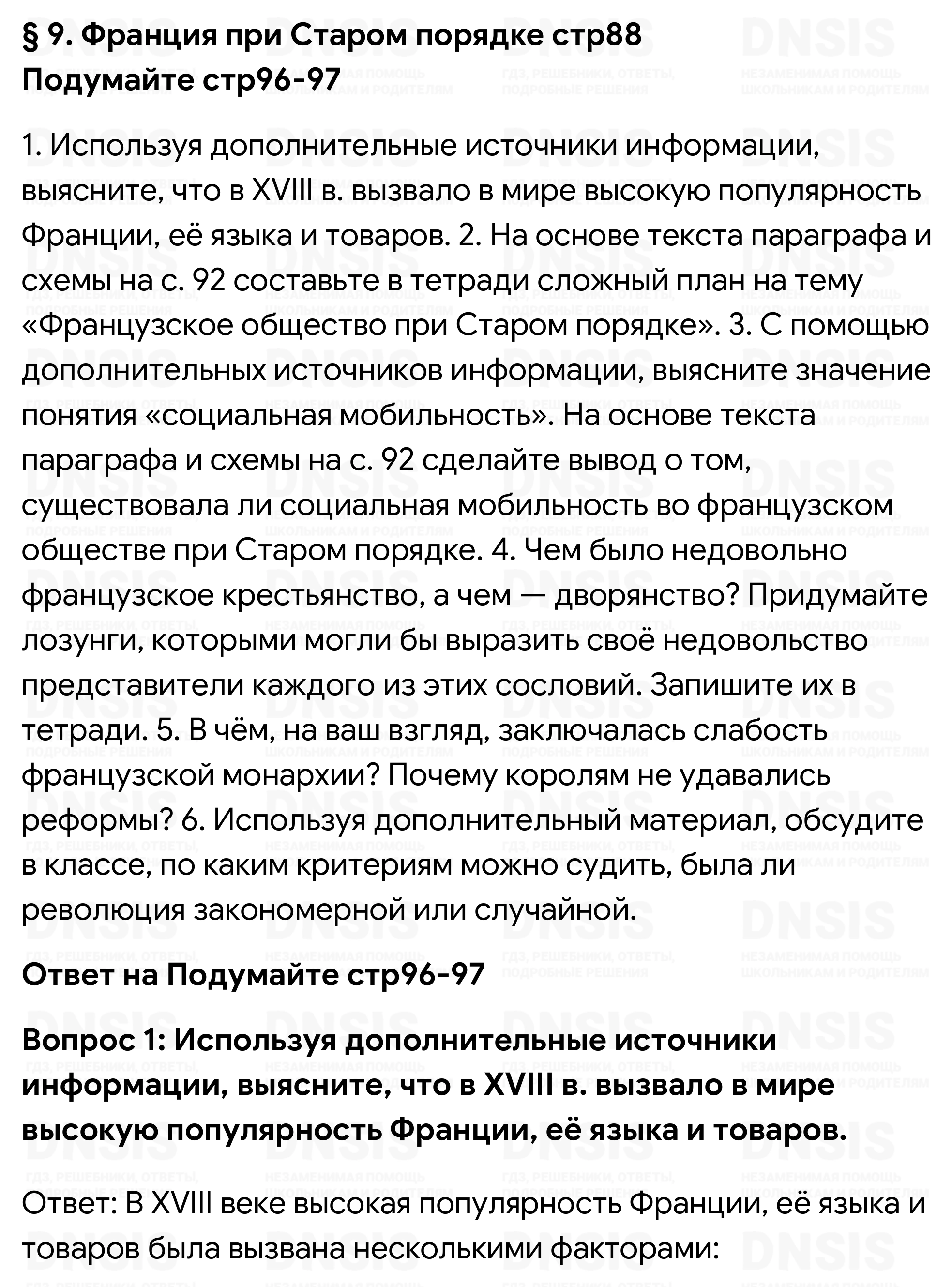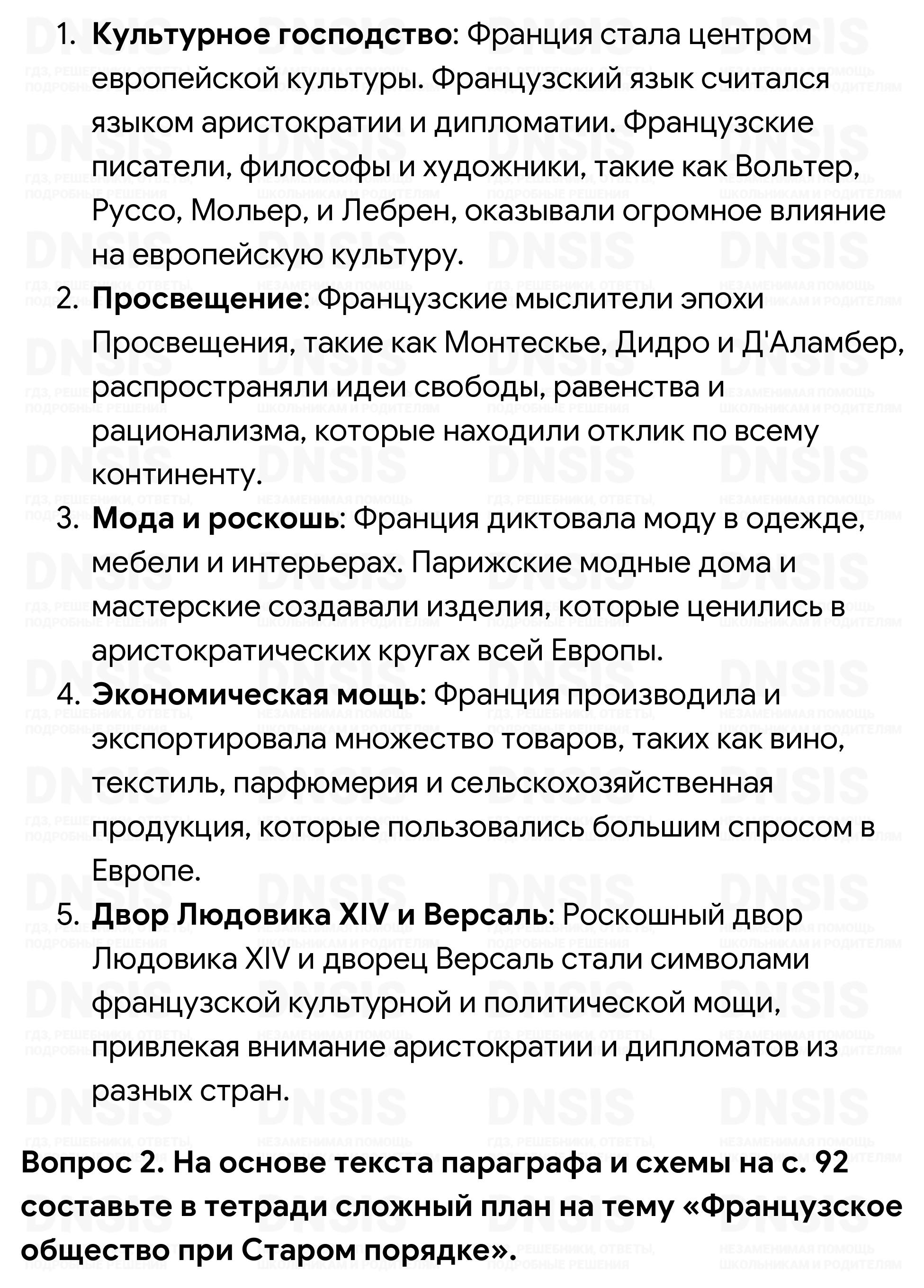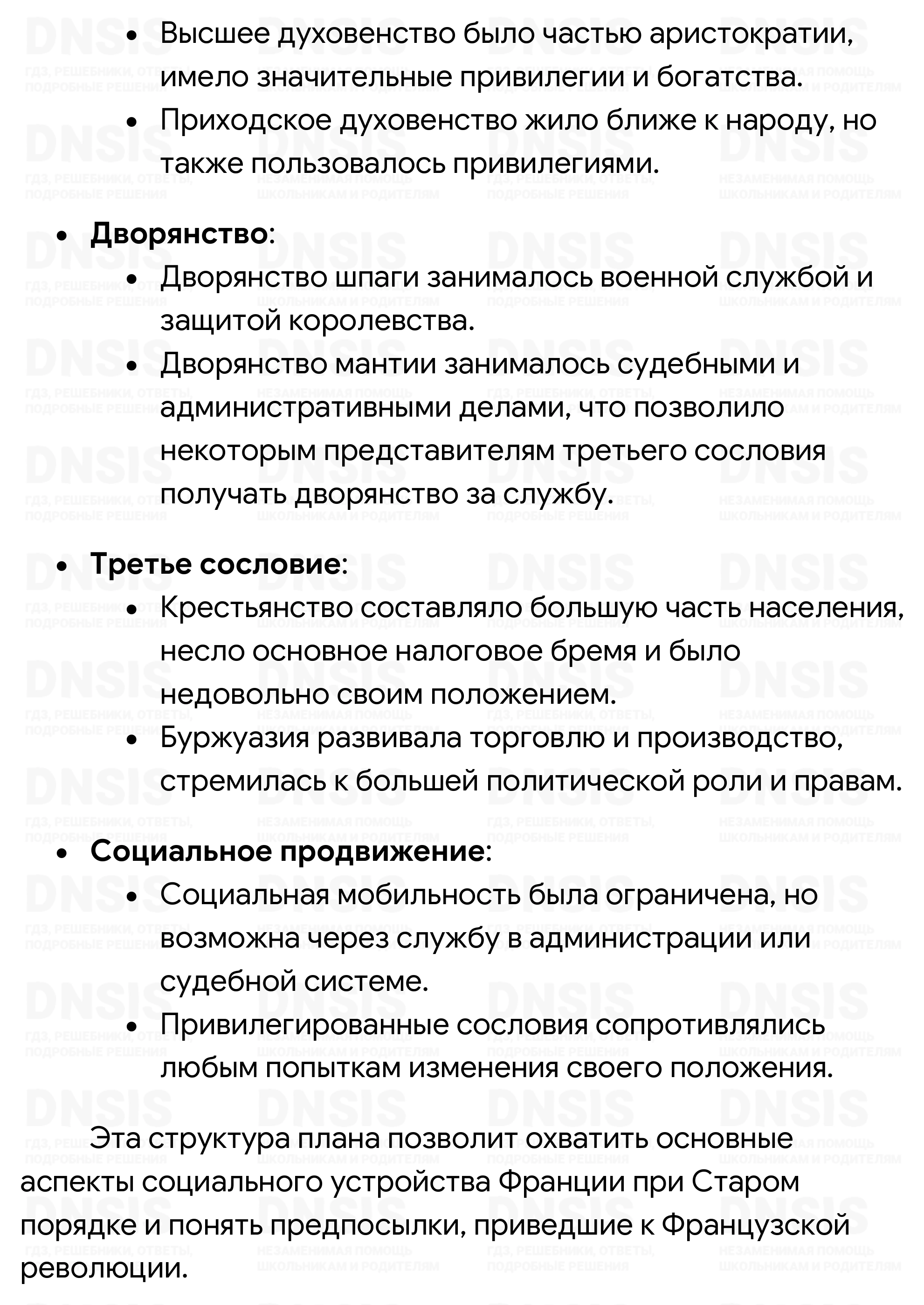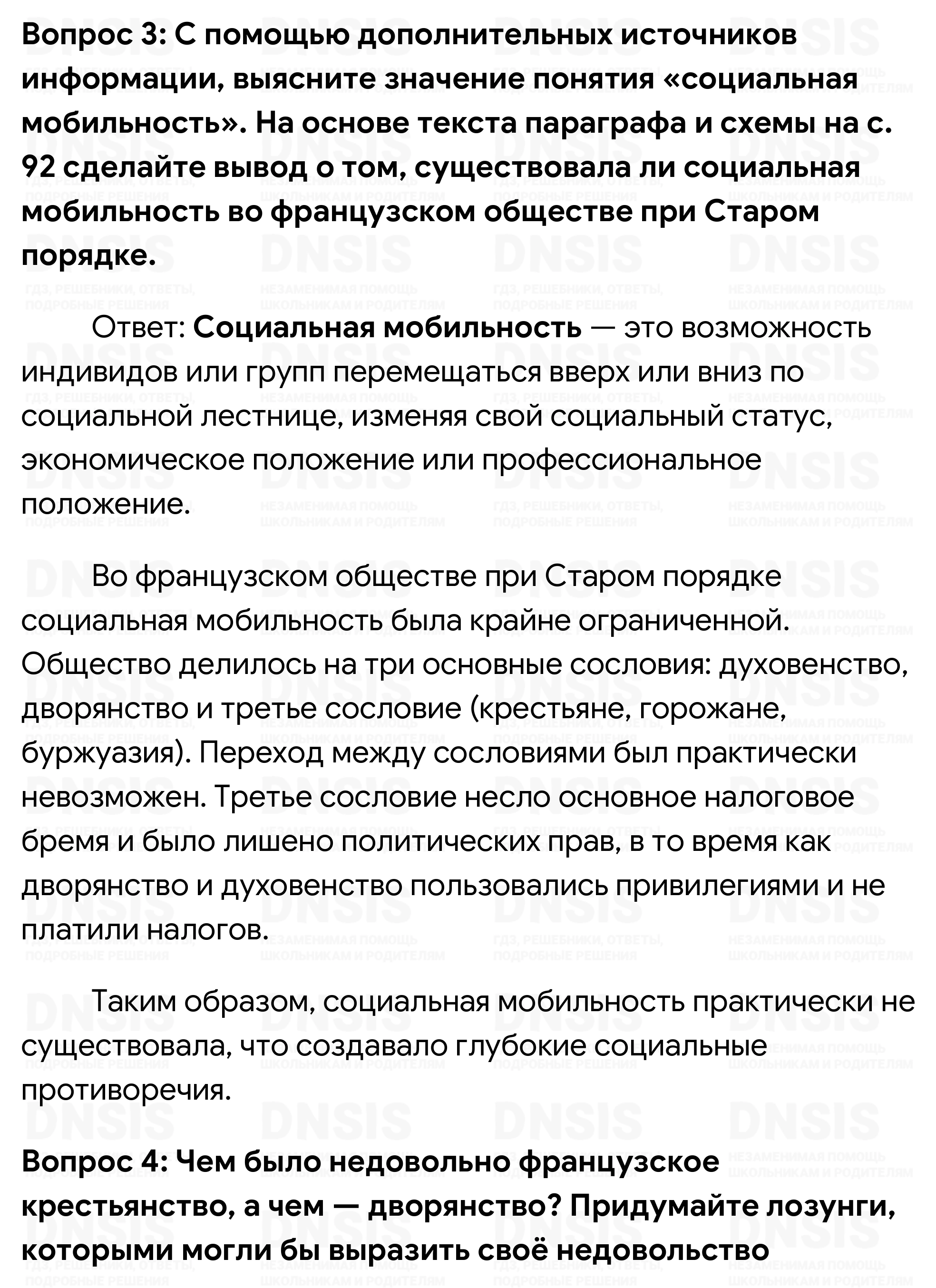1. Используя дополнительные источники информации, выясните, что в XVIII в. вызвало в мире высокую популярность Франции, её языка и товаров. 2. На основе текста параграфа и схемы на с. 92 составьте в тетради сложный план на тему «Французское общество при Старом порядке». 3. С помощью дополнительных источников информации, выясните значение понятия «социальная мобильность». На основе текста параграфа и схемы на с. 92 сделайте вывод о том, существовала ли социальная мобильность во французском обществе при Старом порядке. 4. Чем было недовольно французское крестьянство, а чем — дворянство? Придумайте лозунги, которыми могли бы выразить своё недовольство представители каждого из этих сословий. Запишите их в тетради. 5. В чём, на ваш взгляд, заключалась слабость французской монархии? Почему королям не удавались реформы? 6. Используя дополнительный материал, обсудите в классе, по каким критериям можно судить, была ли революция закономерной или случайной.