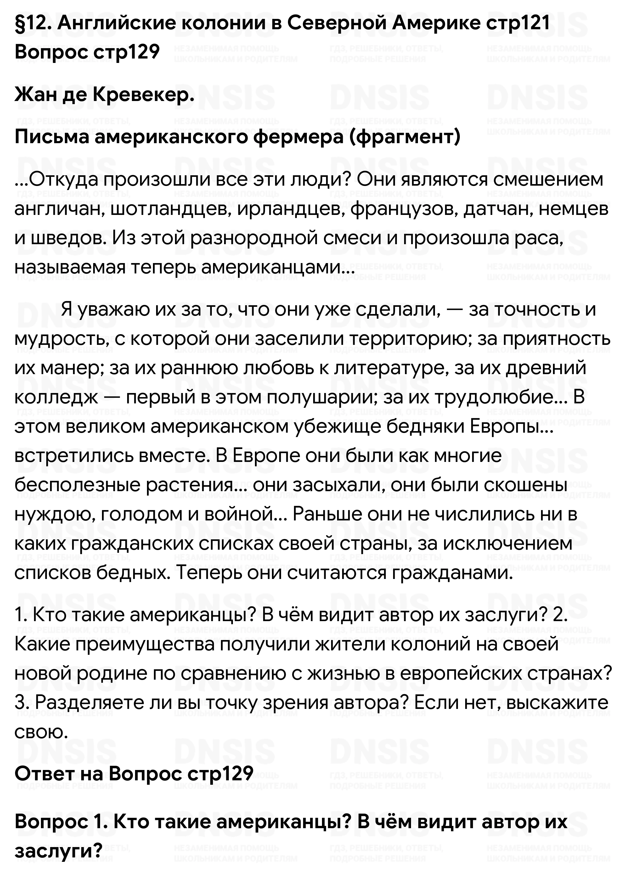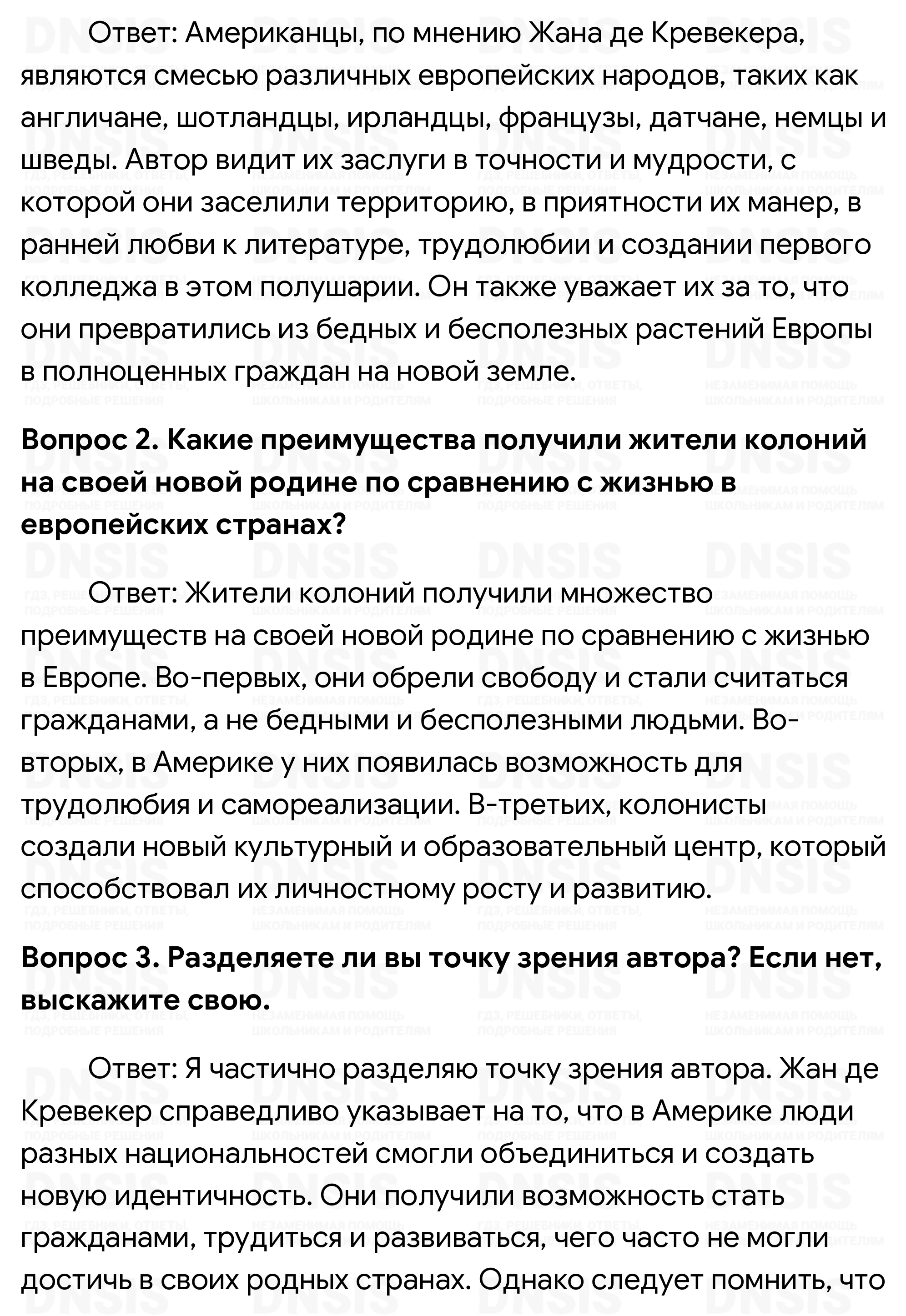 1. Кто такие американцы? В чём видит автор их заслуги? 2. Какие преимущества получили жители колоний на своей новой родине по сравнению с жизнью в европейских странах? 3. Разделяете ли вы точку зрения автора? Если нет, выскажите свою.