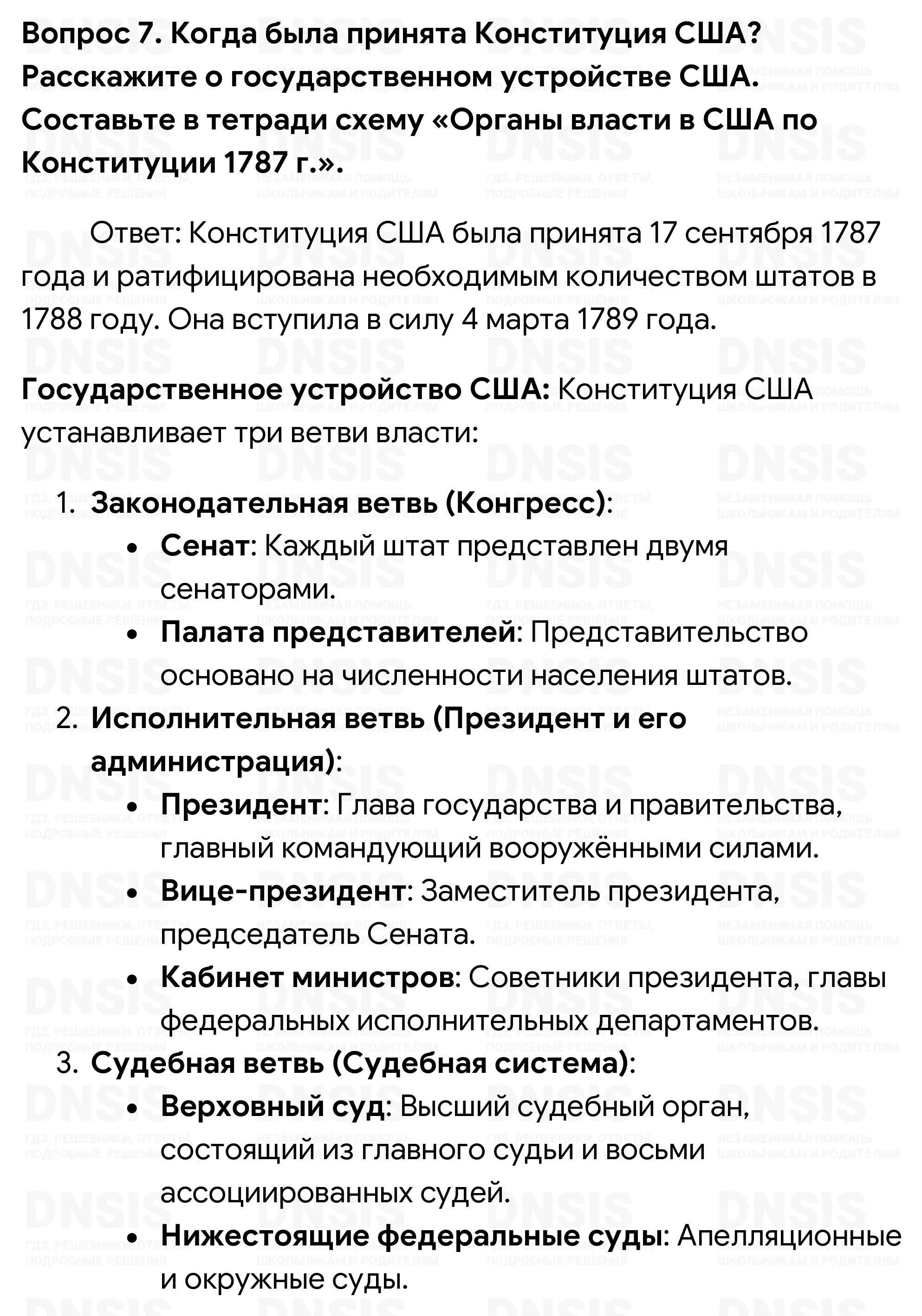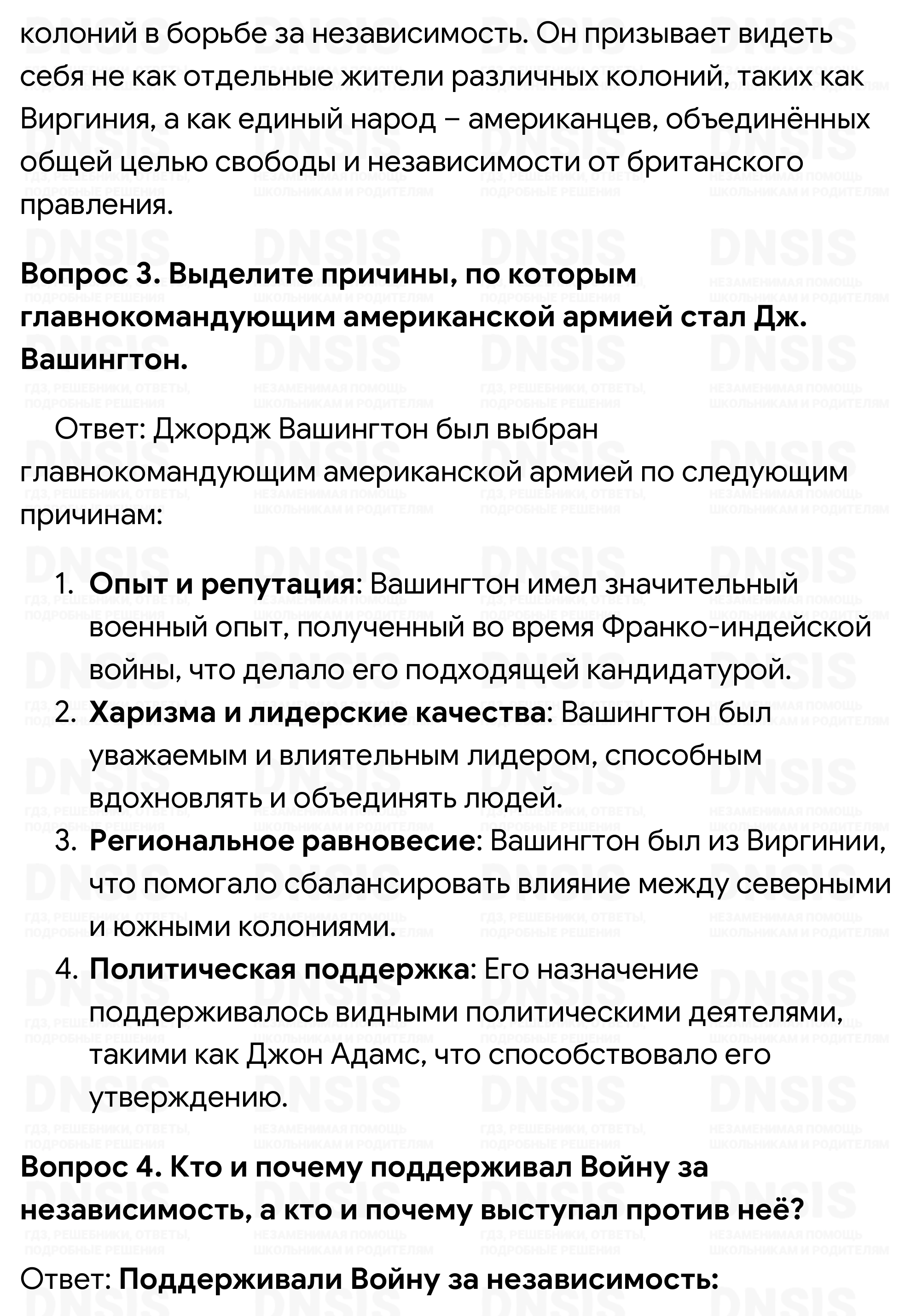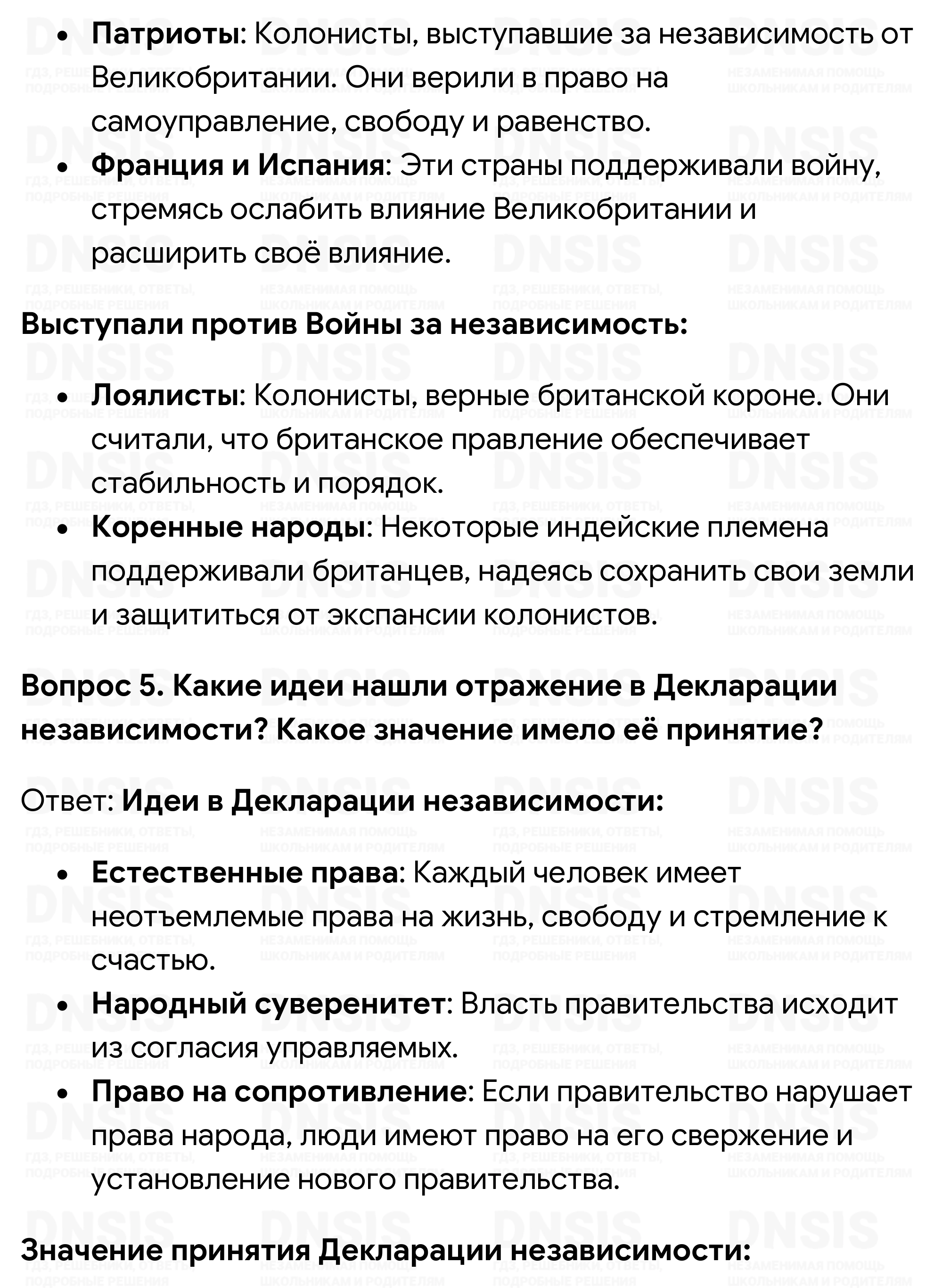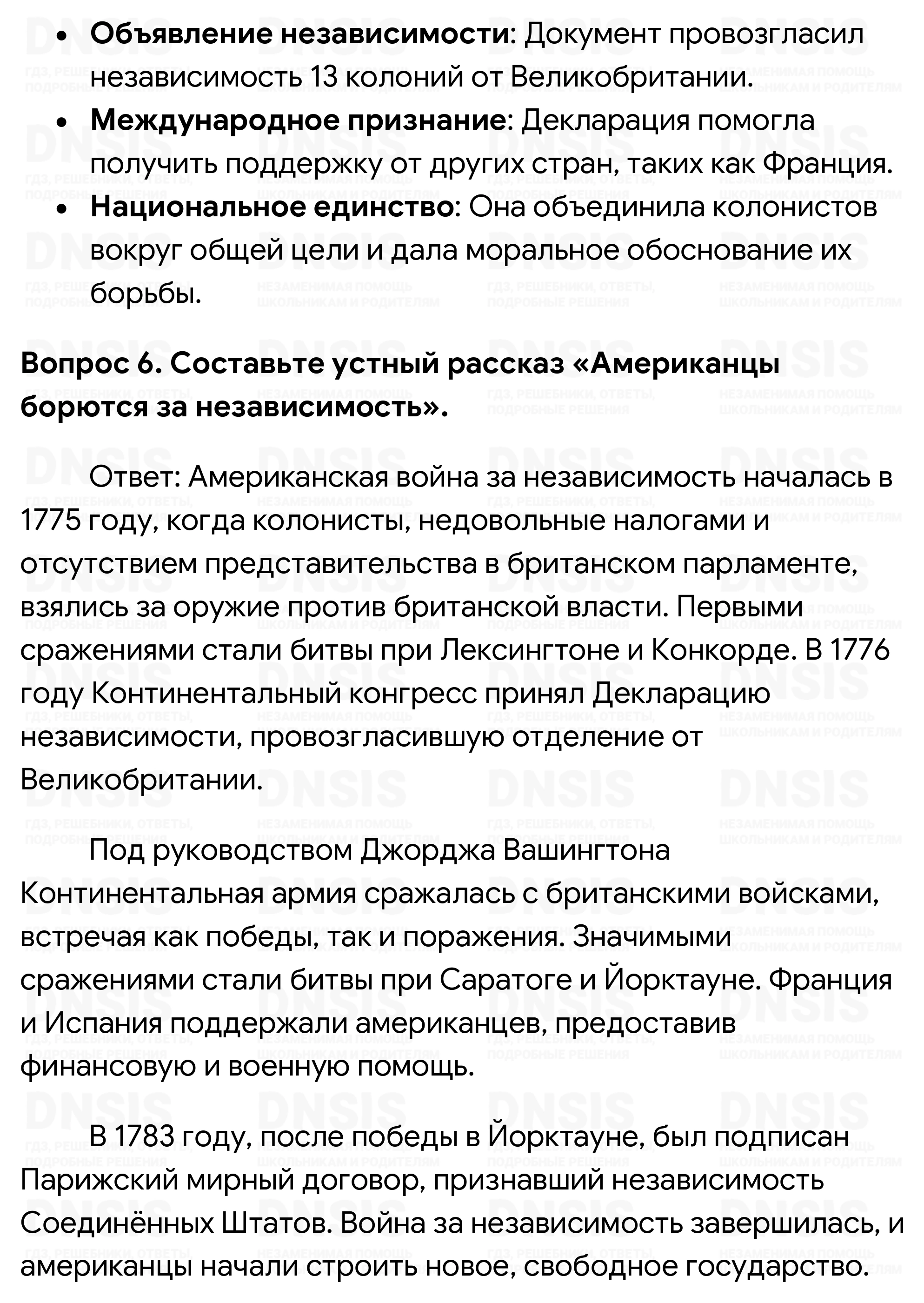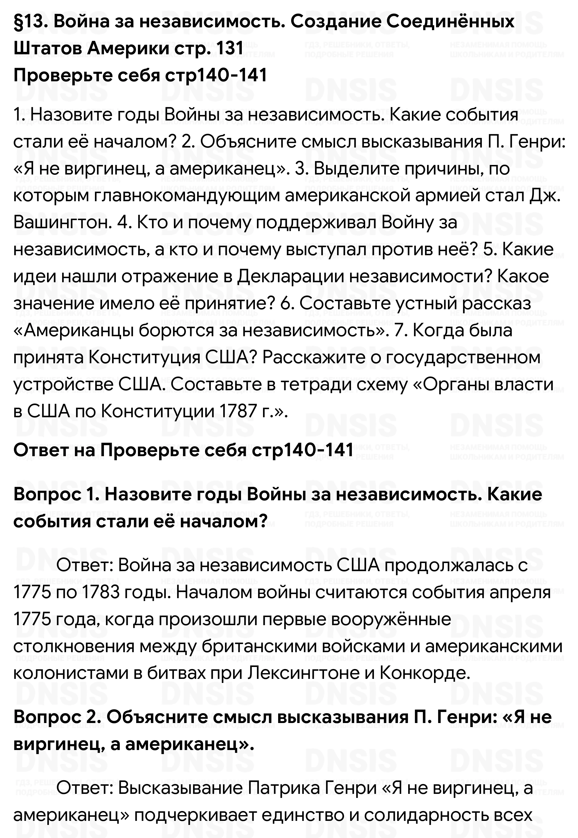 1. Назовите годы Войны за независимость. Какие события стали её началом? 2. Объясните смысл высказывания П. Генри: «Я не виргинец, а американец». 3. Выделите причины, по которым главнокомандующим американской армией стал Дж. Вашингтон. 4. Кто и почему поддерживал Войну за независимость, а кто и почему выступал против неё? 5. Какие идеи нашли отражение в Декларации независимости? Какое значение имело её принятие? 6. Составьте устный рассказ «Американцы борются за независимость». 7. Когда была принята Конституция США? Расскажите о государственном устройстве США. Составьте в тетради схему «Органы власти в США по Конституции 1787 г.».