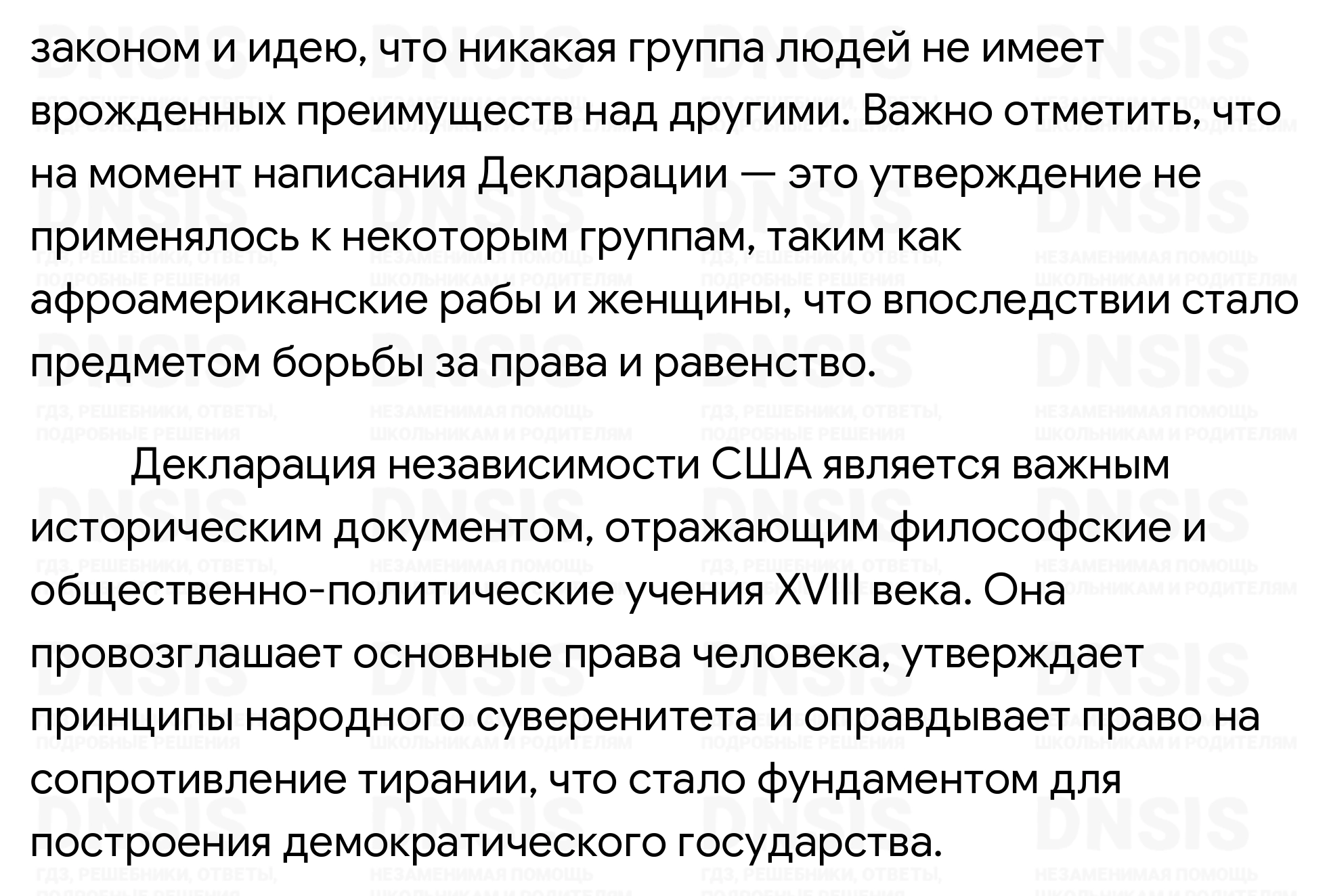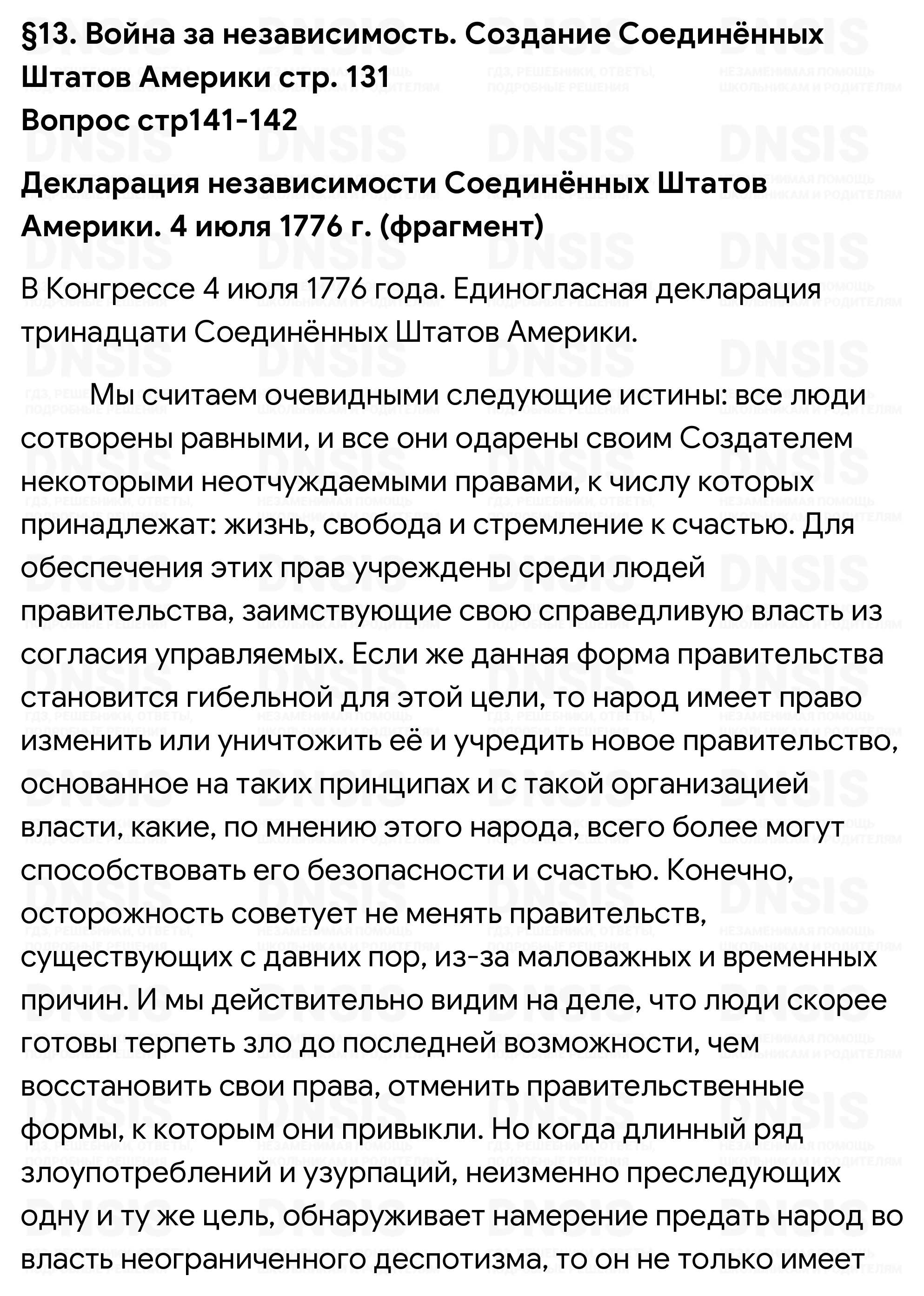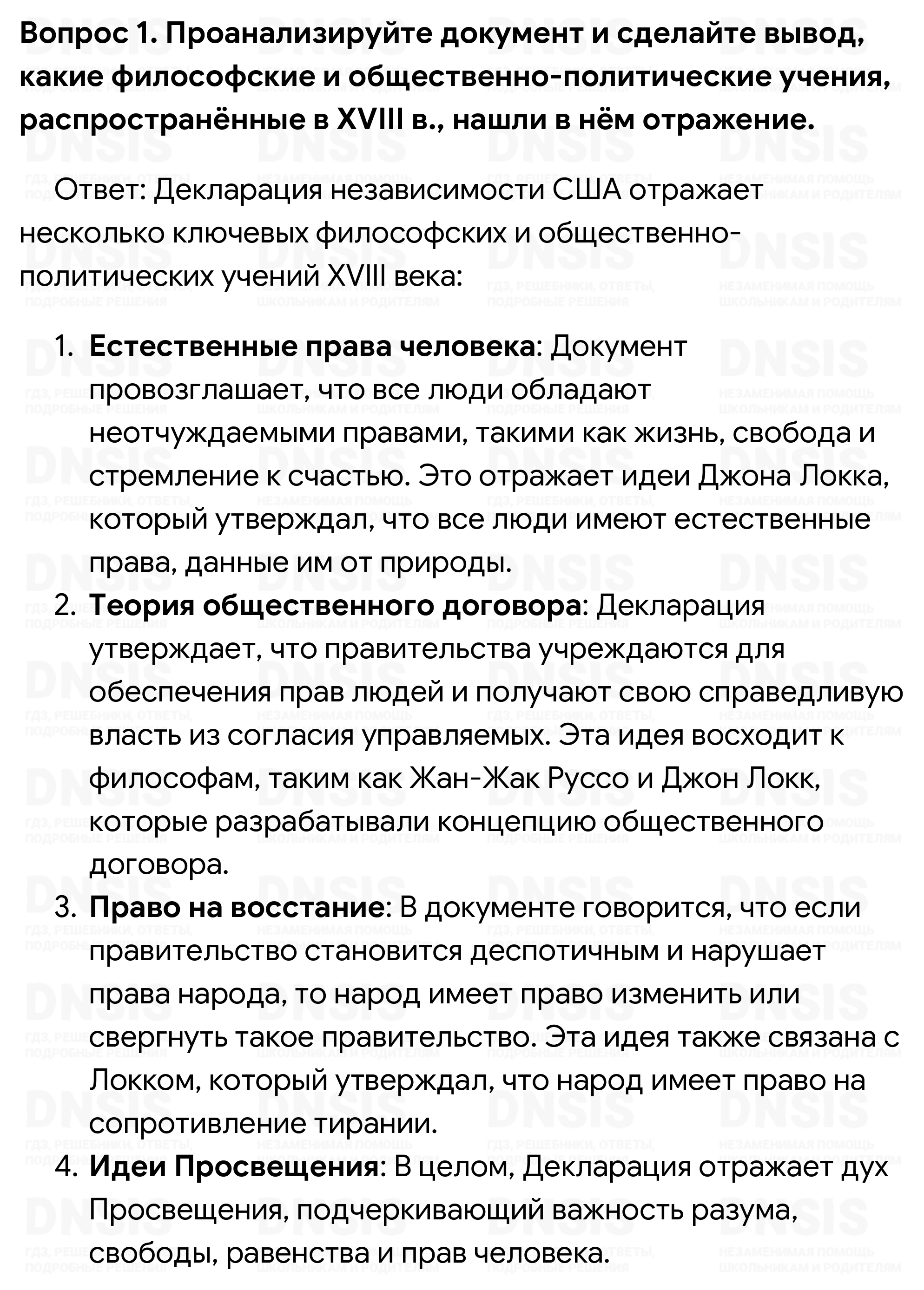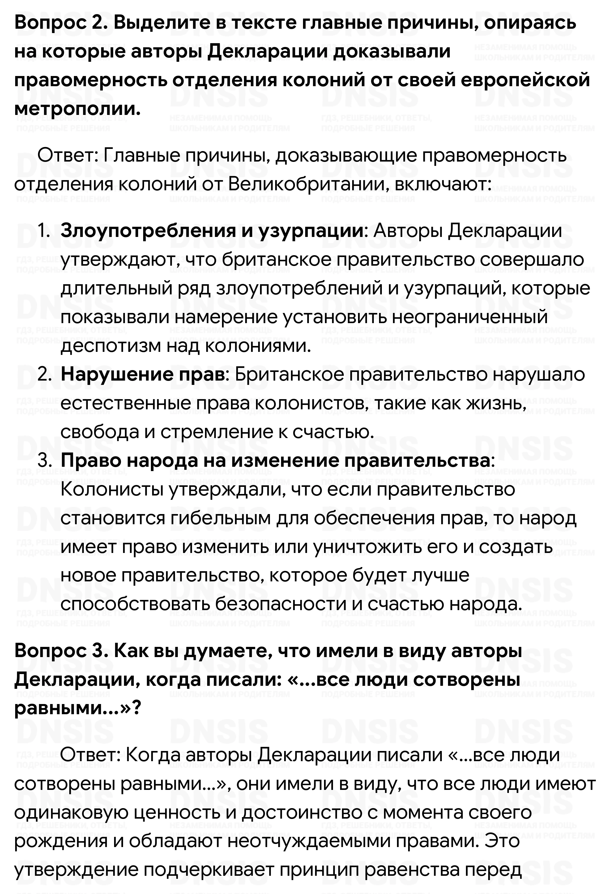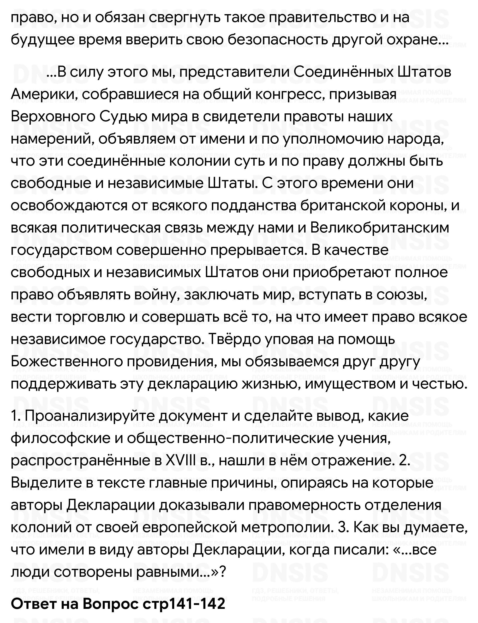 1. Проанализируйте документ и сделайте вывод, какие философские и общественно-политические учения, распространённые в XVIII в., нашли в нём отражение. 2. Выделите в тексте главные причины, опираясь на которые авторы Декларации доказывали правомерность отделения колоний от своей европейской метрополии. 3. Как вы думаете, что имели в виду авторы Декларации, когда писали: «...все люди сотворены равными...»?