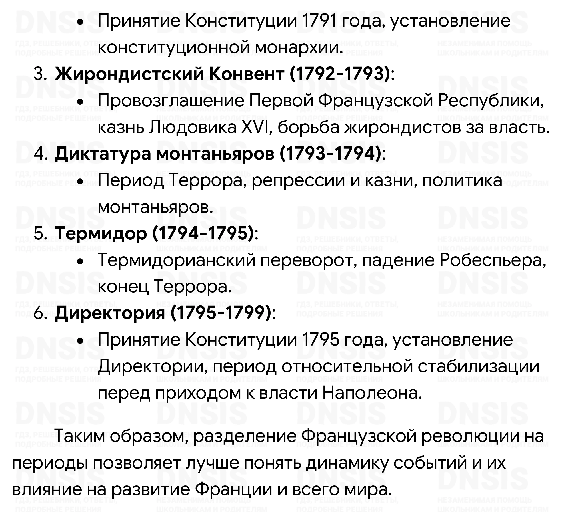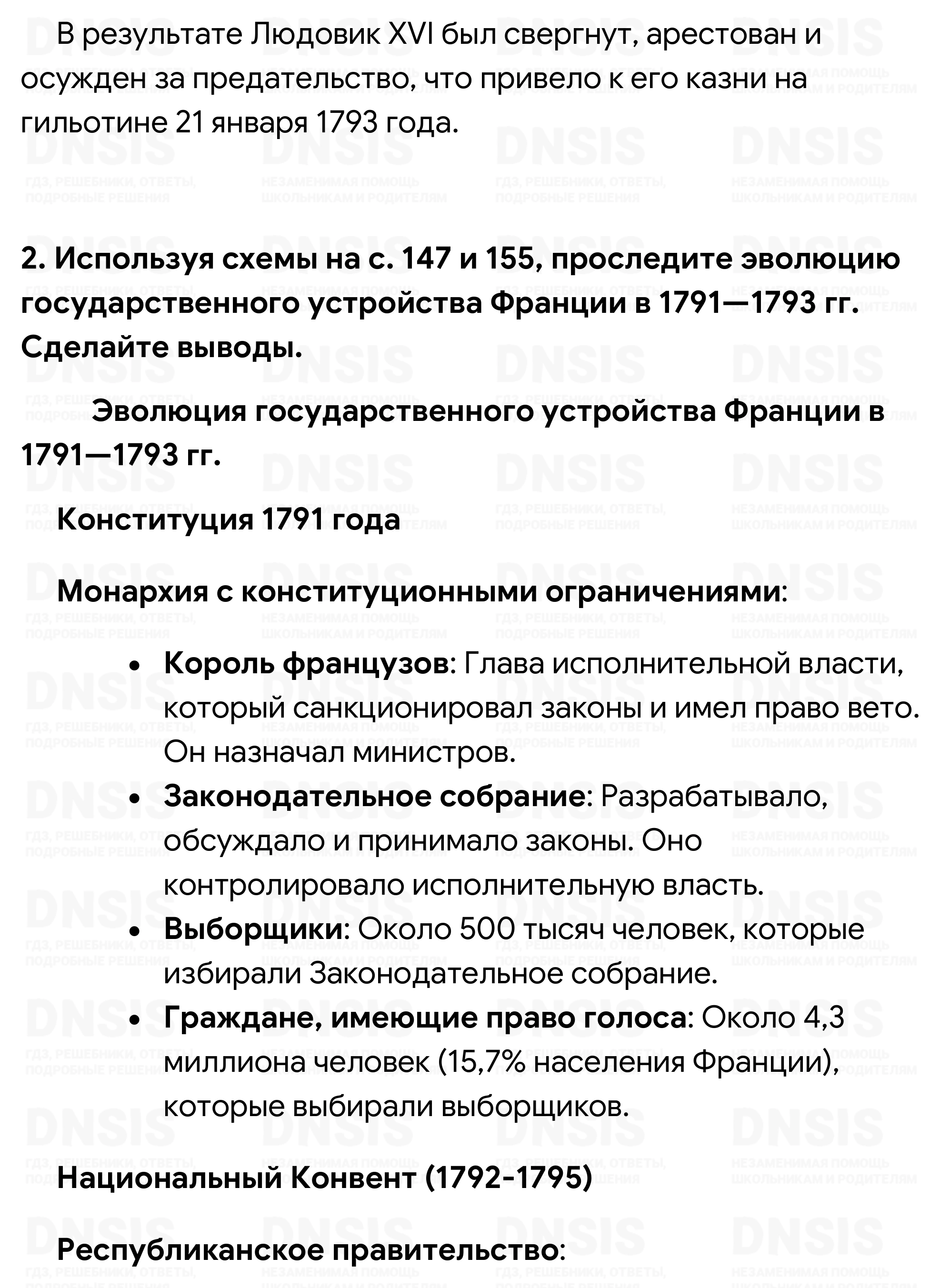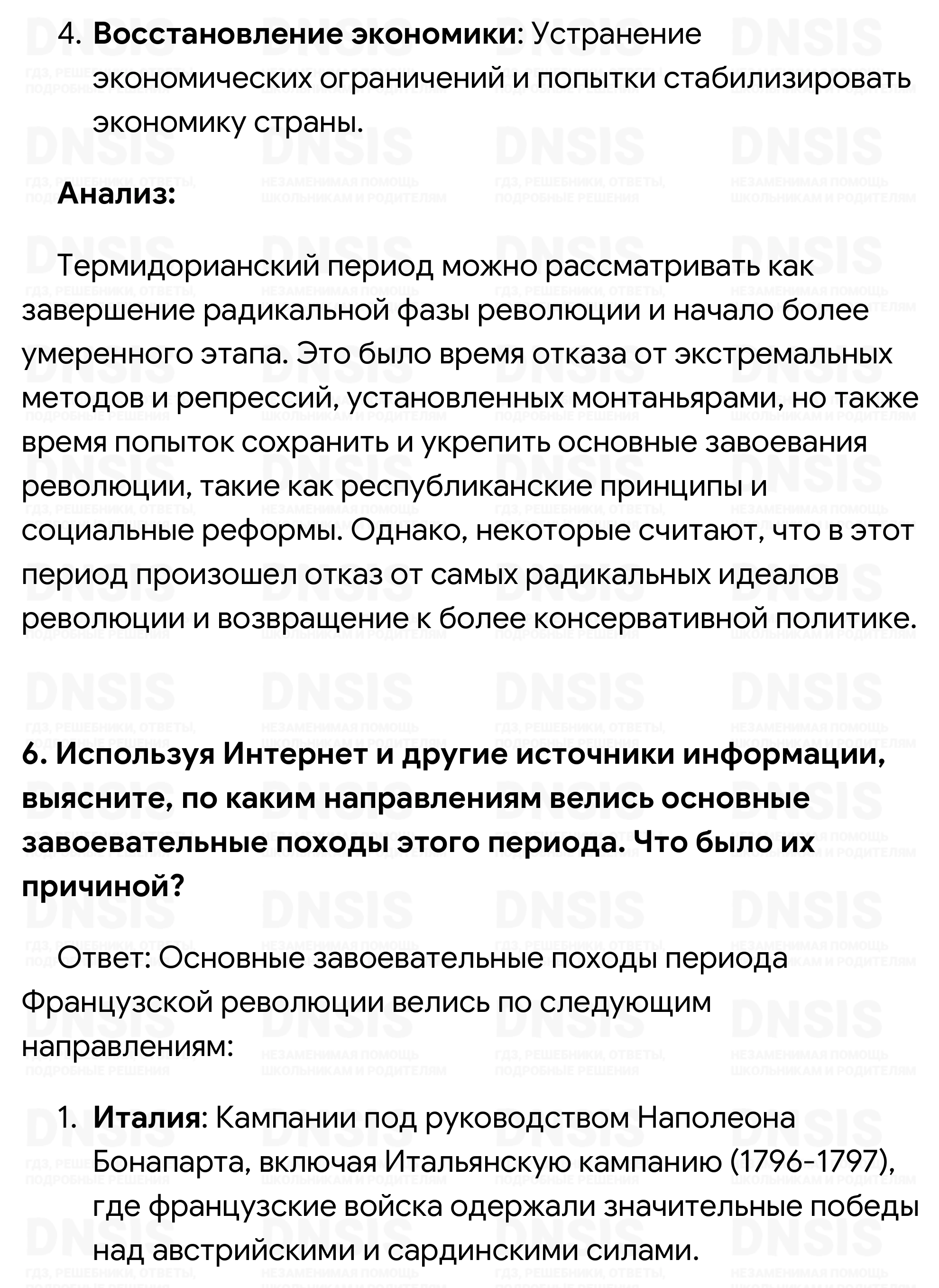 1. Почему, с вашей точки зрения, Людовик XVI утратил власть и лишился жизни? 2. Используя схемы на с. 147 и 155, проследите эволюцию государственного устройства Франции в 1791—1793 гг. Сделайте выводы. 3. Почему диктатуру монтаньяров называют диктатурой? Смогла ли она решить стоявшие перед ней задачи? 4. Используя дополнительные источники информации, подготовьте рассказ об одном из деятелей революции. 5. Используя дополнительные источники информации, подготовьте рассказ о термидорианском периоде революции и его основных событиях. Проанализируйте, чем было это время: завершением революции или отказом от её завоеваний. 6. Используя Интернет и другие источники информации, выясните, по каким направлениям велись основные завоевательные походы этого периода. Что было их причиной? 7. Каковы, по-вашему, наиболее важные итоги революции? Как она повлияла на жизнь Франции и всей Европы? 8. Объясните, по каким критериям ряд историков делит Французскую революцию на периоды. Например: начало Революции, конституционная монархия, жирондистский Конвент, диктатура монтаньяров, Термидор, Директория.