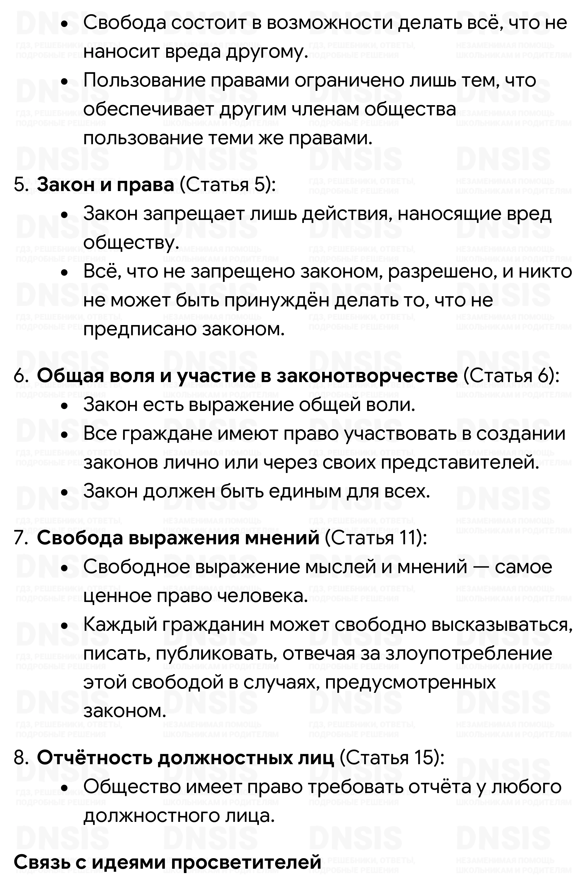 Статья 4. Свобода состоит в возможности делать всё, что не наносит вреда другому: таким образом, пользование каждого человека естественными правами ограничено лишь тем, что обеспечивает другим членам общества пользование теми же правами. Пределы эти могут быть определены лишь законом.