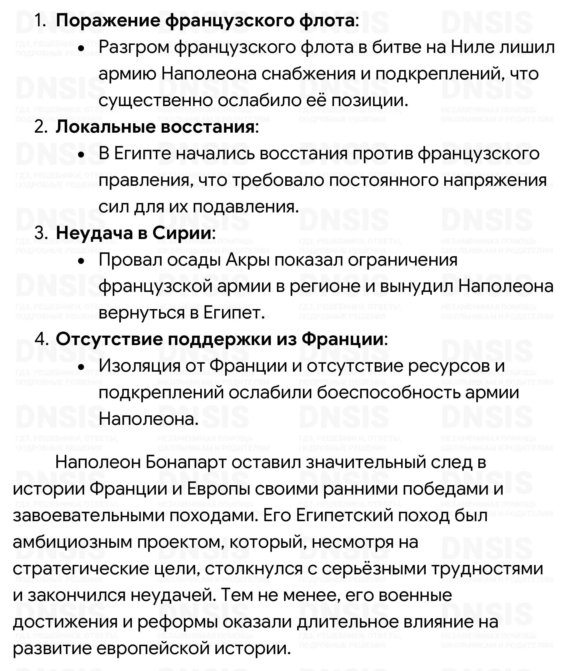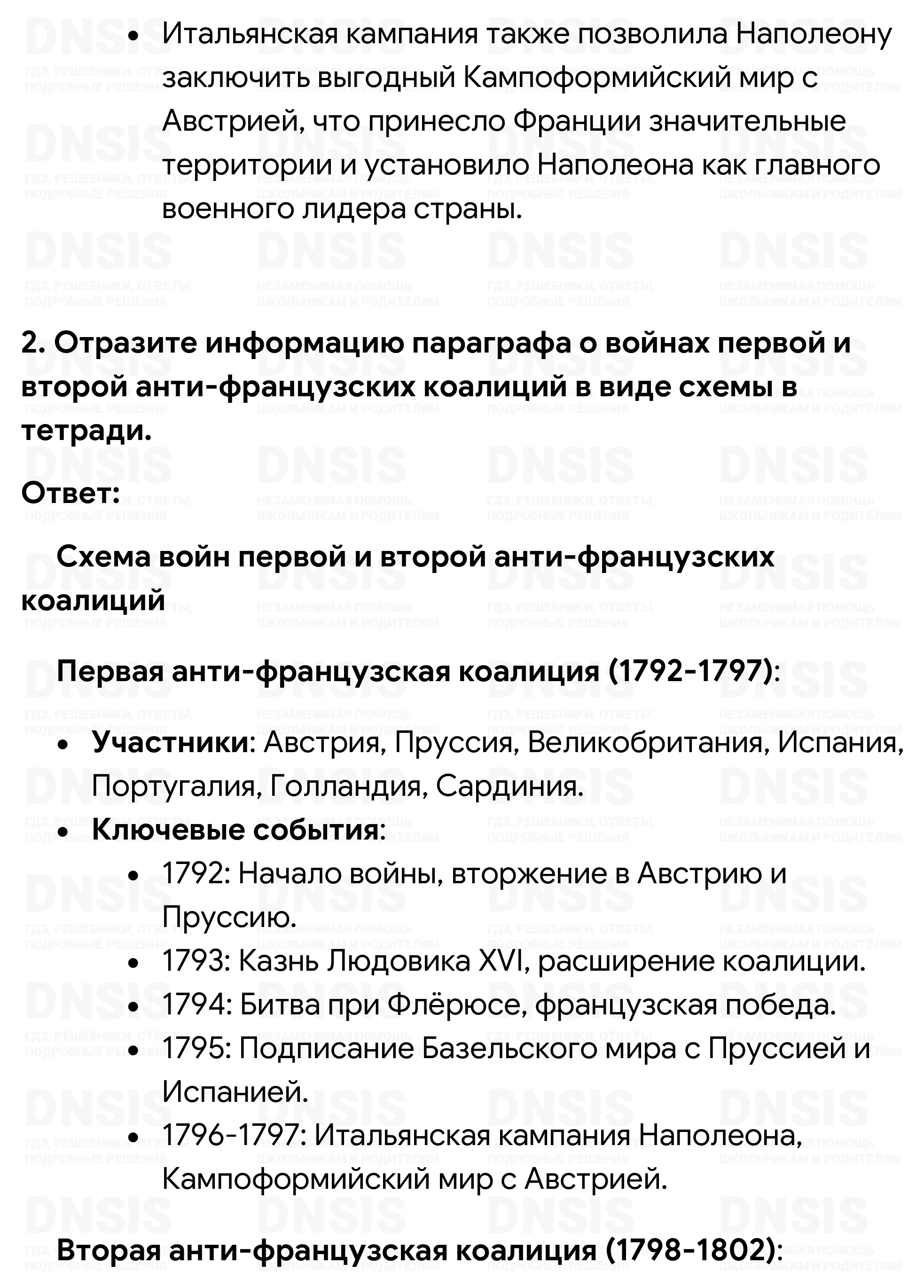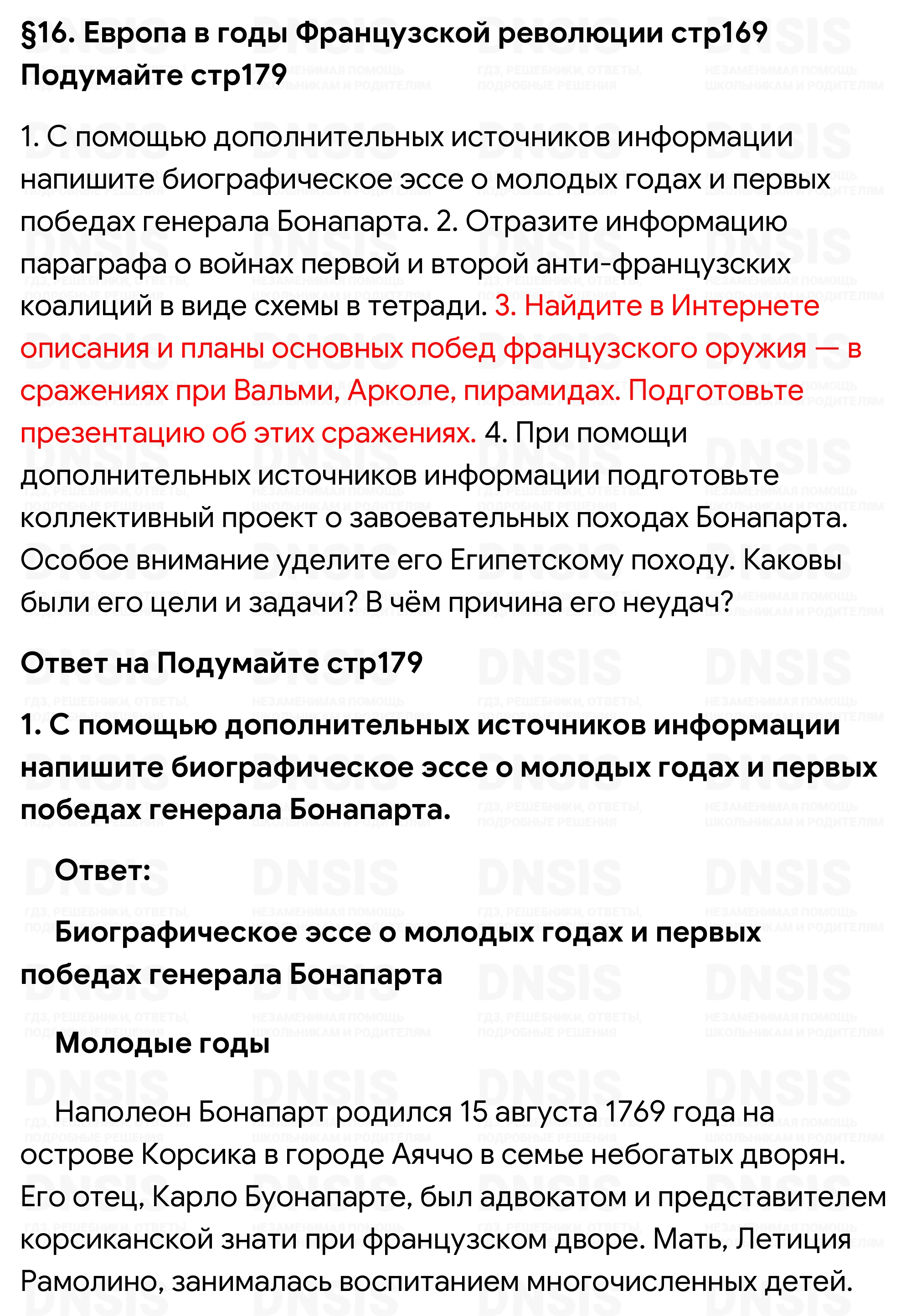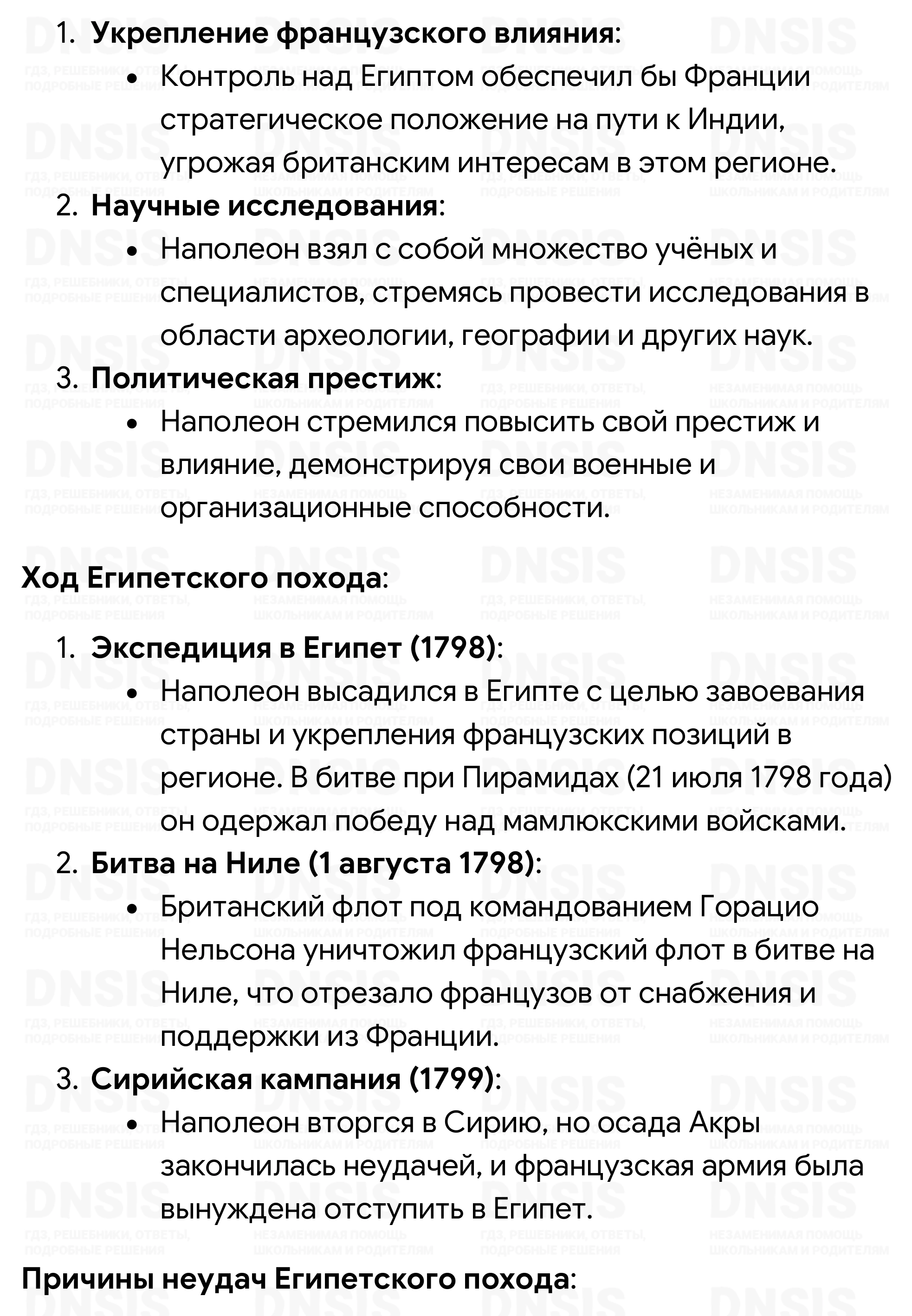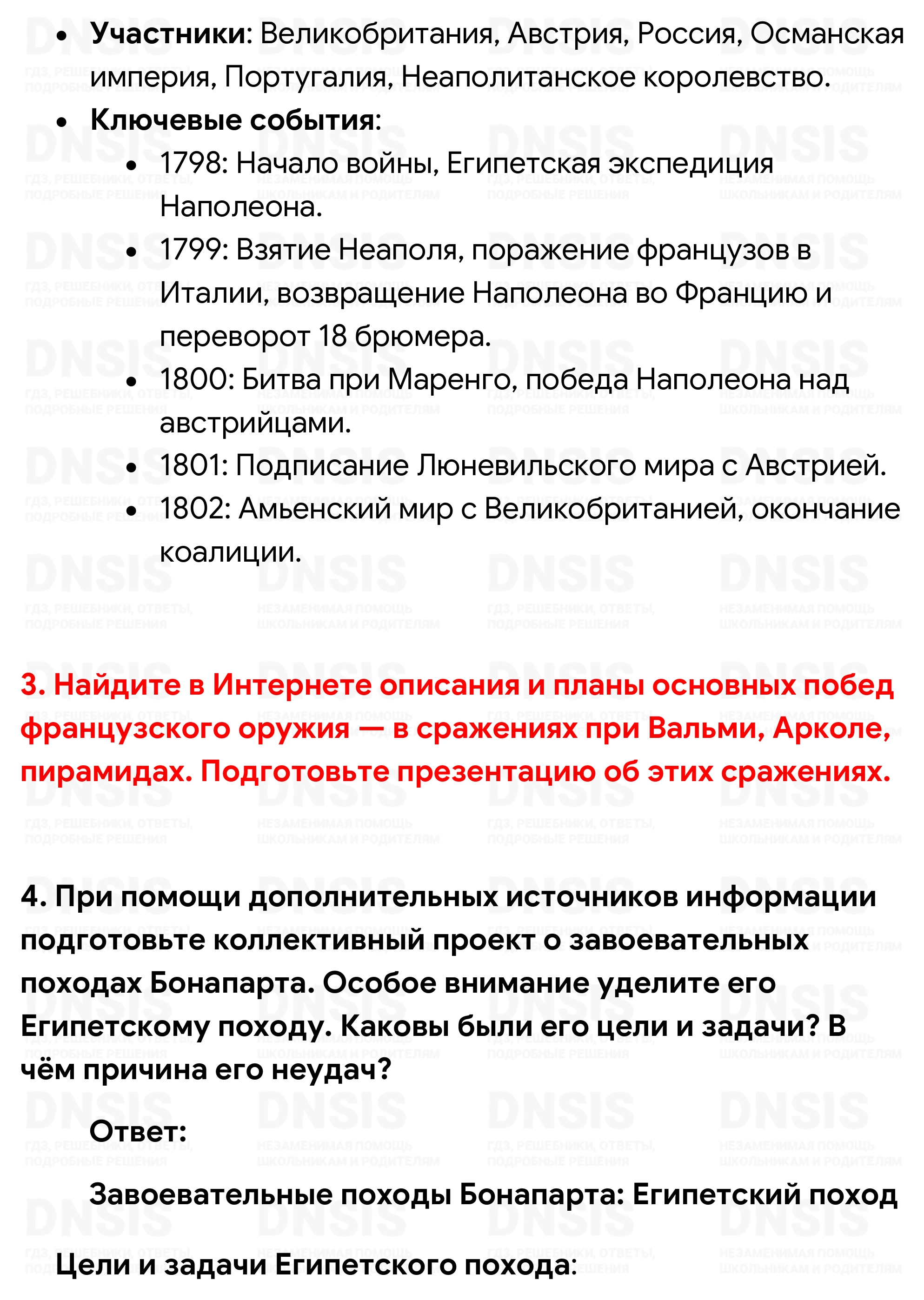 1. С помощью дополнительных источников информации напишите биографическое эссе о молодых годах и первых победах генерала Бонапарта. 2. Отразите информацию параграфа о войнах первой и второй анти-французских коалиций в виде схемы в тетради. 3. Найдите в Интернете описания и планы основных побед французского оружия — в сражениях при Вальми, Арколе, пирамидах. Подготовьте презентацию об этих сражениях. 4. При помощи дополнительных источников информации подготовьте коллективный проект о завоевательных походах Бонапарта. Особое внимание уделите его Египетскому походу. Каковы были его цели и задачи? В чём причина его неудач?