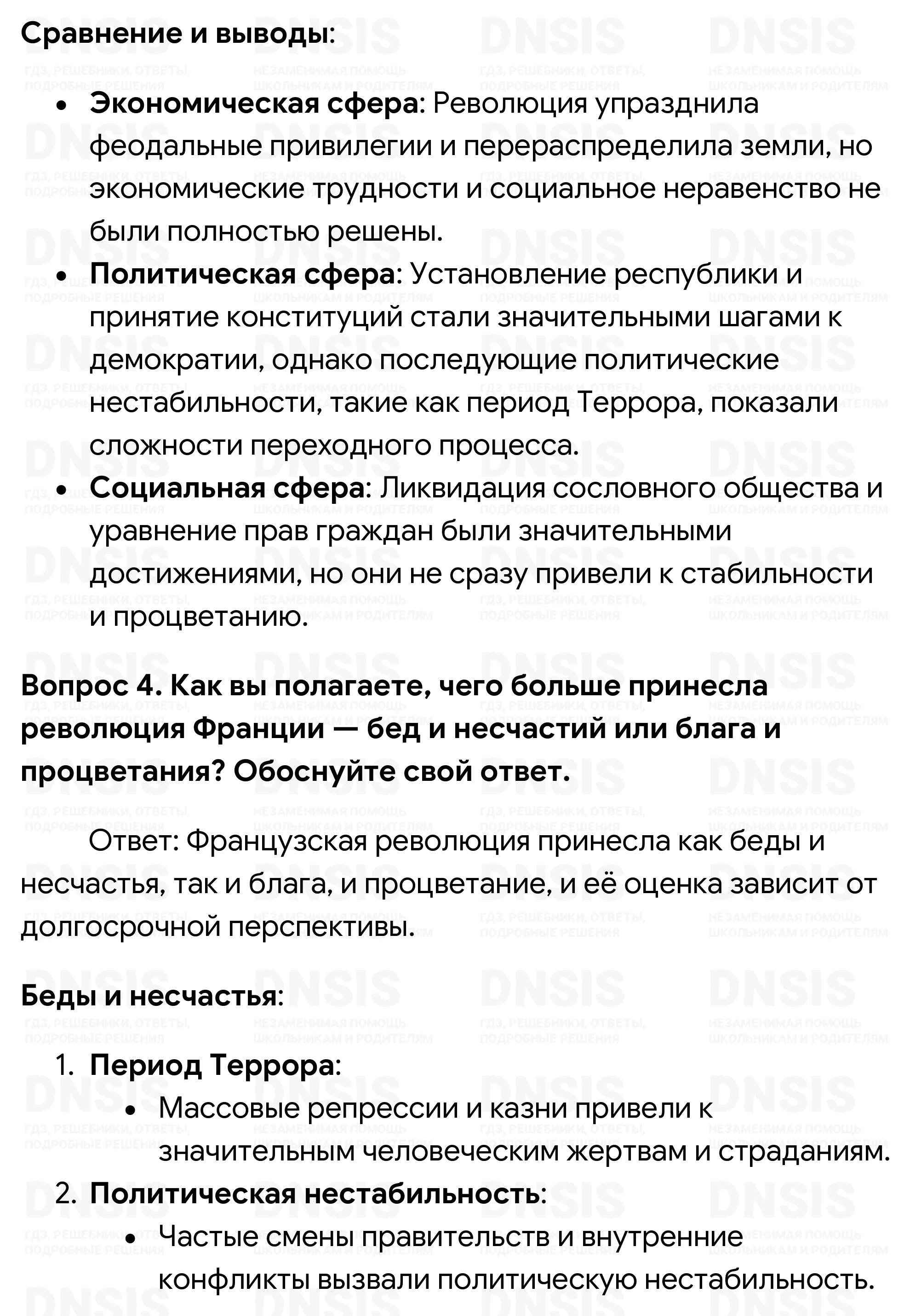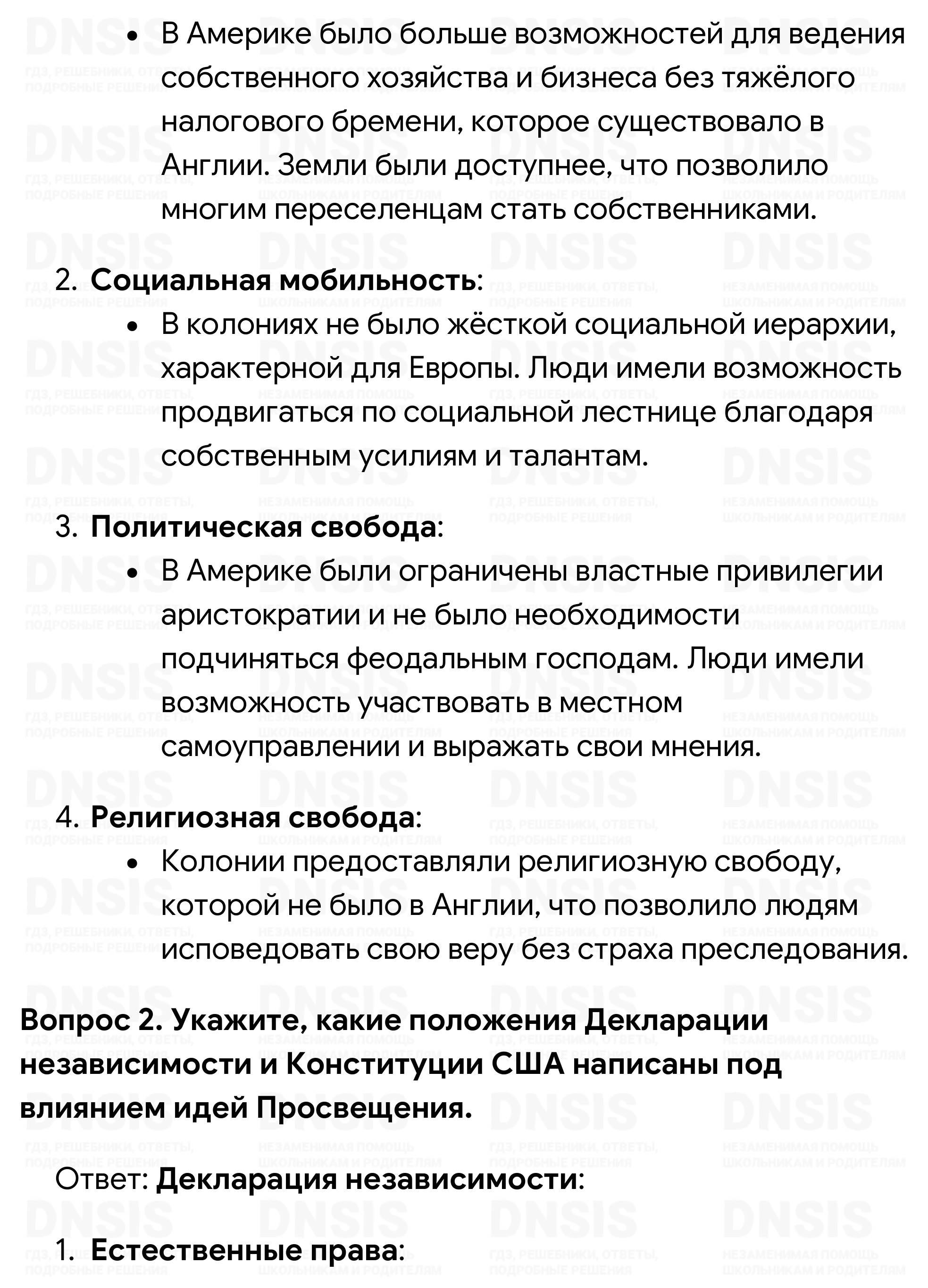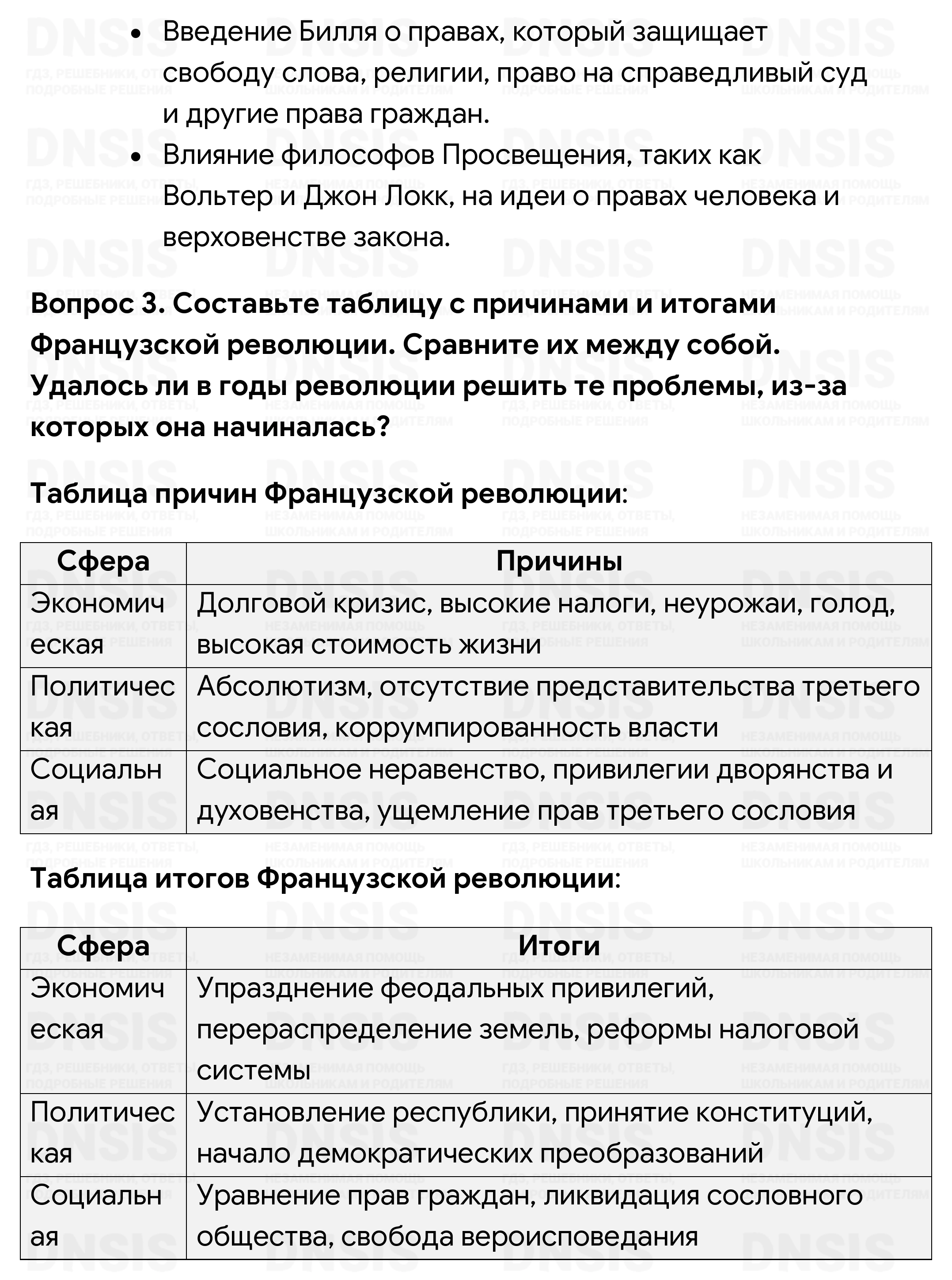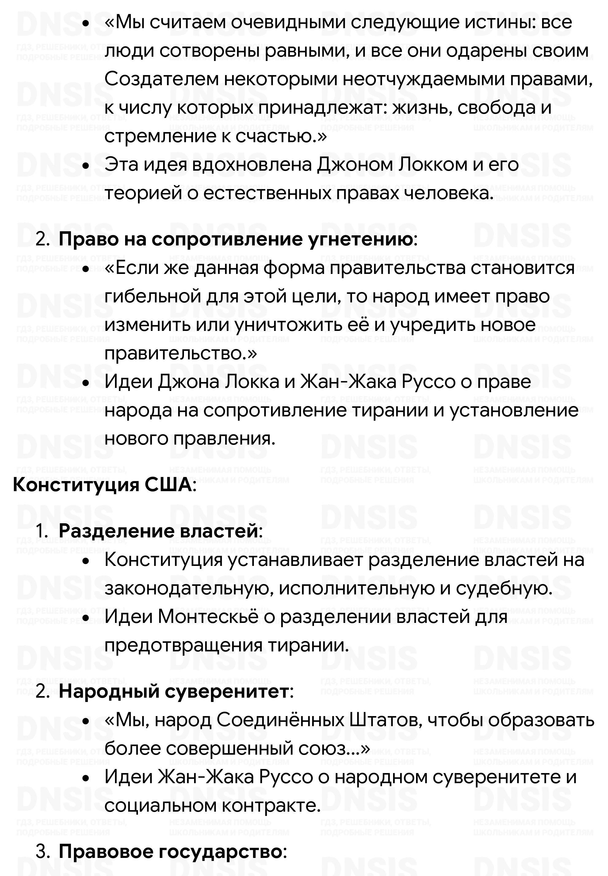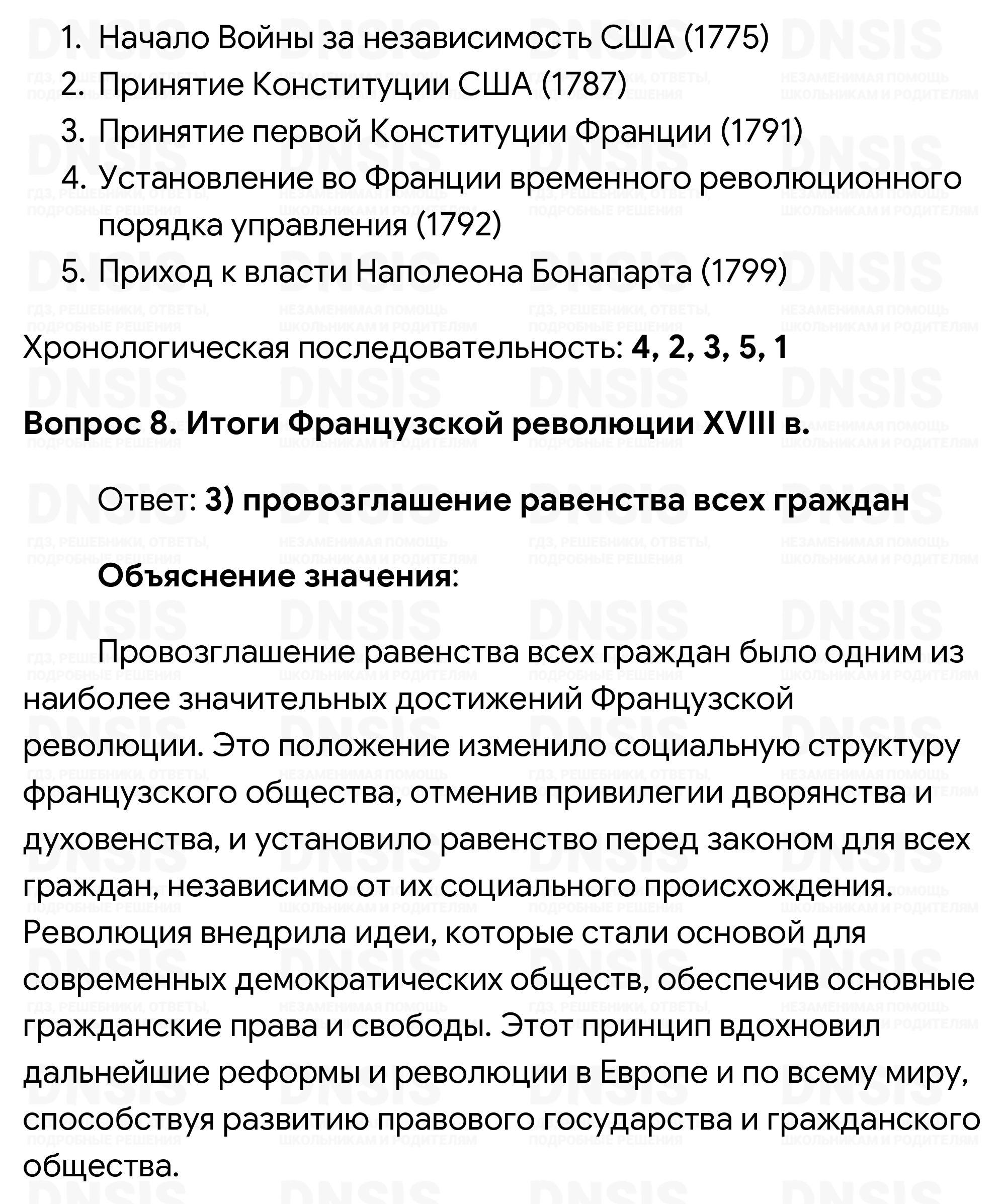 1. Как вы думаете, что дало основание американцу в середине XVIII в. писать своим родным в Англию: «Я обосновался на этой богоизбранной и свободной земле два года назад и с тех пор ни разу не заплатил за удовольствие жить на белом свете. Да и шапка моя за это время ни разу не ломалась для поклона перед каким бы то ни было господином»? 2. Укажите, какие положения Декларации независимости и Конституции США написаны под влиянием идей Просвещения. 3. Составьте в тетради одну таблицу с причинами Французской революции в экономической, политической, социальной сферах и другую с её итогами. Сравните их между собой. Удалось ли в годы революции решить те проблемы, из-за которых она начиналась? 4. Как вы полагаете, чего больше принесла революция Франции — бед и несчастий или блага и процветания? Используя дополнительные источники информации и интернет-ресурсы, обоснуйте свой ответ. 5. Выберите событие, которое видится вам наиболее важным в истории Французской революции, и сделайте о нём презентацию. В ходе презентации обоснуйте, почему вы выбрали именно этот сюжет. 6. Существуют различные точки зрения на диктатуру монтаньяров. Одна из них — это высший этап развития революции, время, когда она достигла максимума. Другая — революцию «занесло», она отклонилась со своего пути, но затем на него вернулась. Напишите эссе на эту тему, докажите свою точку зрения. 7. Расположите в хронологической последовательности исторические события: 1) принятие первой Конституции Франции; 2) принятие Конституции США; 3) приход к власти Наполеона Бонапарта; 4) начало Войны за независимость США; 5) установление во Франции временного революционного порядка управления. Ответ запишите в тетради в виде последовательности цифр. (Проверьте себя, обратившись к соответствующей рубрике на с. 239.) 8. Выберите из списка, что из перечисленного стало одним из итогов Французской революции XVIII в.: 1) создание условий для промышленного переворота; 2) установление конституционной монархии; 3) провозглашение равенства всех граждан; 4) бурное развитие капитализма во Франции; 5) увеличение объёмов внешней торговли. Ответ запишите в тетради. (Проверьте себя, обратившись к соответствующей рубрике на с. 239.) Объясните значение выбранного вами положения.