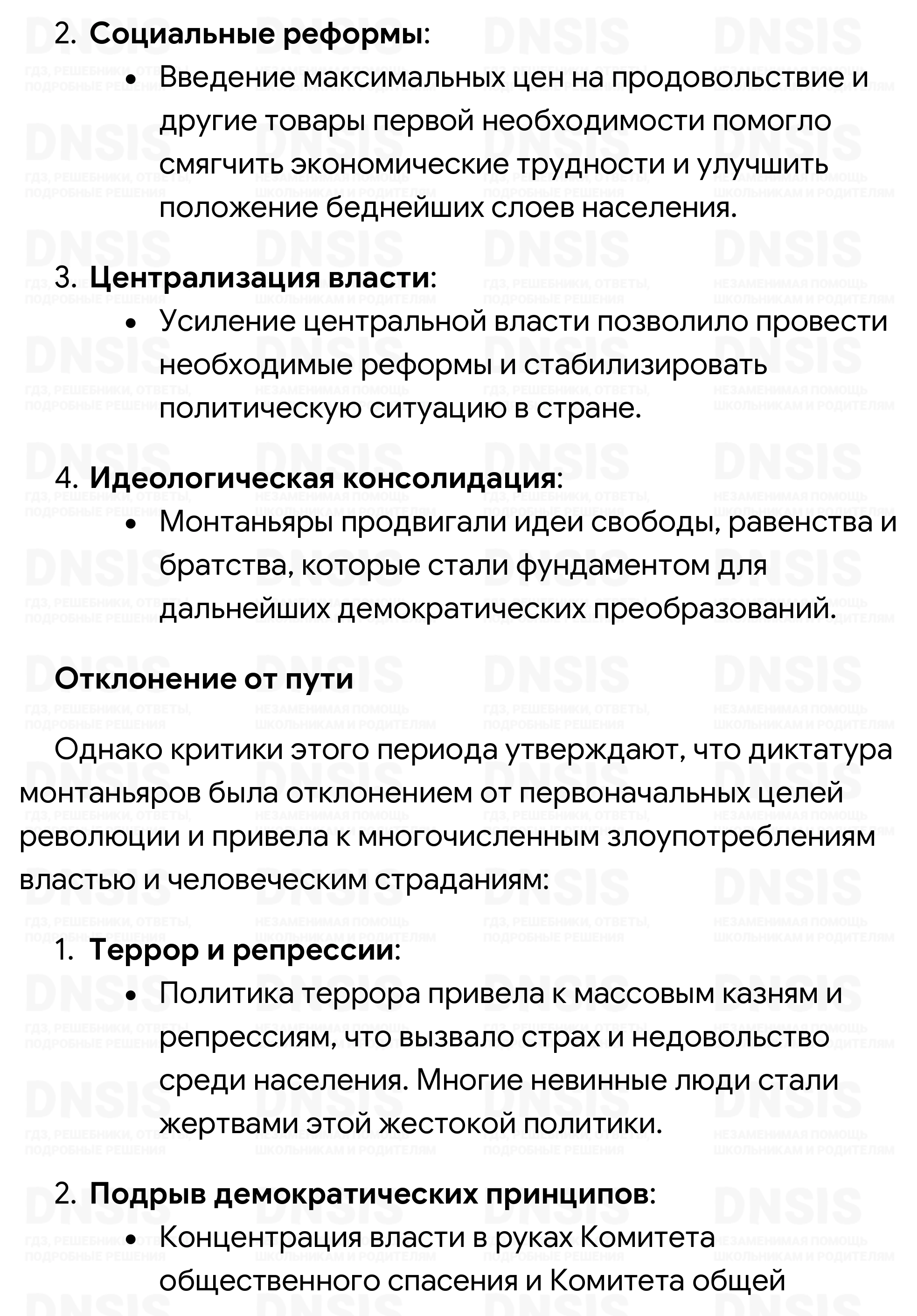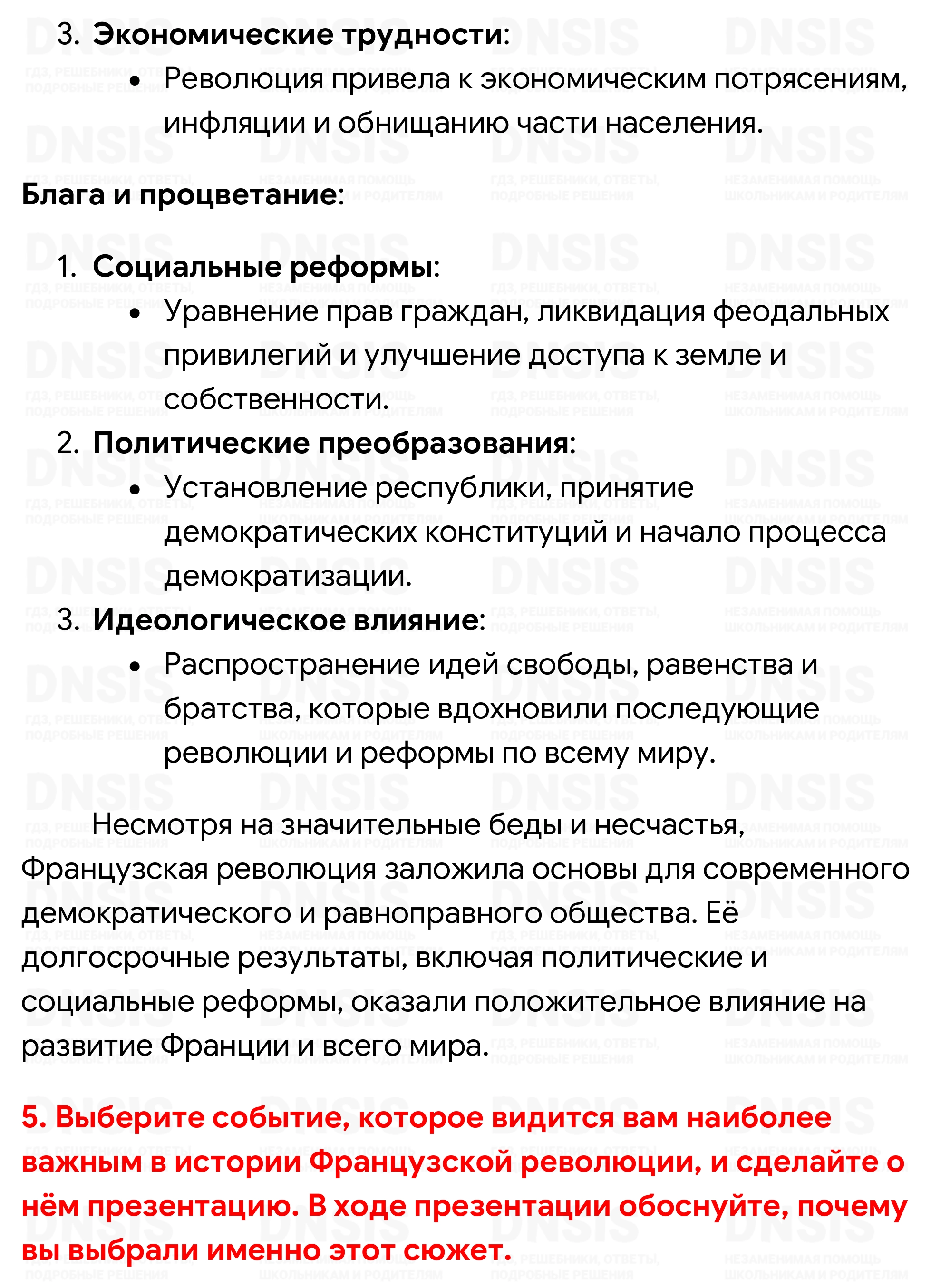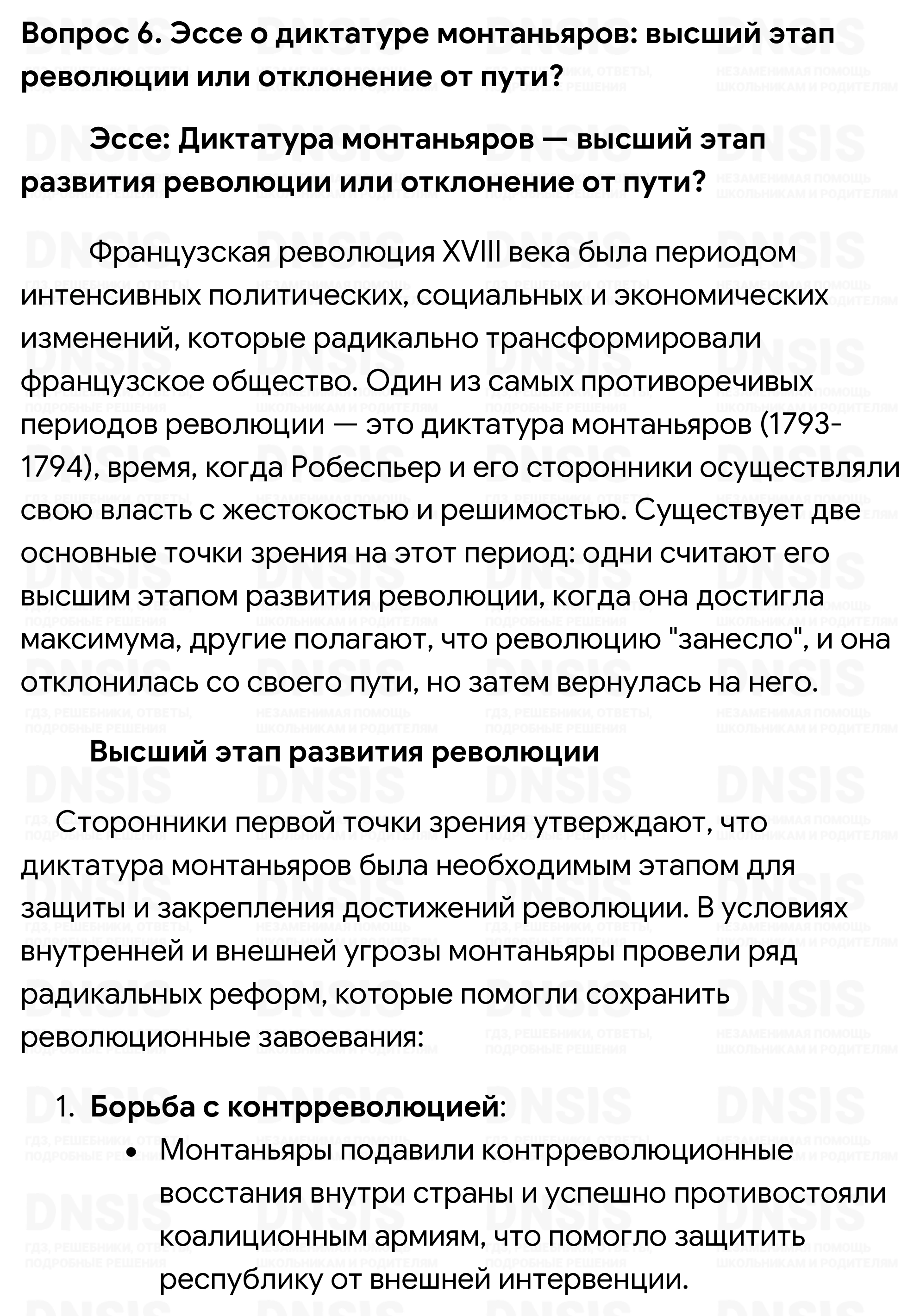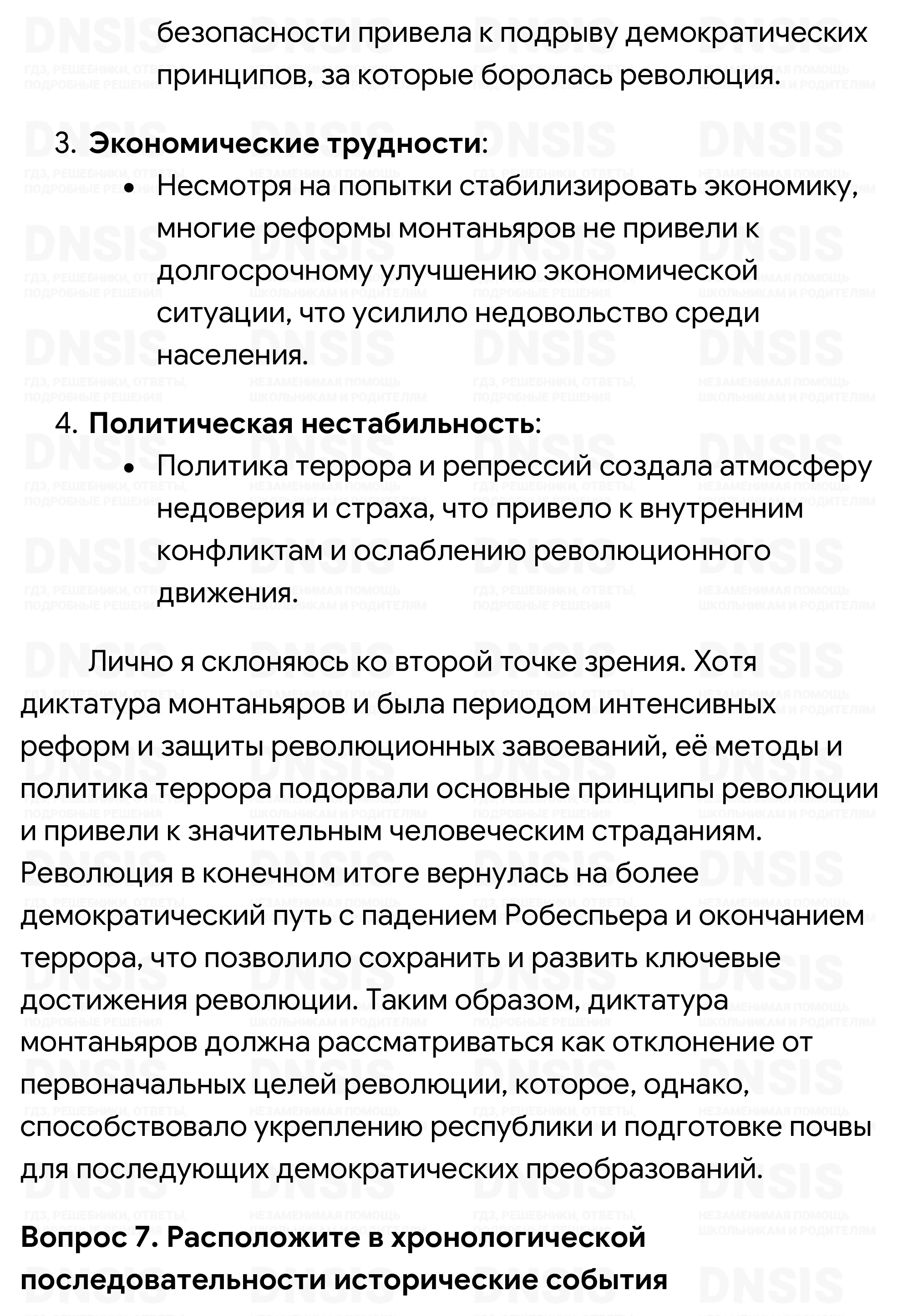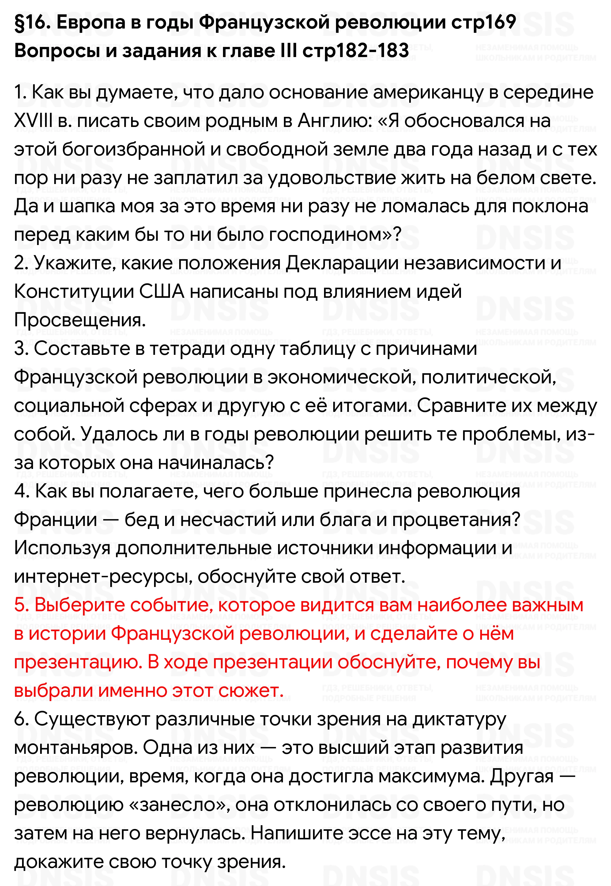 1. Как вы думаете, что дало основание американцу в середине XVIII в. писать своим родным в Англию: «Я обосновался на этой богоизбранной и свободной земле два года назад и с тех пор ни разу не заплатил за удовольствие жить на белом свете. Да и шапка моя за это время ни разу не ломалась для поклона перед каким бы то ни было господином»? 2. Укажите, какие положения Декларации независимости и Конституции США написаны под влиянием идей Просвещения. 3. Составьте в тетради одну таблицу с причинами Французской революции в экономической, политической, социальной сферах и другую с её итогами. Сравните их между собой. Удалось ли в годы революции решить те проблемы, из-за которых она начиналась? 4. Как вы полагаете, чего больше принесла революция Франции — бед и несчастий или блага и процветания? Используя дополнительные источники информации и интернет-ресурсы, обоснуйте свой ответ. 5. Выберите событие, которое видится вам наиболее важным в истории Французской революции, и сделайте о нём презентацию. В ходе презентации обоснуйте, почему вы выбрали именно этот сюжет. 6. Существуют различные точки зрения на диктатуру монтаньяров. Одна из них — это высший этап развития революции, время, когда она достигла максимума. Другая — революцию «занесло», она отклонилась со своего пути, но затем на него вернулась. Напишите эссе на эту тему, докажите свою точку зрения. 7. Расположите в хронологической последовательности исторические события: 1) принятие первой Конституции Франции; 2) принятие Конституции США; 3) приход к власти Наполеона Бонапарта; 4) начало Войны за независимость США; 5) установление во Франции временного революционного порядка управления. Ответ запишите в тетради в виде последовательности цифр. (Проверьте себя, обратившись к соответствующей рубрике на с. 239.) 8. Выберите из списка, что из перечисленного стало одним из итогов Французской революции XVIII в.: 1) создание условий для промышленного переворота; 2) установление конституционной монархии; 3) провозглашение равенства всех граждан; 4) бурное развитие капитализма во Франции; 5) увеличение объёмов внешней торговли. Ответ запишите в тетради. (Проверьте себя, обратившись к соответствующей рубрике на с. 239.) Объясните значение выбранного вами положения.