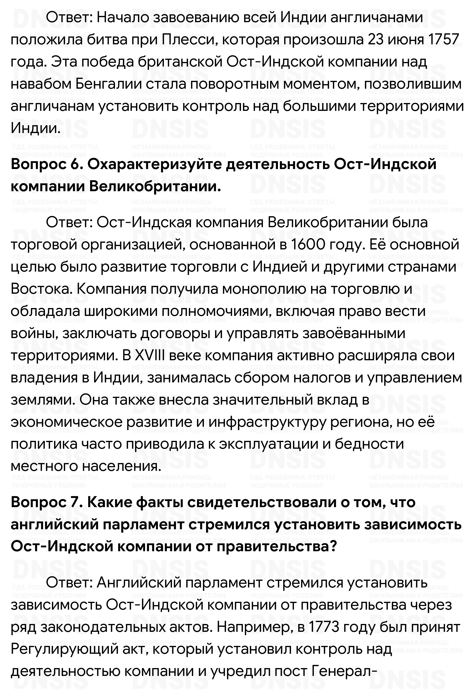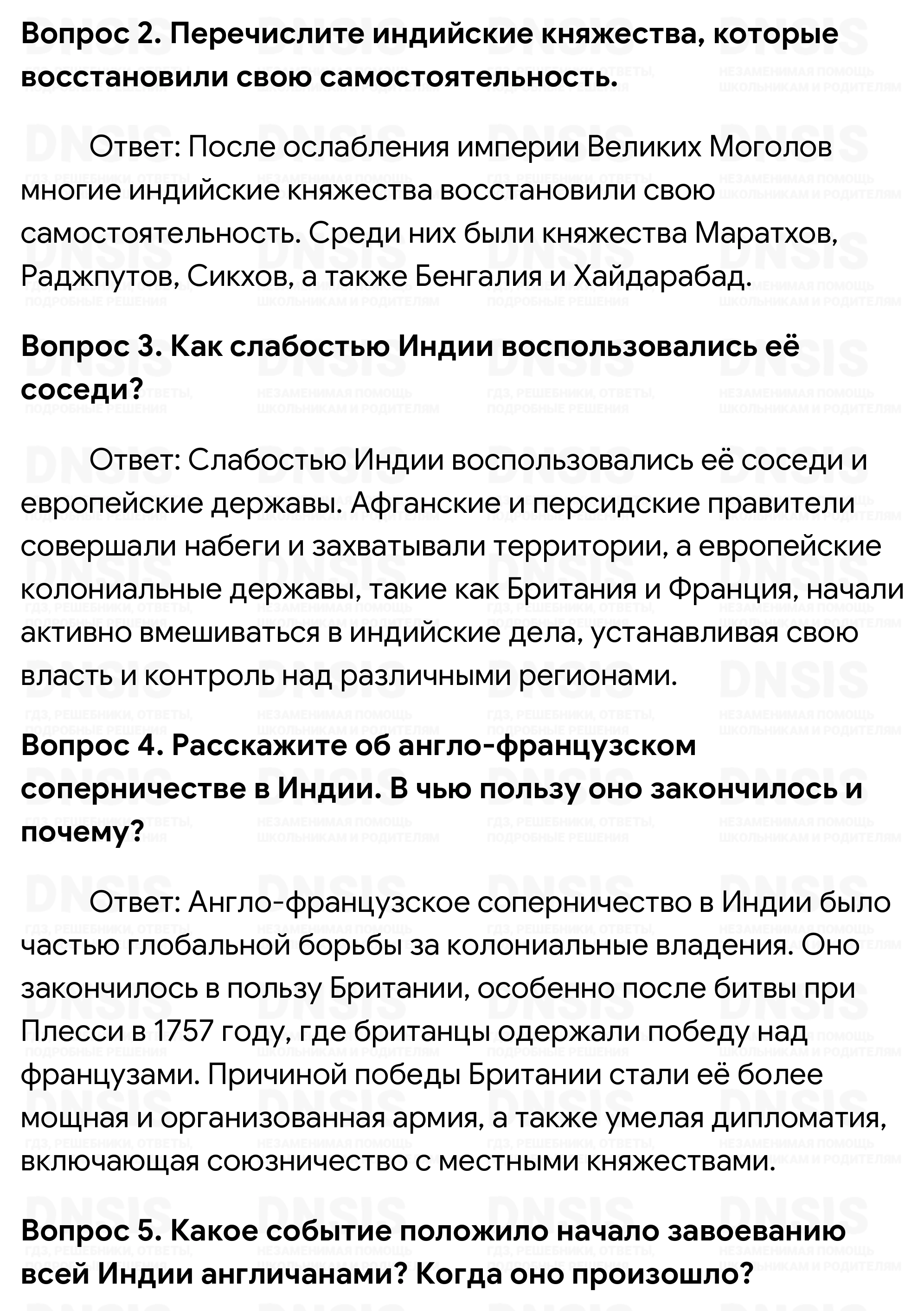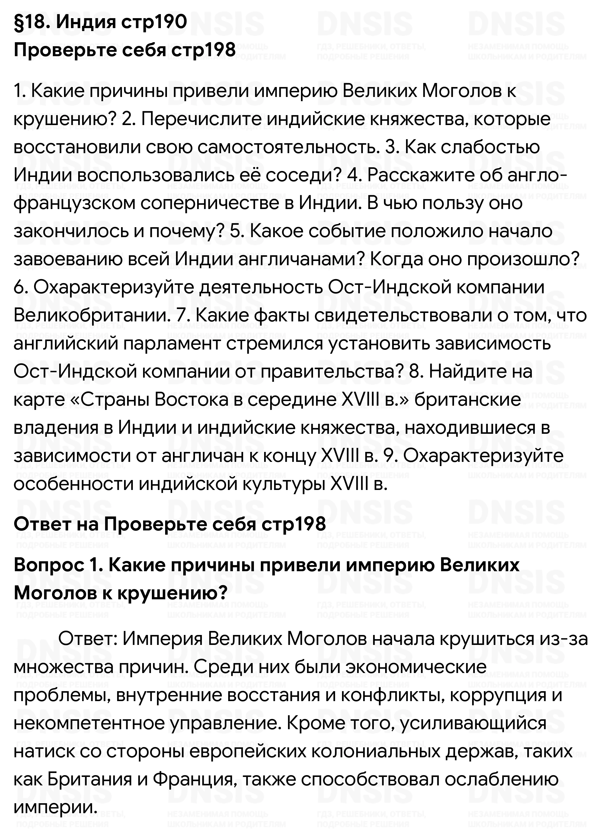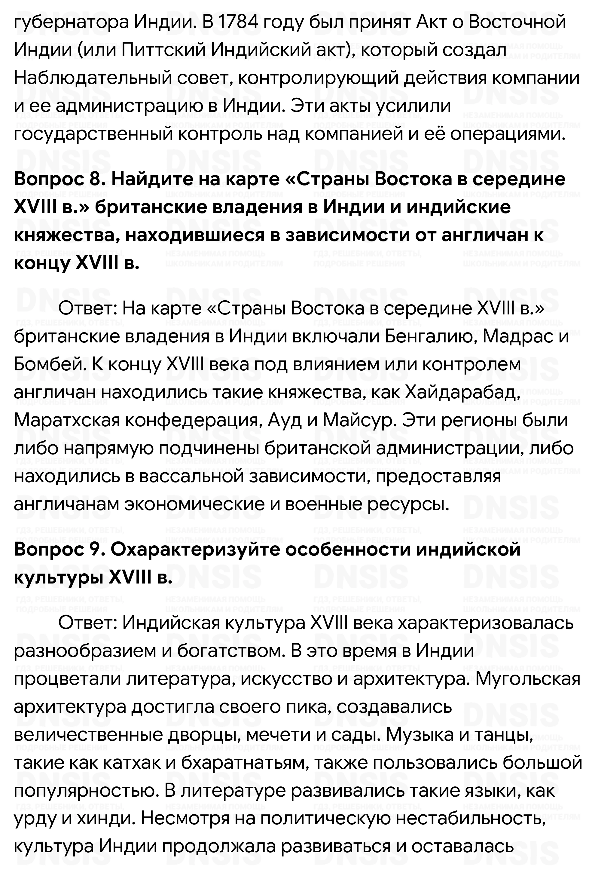 1. Какие причины привели империю Великих Моголов к крушению? 2. Перечислите индийские княжества, которые восстановили свою самостоятельность. 3. Как слабостью Индии воспользовались её соседи? 4. Расскажите об англо-французском соперничестве в Индии. В чью пользу оно закончилось и почему? 5. Какое событие положило начало завоеванию всей Индии англичанами? Когда оно произошло? 6. Охарактеризуйте деятельность Ост-Индской компании Великобритании. 7. Какие факты свидетельствовали о том, что английский парламент стремился установить зависимость Ост-Индской компании от правительства? 8. Найдите на карте «Страны Востока в середине XVIII в.» британские владения в Индии и индийские княжества, находившиеся в зависимости от англичан к концу XVIII в. 9. Охарактеризуйте особенности индийской культуры XVIII в.