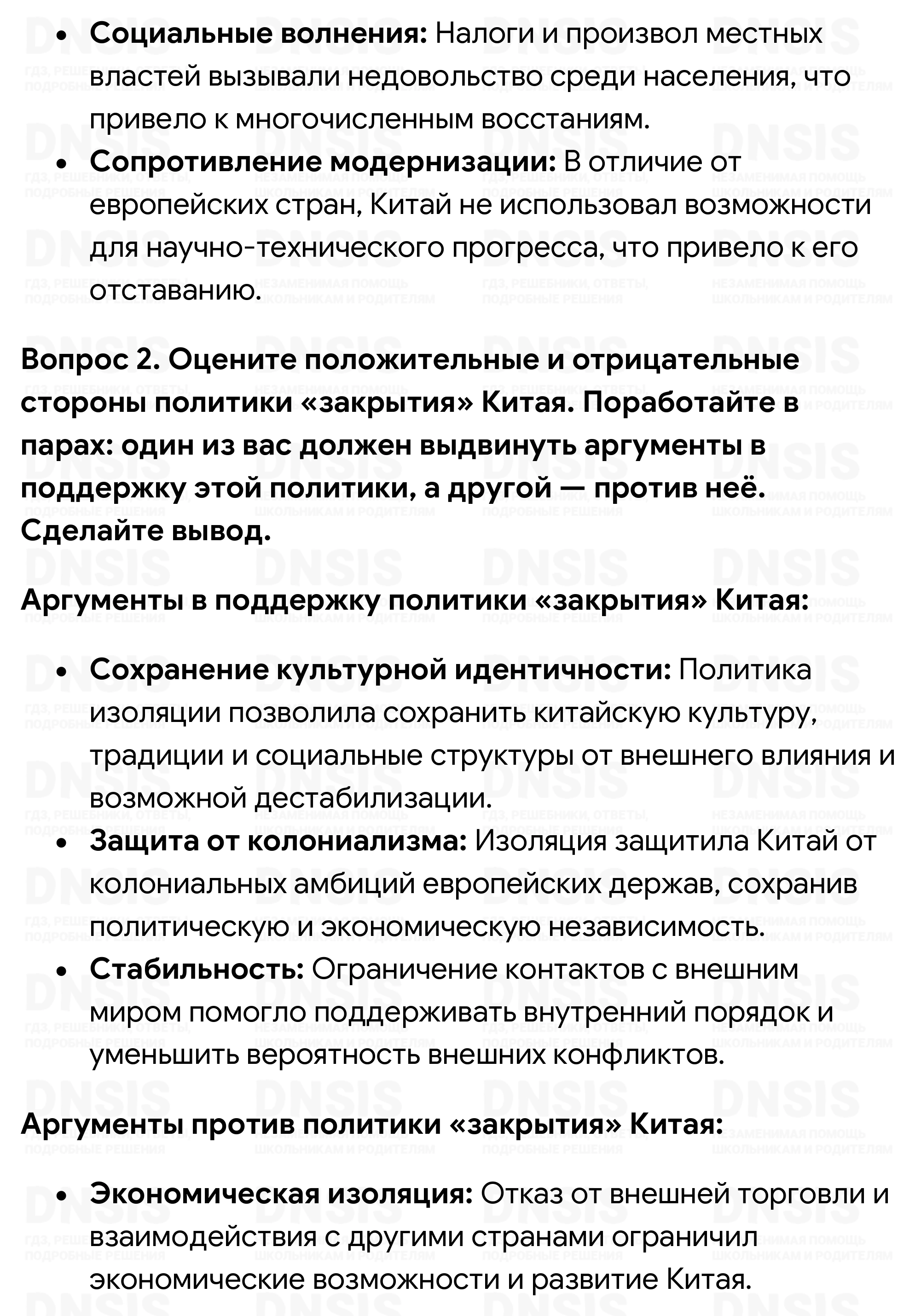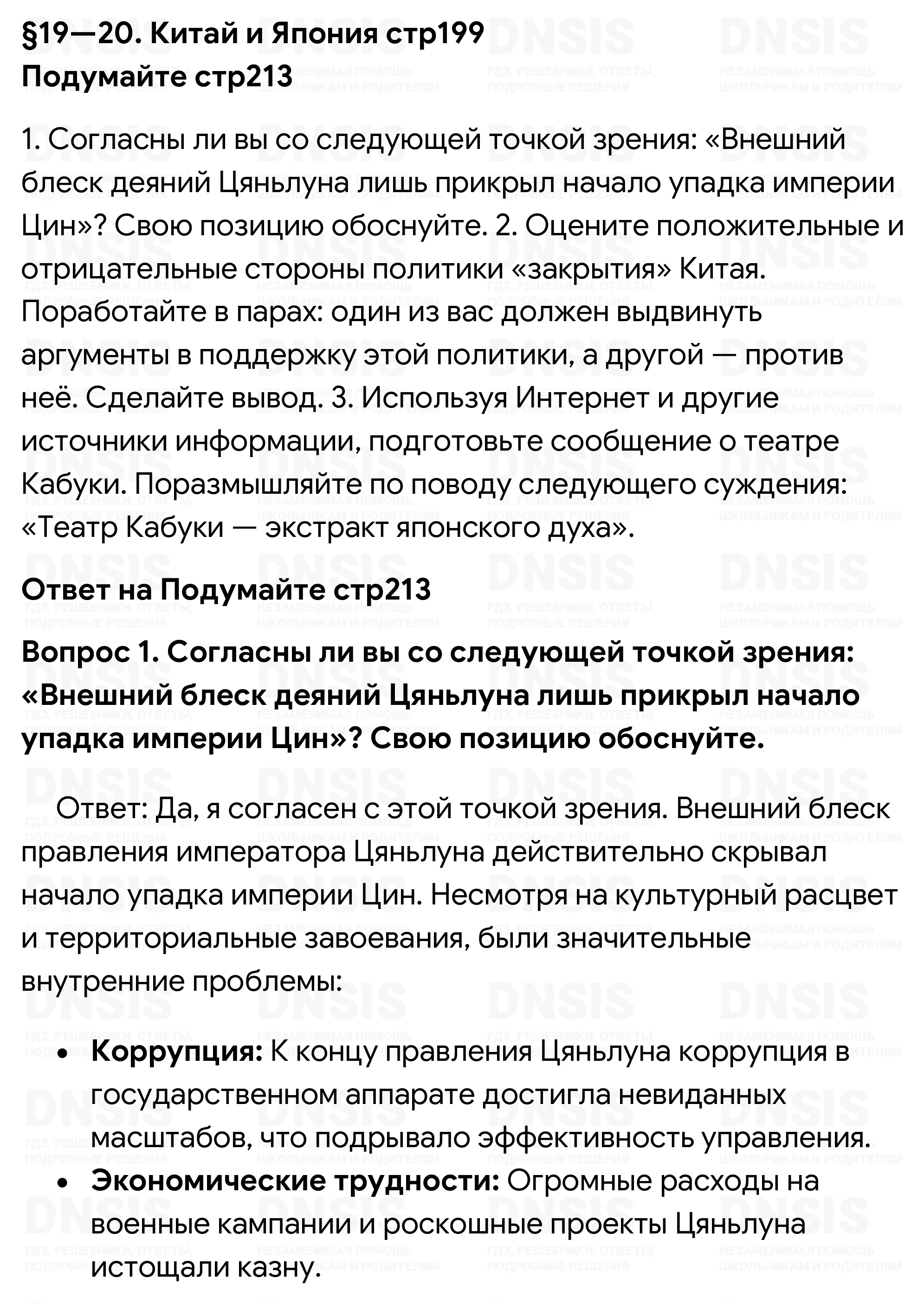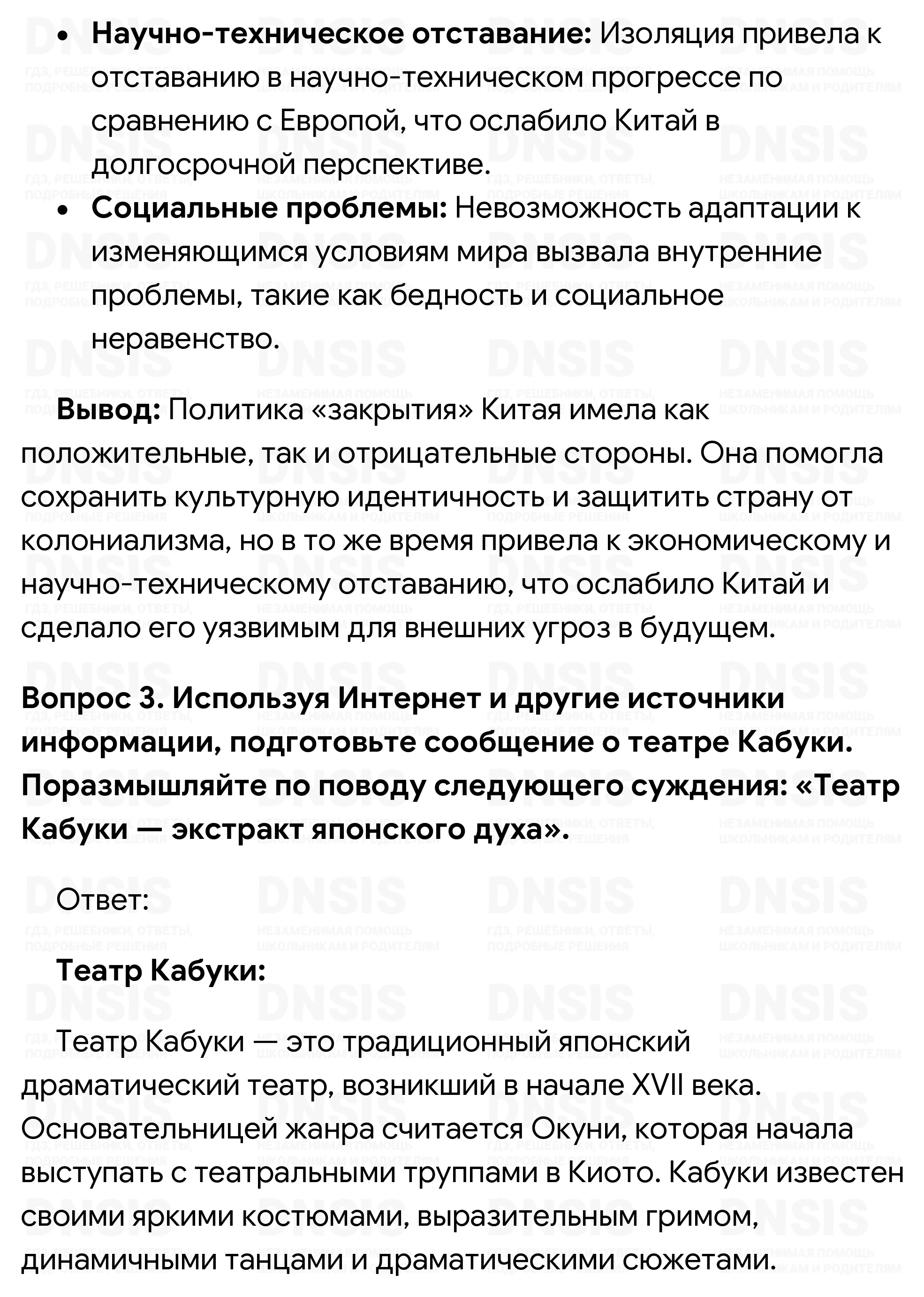 1. Согласны ли вы со следующей точкой зрения: «Внешний блеск деяний Цяньлуна лишь прикрыл начало упадка империи Цин»? Свою позицию обоснуйте. 2. Оцените положительные и отрицательные стороны политики «закрытия» Китая. Поработайте в парах: один из вас должен выдвинуть аргументы в поддержку этой политики, а другой — против неё. Сделайте вывод. 3. Используя Интернет и другие источники информации, подготовьте сообщение о театре Кабуки. Поразмышляйте по поводу следующего суждения: «Театр Кабуки — экстракт японского духа».