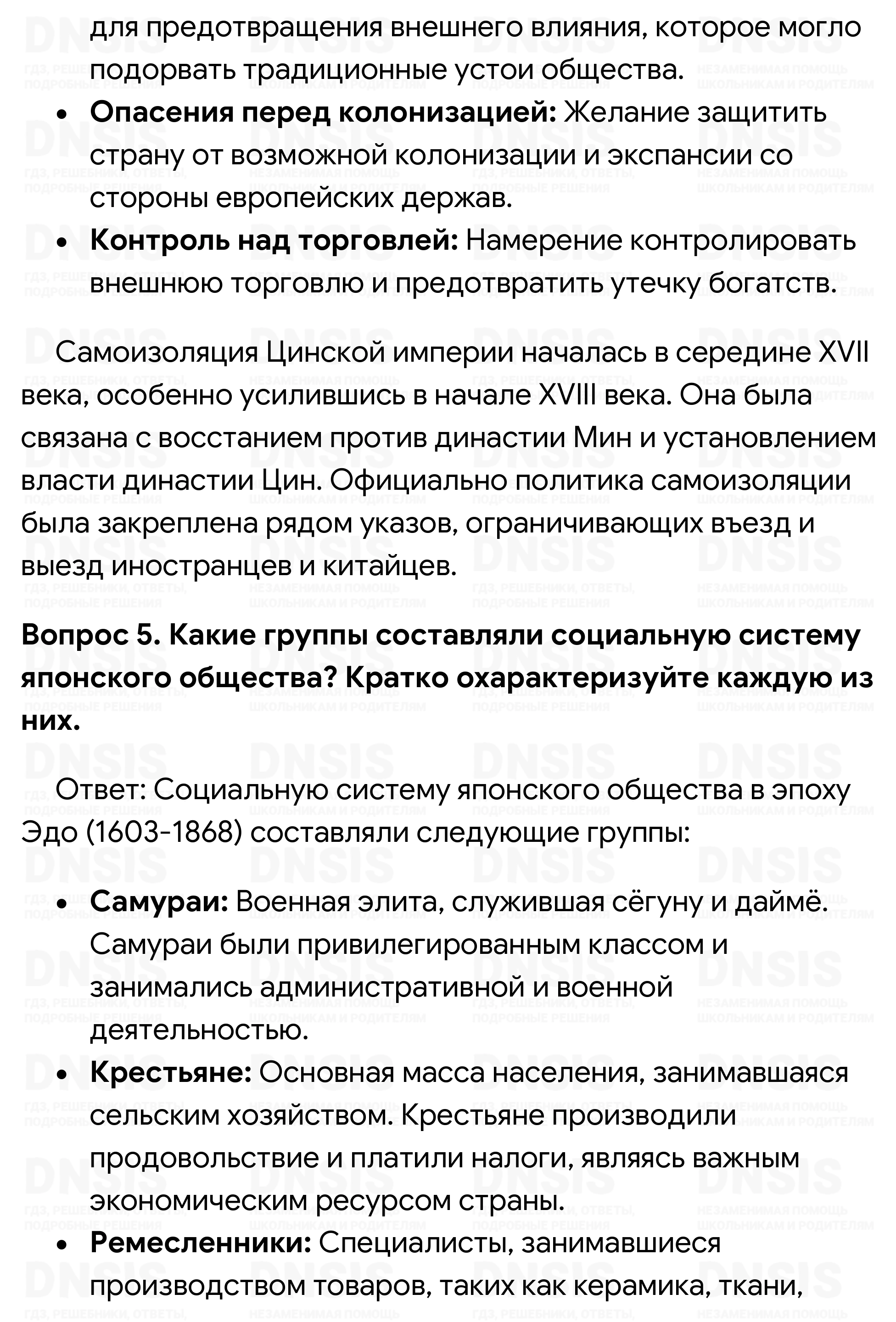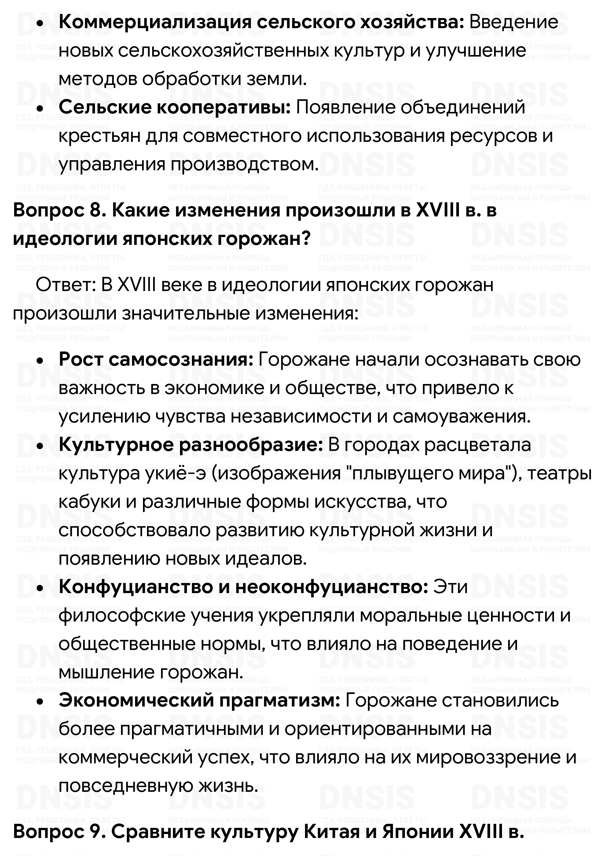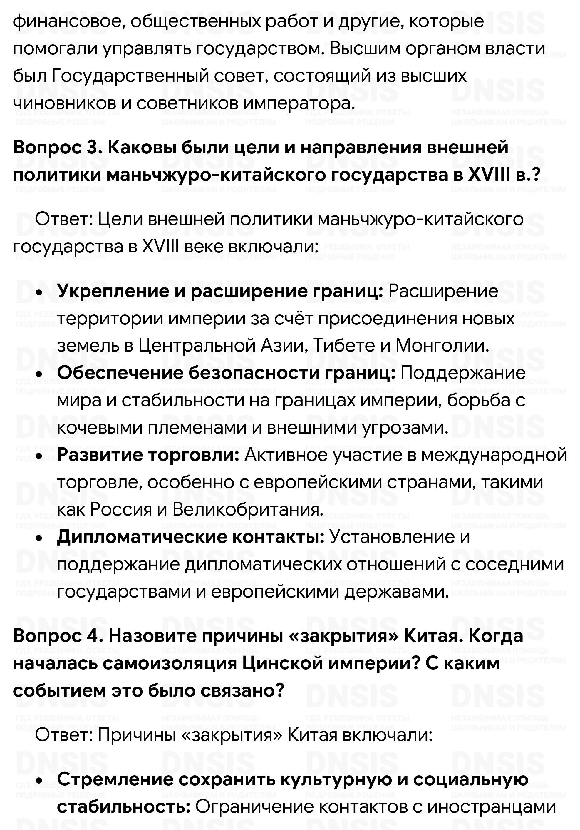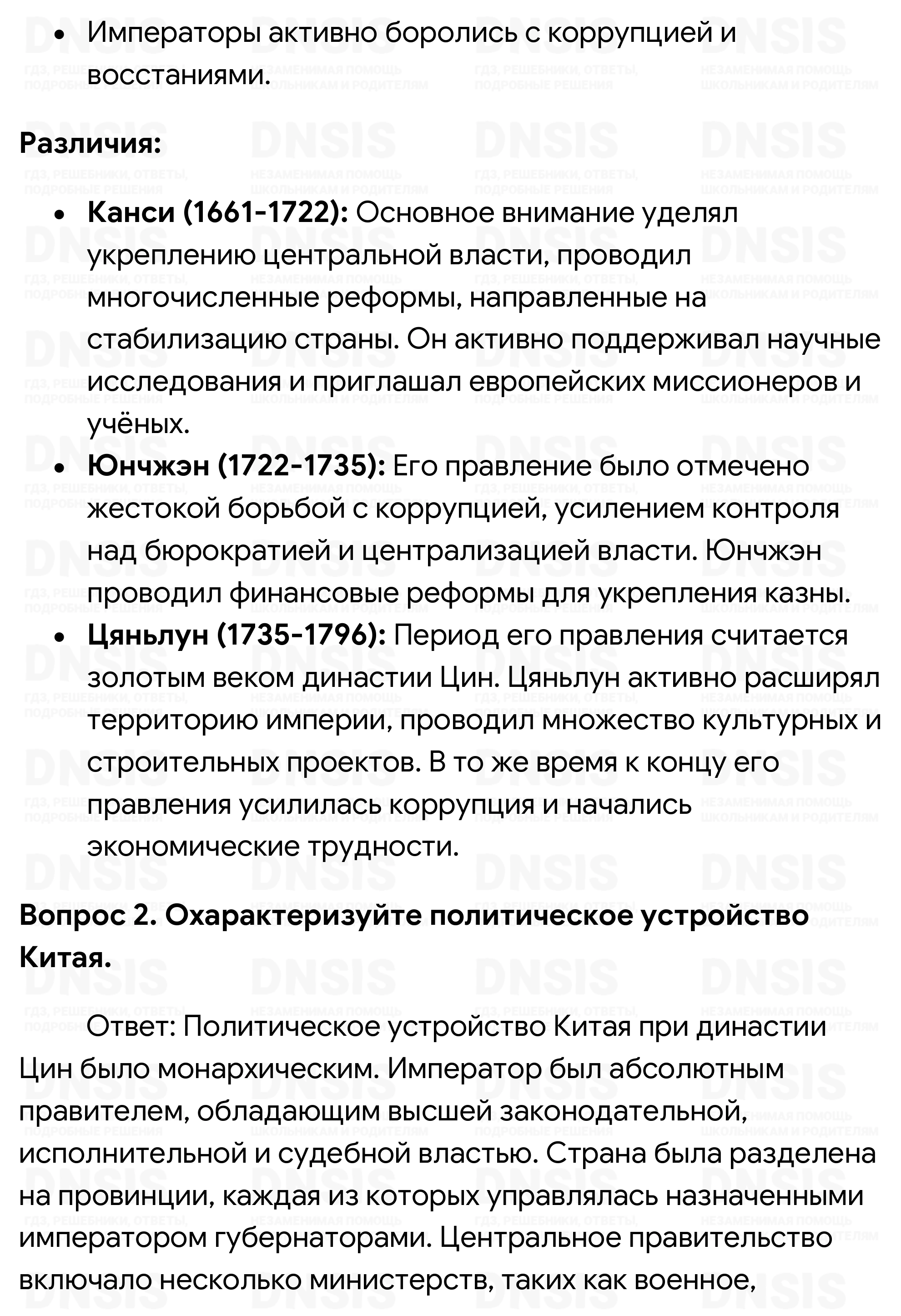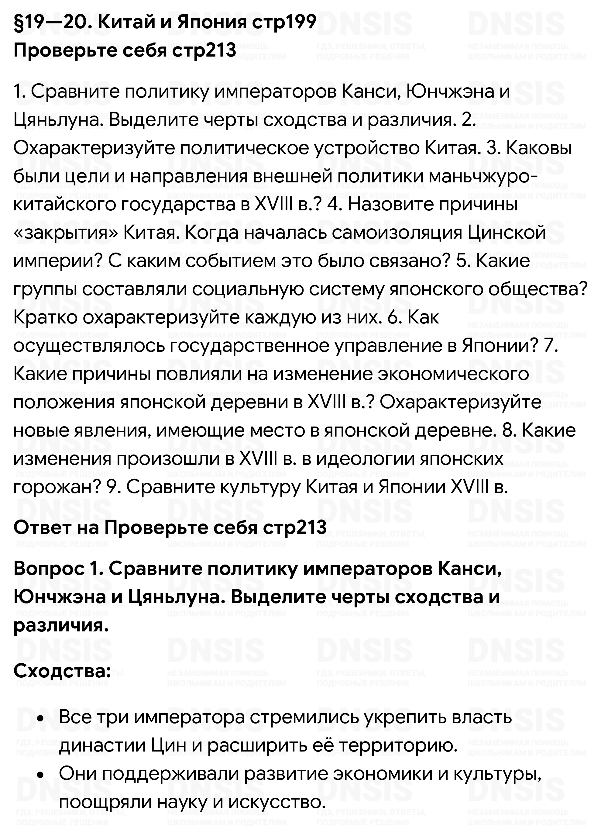 1. Сравните политику императоров Канси, Юнчжэна и Цяньлуна. Выделите черты сходства и различия. 2. Охарактеризуйте политическое устройство Китая. 3. Каковы были цели и направления внешней политики маньчжуро-китайского государства в XVIII в.? 4. Назовите причины «закрытия» Китая. Когда началась самоизоляция Цинской империи? С каким событием это было связано? 5. Какие группы составляли социальную систему японского общества? Кратко охарактеризуйте каждую из них. 6. Как осуществлялось государственное управление в Японии? 7. Какие причины повлияли на изменение экономического положения японской деревни в XVIII в.? Охарактеризуйте новые явления, имеющие место в японской деревне. 8. Какие изменения произошли в XVIII в. в идеологии японских горожан? 9. Сравните культуру Китая и Японии XVIII в.