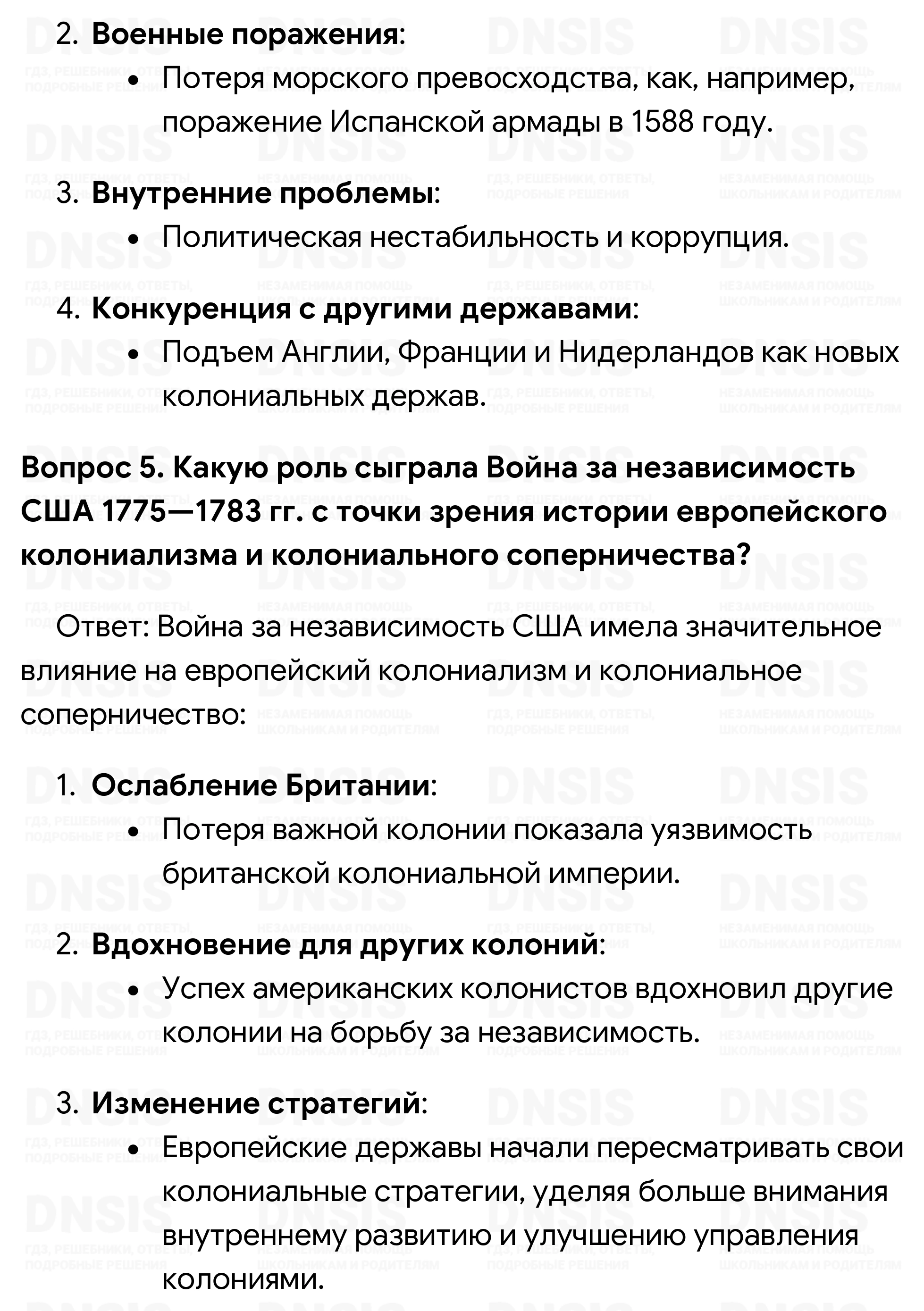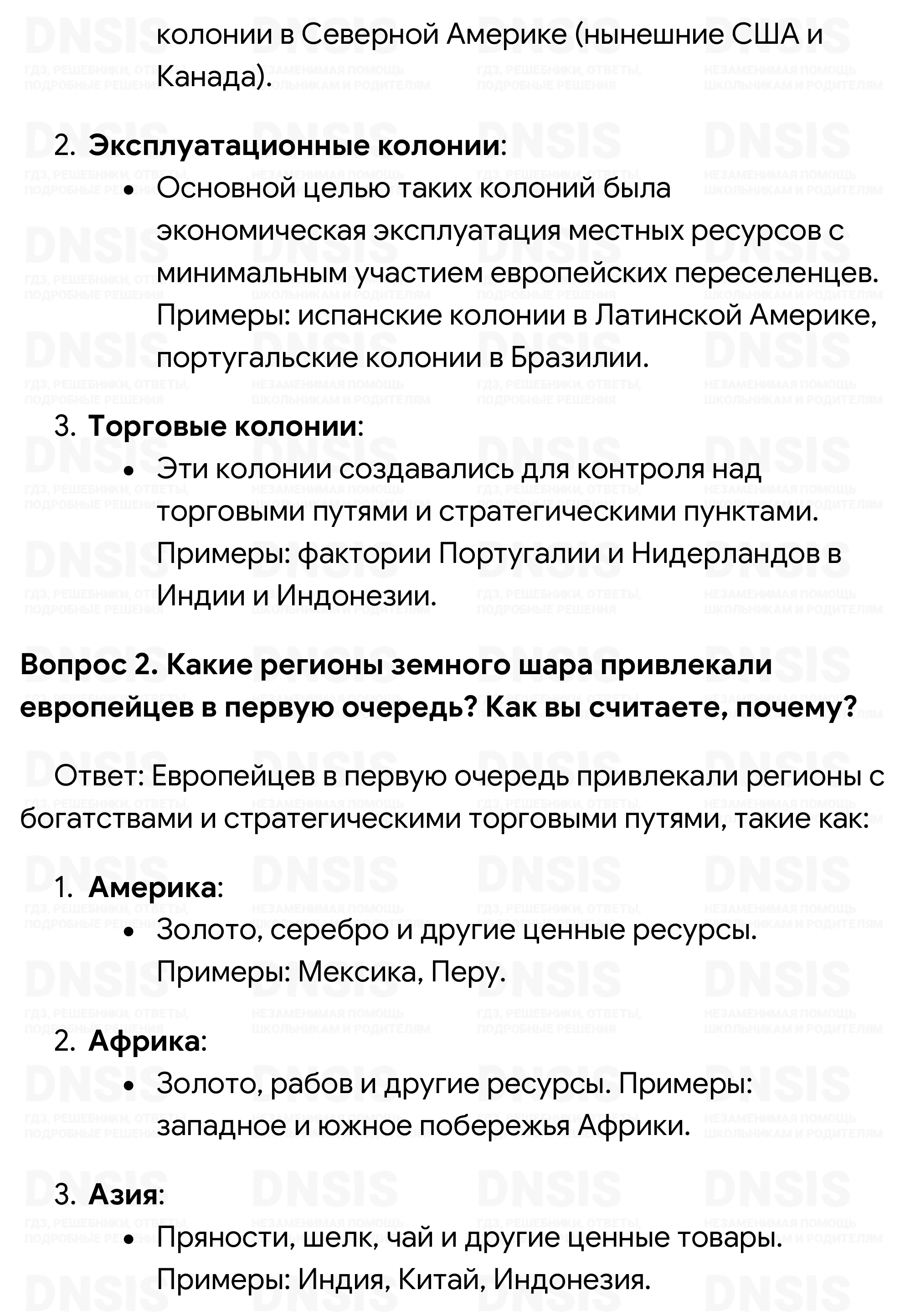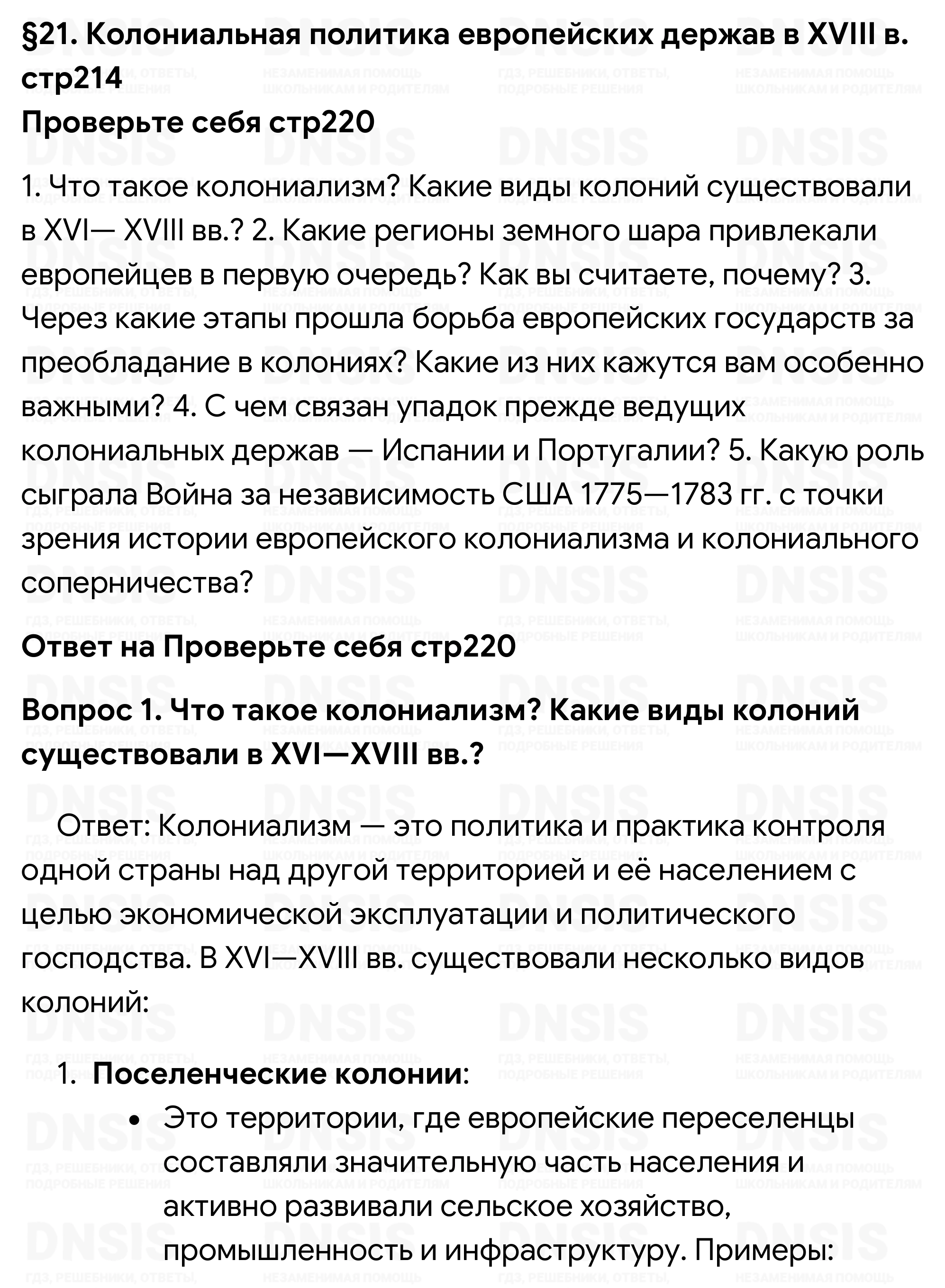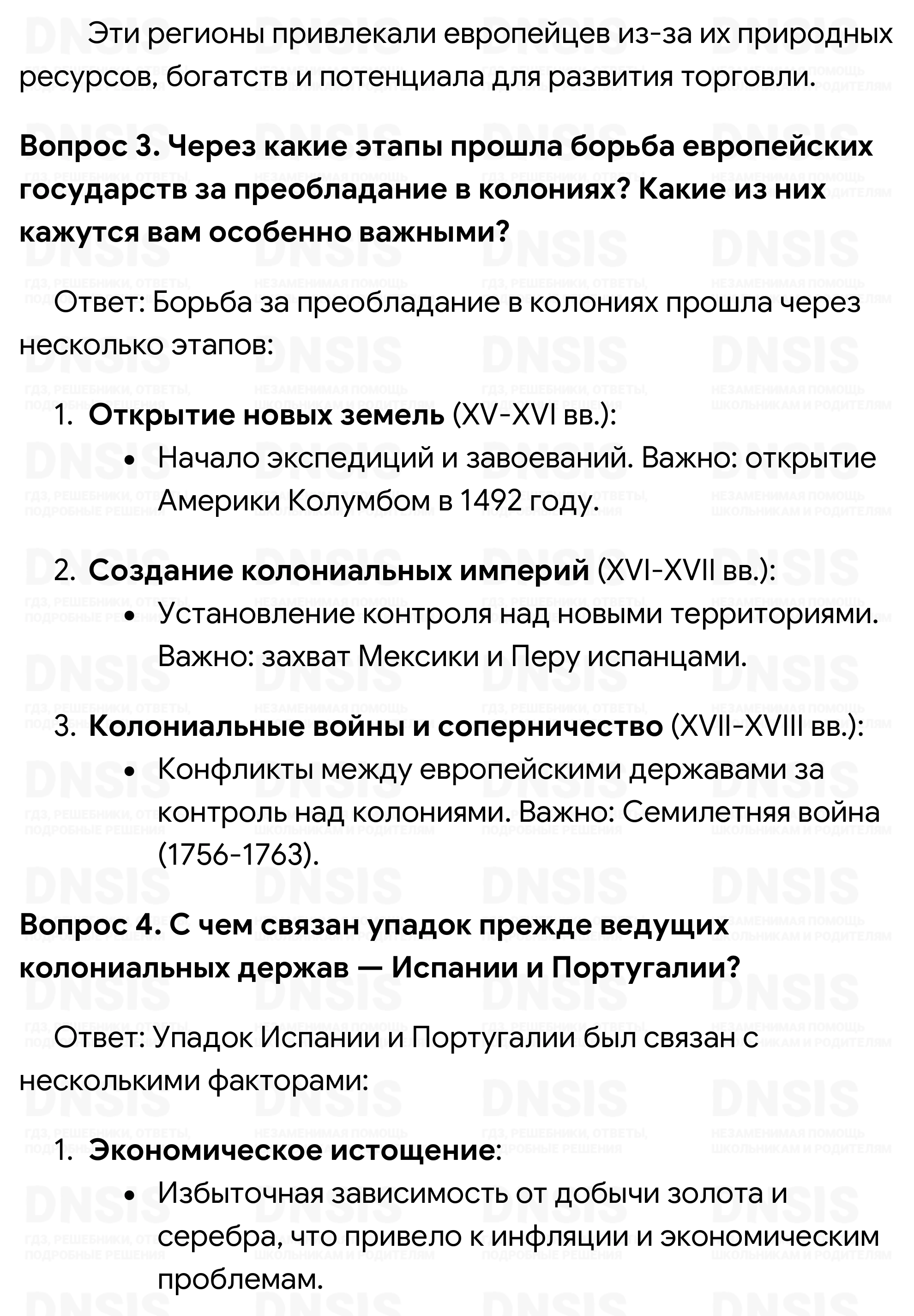 1. Что такое колониализм? Какие виды колоний существовали в XVI— XVIII вв.? 2. Какие регионы земного шара привлекали европейцев в первую очередь? Как вы считаете, почему? 3. Через какие этапы прошла борьба европейских государств за преобладание в колониях? Какие из них кажутся вам особенно важными? 4. С чем связан упадок прежде ведущих колониальных держав — Испании и Португалии? 5. Какую роль сыграла Война за независимость США 1775—1783 гг. с точки зрения истории европейского колониализма и колониального соперничества?