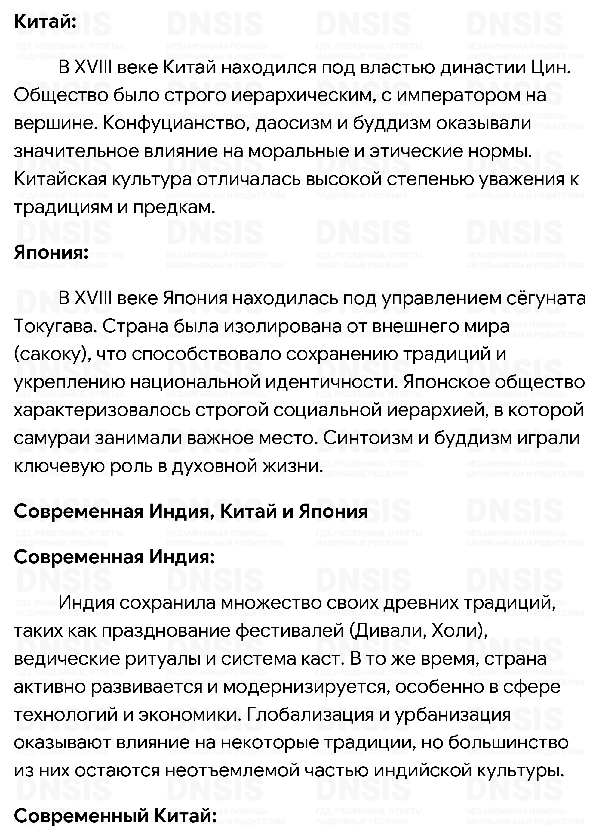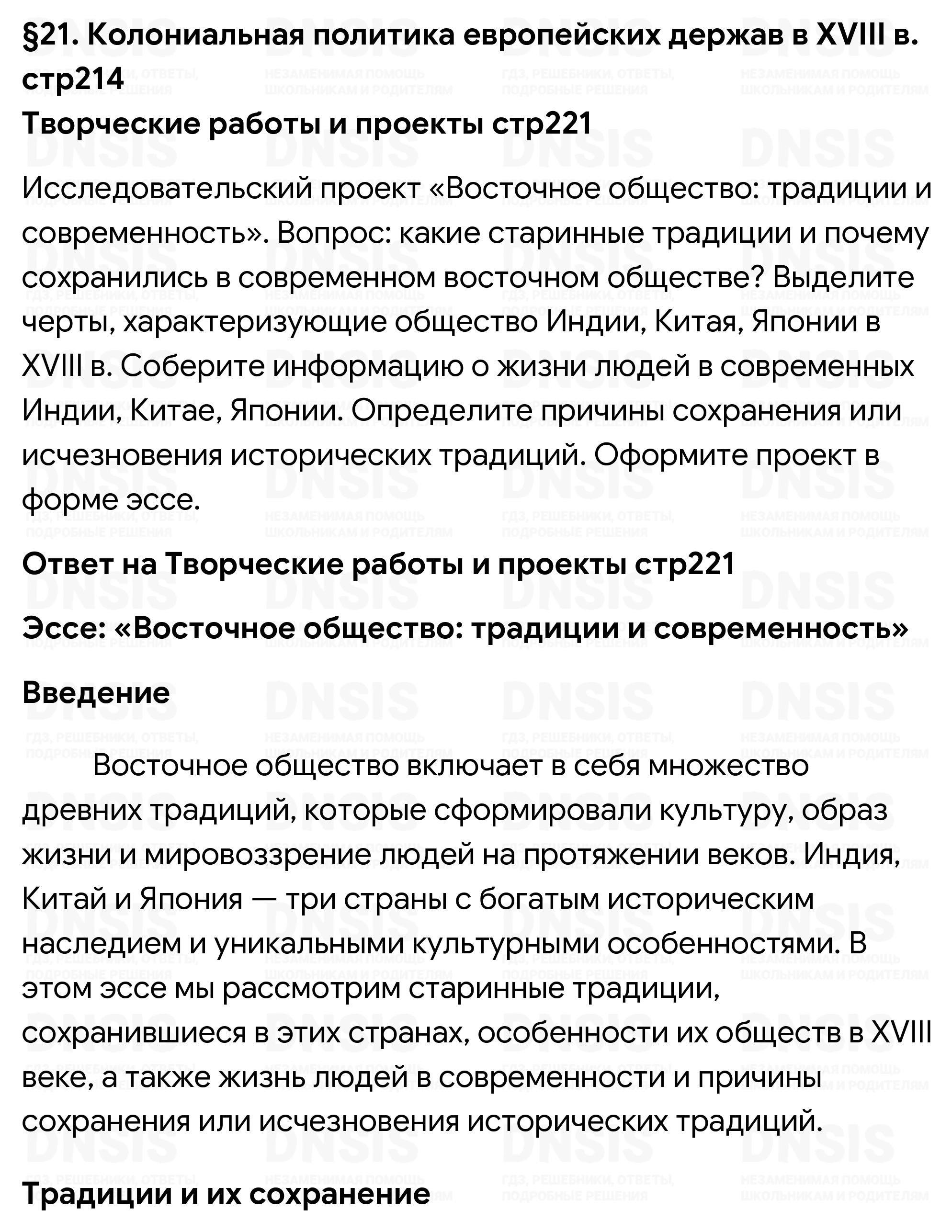 Исследовательский проект «Восточное общество: традиции и современность». Вопрос: какие старинные традиции и почему сохранились в современном восточном обществе? Выделите черты, характеризующие общество Индии, Китая, Японии в XVIII в. Соберите информацию о жизни людей в современных Индии, Китае, Японии. Определите причины сохранения или исчезновения исторических традиций. Оформите проект в форме эссе.