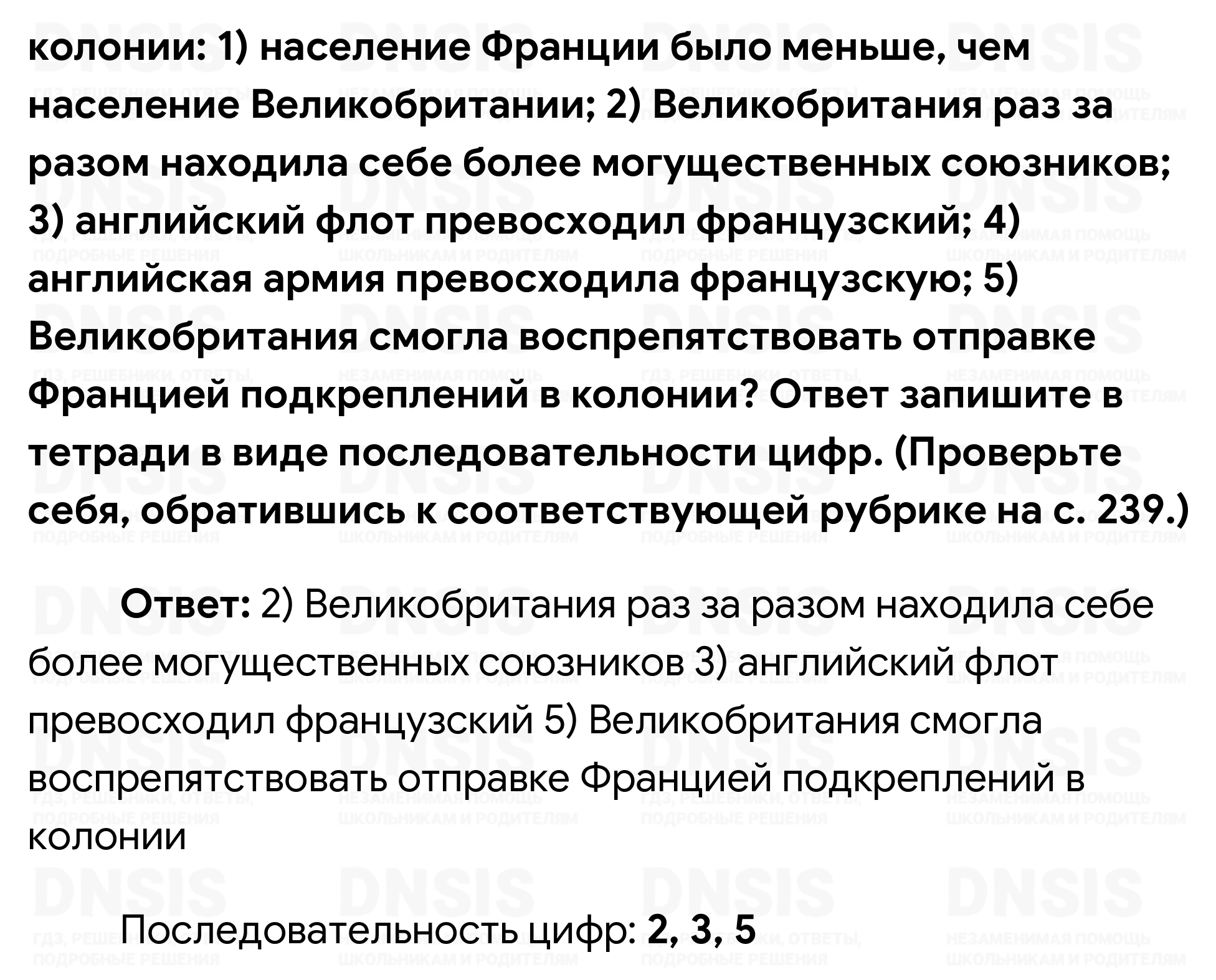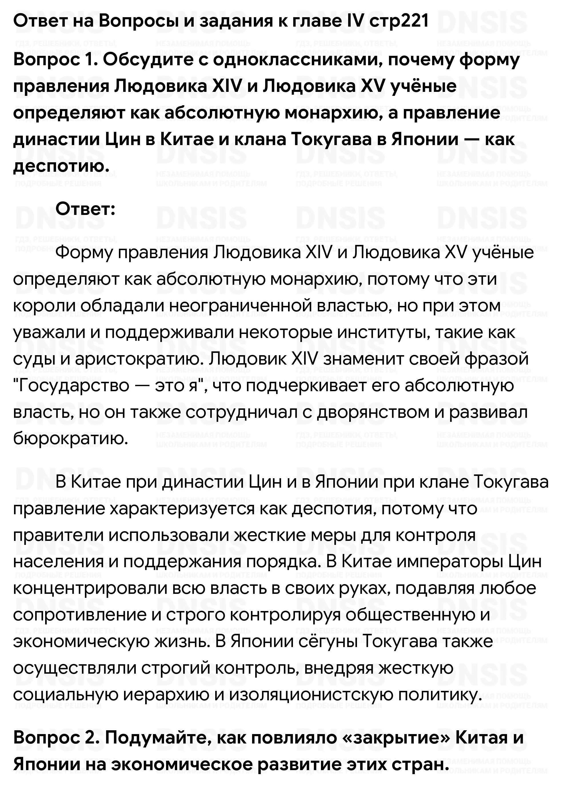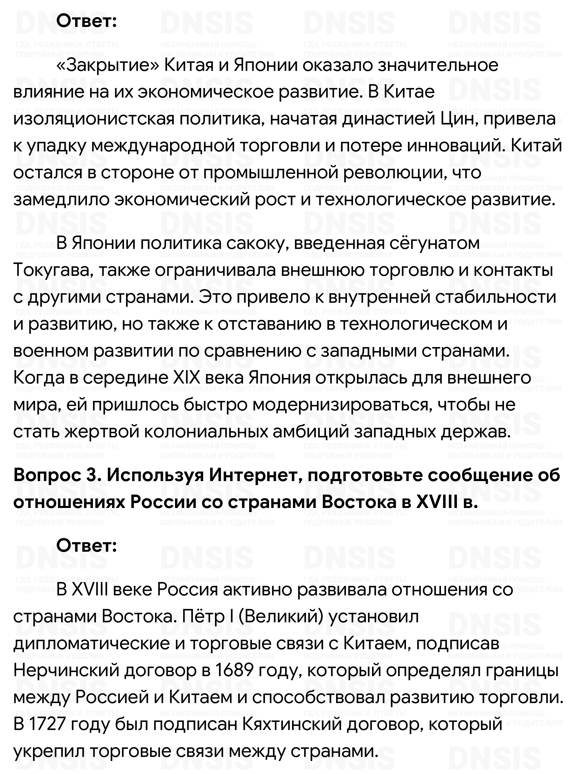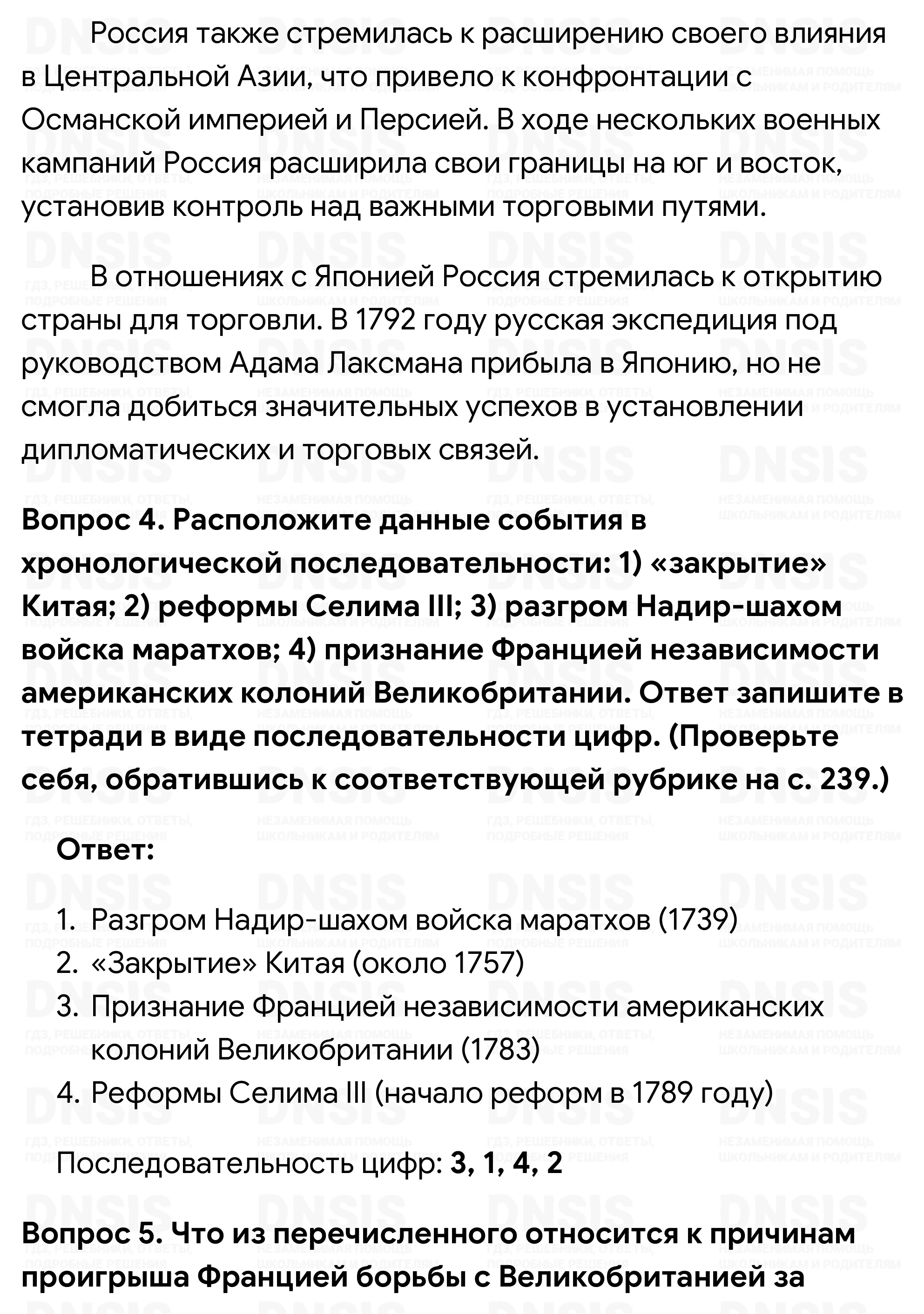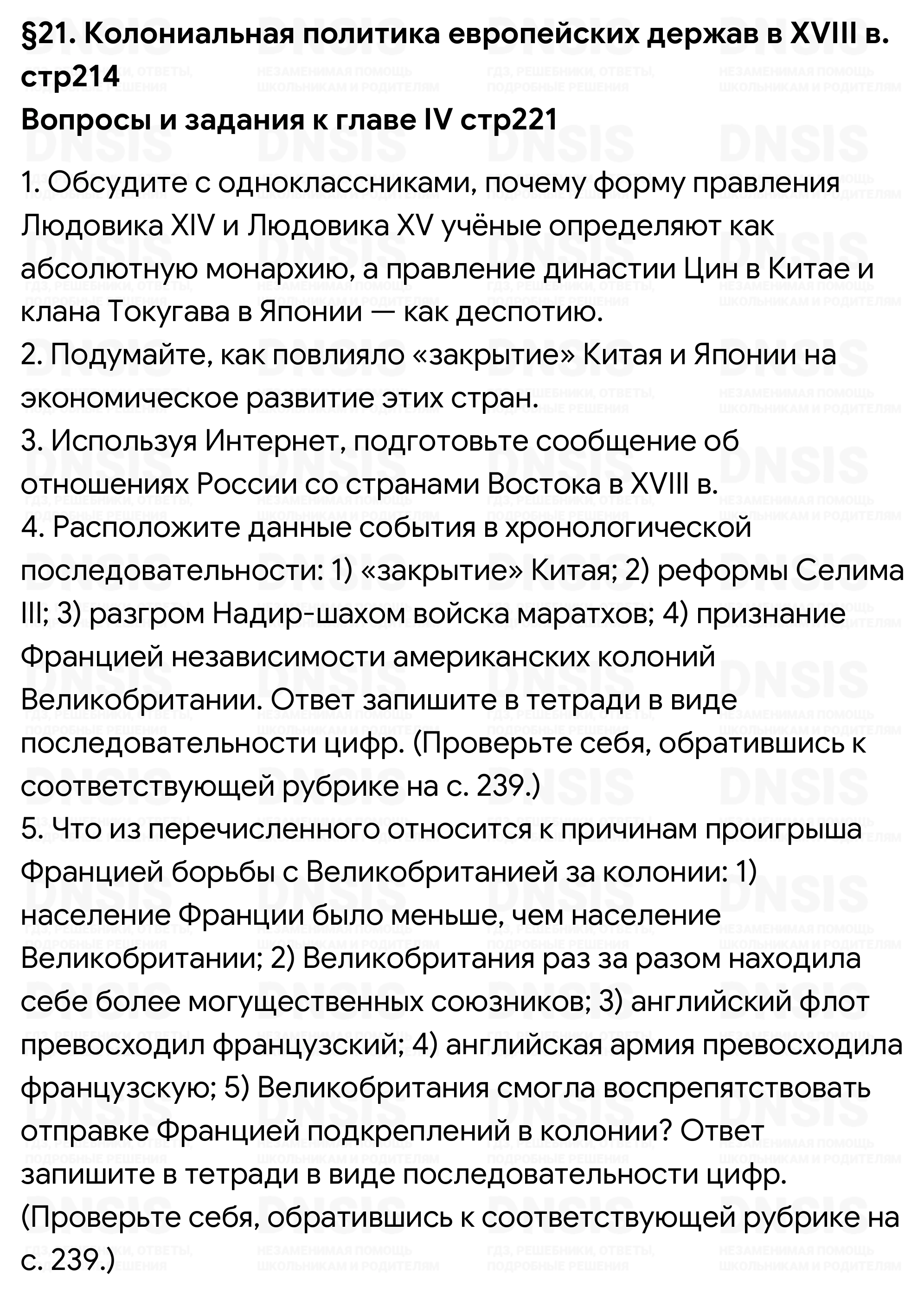 1. Обсудите с одноклассниками, почему форму правления Людовика XIV и Людовика XV учёные определяют как абсолютную монархию, а правление династии Цин в Китае и клана Токугава в Японии — как деспотию. 2. Подумайте, как повлияло «закрытие» Китая и Японии на экономическое развитие этих стран. 3. Используя Интернет, подготовьте сообщение об отношениях России со странами Востока в XVIII в. 4. Расположите данные события в хронологической последовательности: 1) «закрытие» Китая; 2) реформы Селима III; 3) разгром Надир-шахом войска маратхов; 4) признание Францией независимости американских колоний Великобритании. Ответ запишите в тетради в виде последовательности цифр. (Проверьте себя, обратившись к соответствующей рубрике на с. 239.) 5. Что из перечисленного относится к причинам проигрыша Францией борьбы с Великобританией за колонии: 1) население Франции было меньше, чем население Великобритании; 2) Великобритания раз за разом находила себе более могущественных союзников; 3) английский флот превосходил французский; 4) английская армия превосходила французскую; 5) Великобритания смогла воспрепятствовать отправке Францией подкреплений в колонии? Ответ запишите в тетради в виде последовательности цифр. (Проверьте себя, обратившись к соответствующей рубрике на с. 239.)